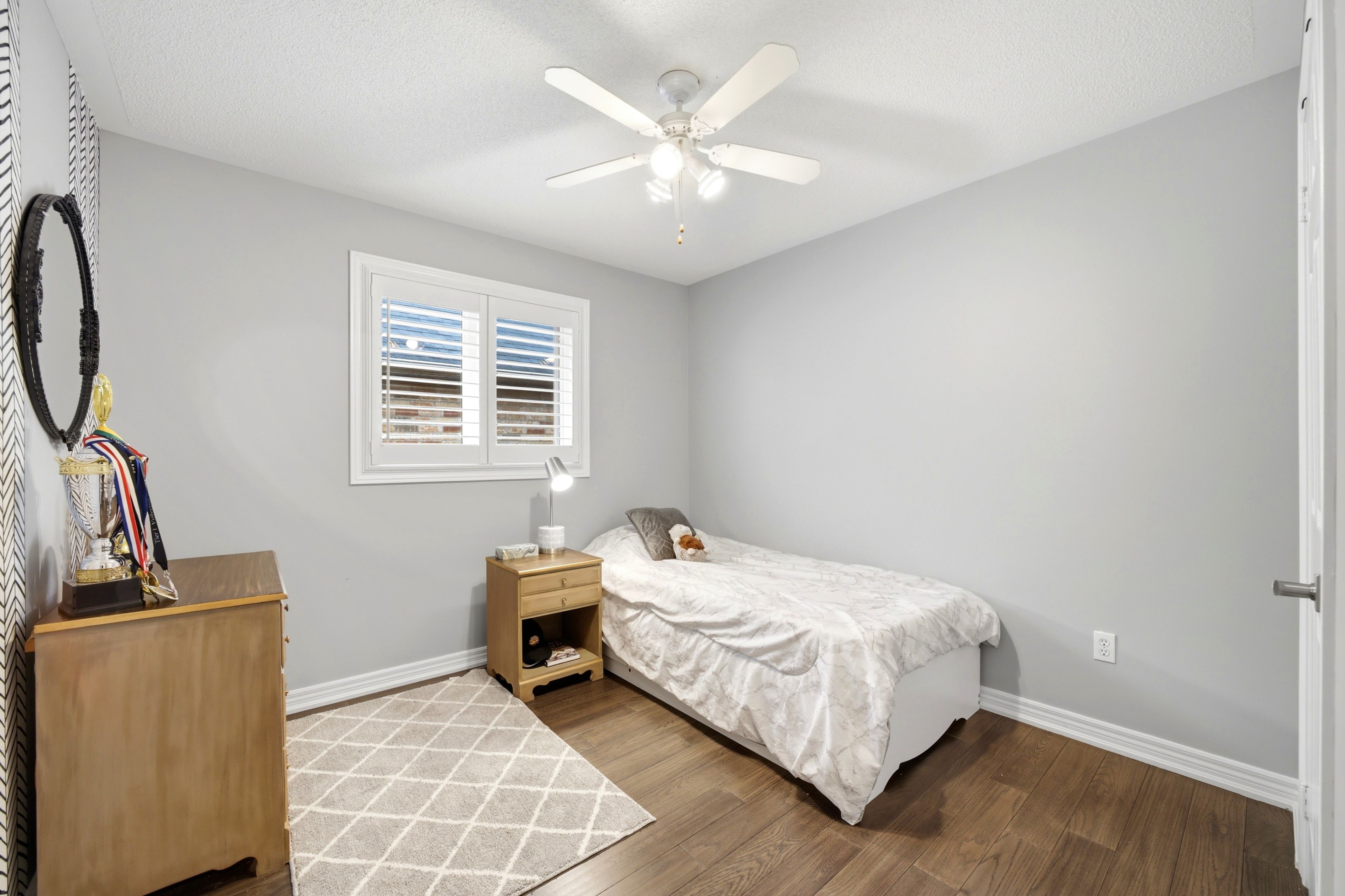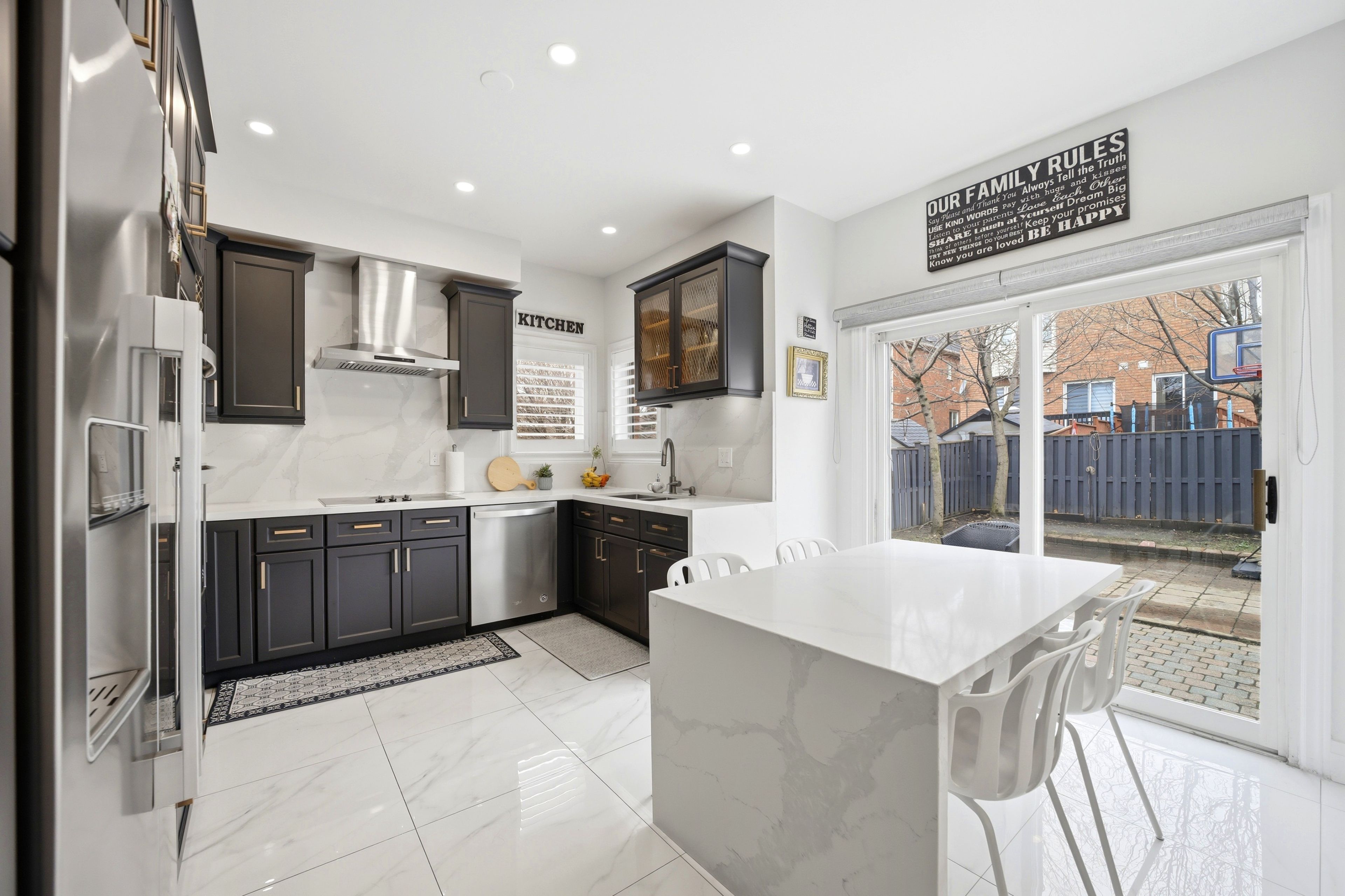 • Private backyard with mature trees for summer relaxation and privacy.