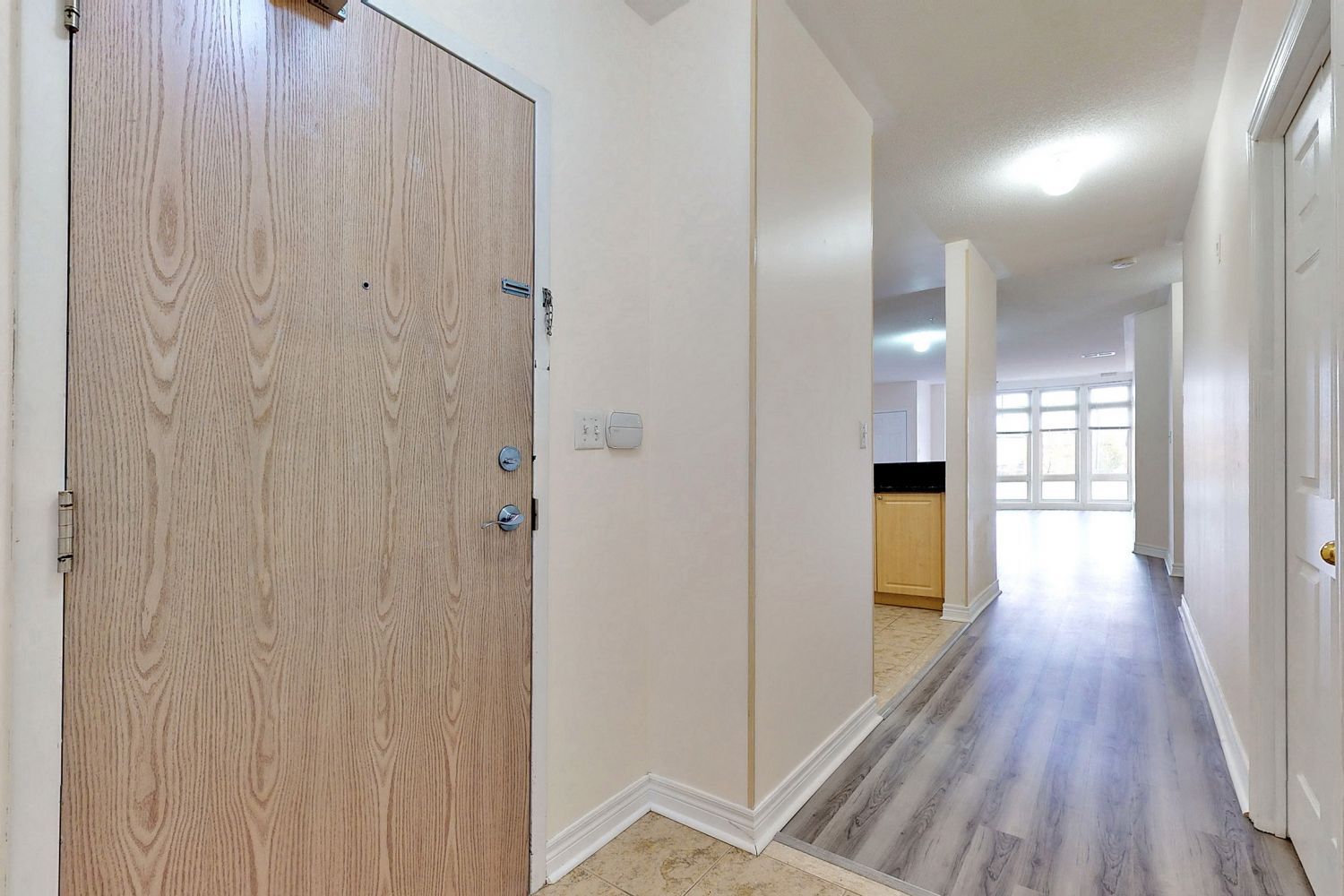 Expansive and inviting, this 1,195 sq. Ft. Ground-level suite blends functionality with comfort in a well-managed markham condo community. The thoughtfully designed floor plan features a grand open-concept living/dining area stretching over 27 feet in length, ideal for both everyday living and entertaining. The kitchen offers generous counter space, a raised breakfast bar, and direct sightlines to the living space-perfect for casual meals and connection. Both bedrooms are well-proportioned and set apart for privacy. The spacious primary bedroom features a walk-in closet, while the second bedroom is ideal for guests or a quiet home office. Additional highlights include a dedicated foyer, full laundry room with storage, and a four-piece bath. The unit enjoys the convenience of a private ground-level entrance, central air, and an owned locker and parking space. Updated flooring, oversized windows, and east-facing exposure create a bright, uplifting ambiance throughout. Situated just minutes from transit, shopping, dining, and community amenities, this condo offers size, layout, and location in one convenient package-ideal for those seeking a low-maintenance lifestyle without sacrificing space.