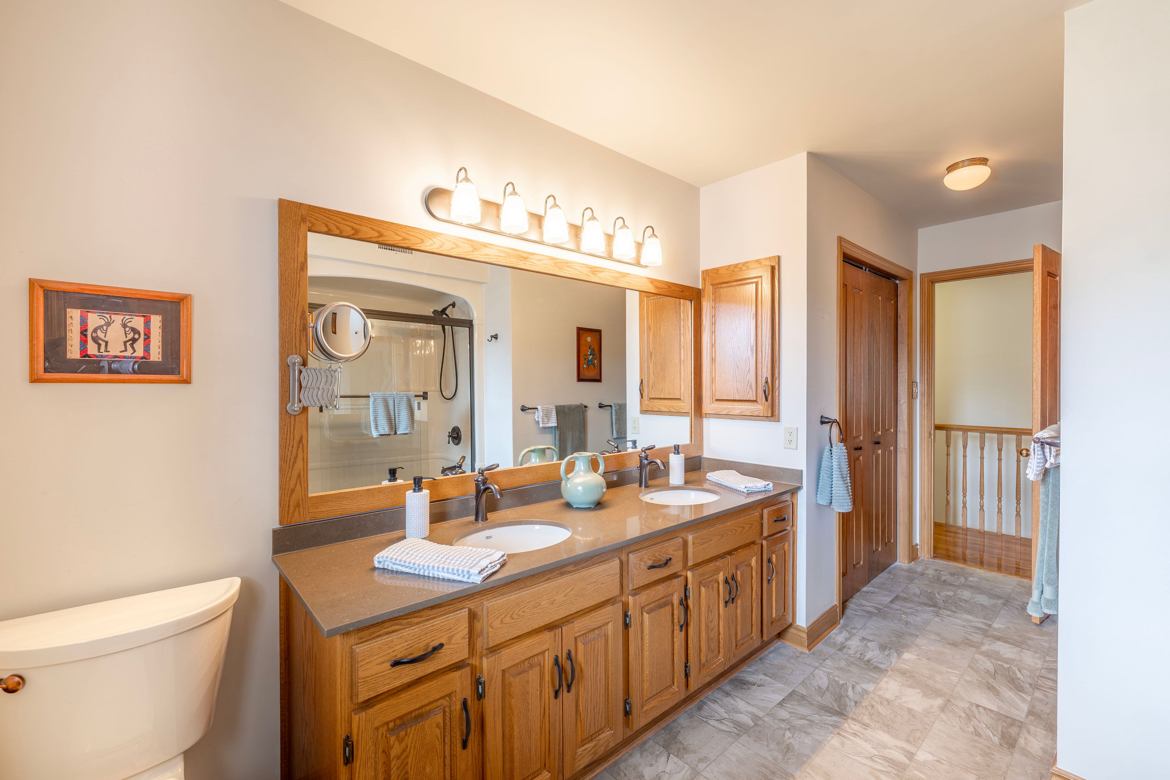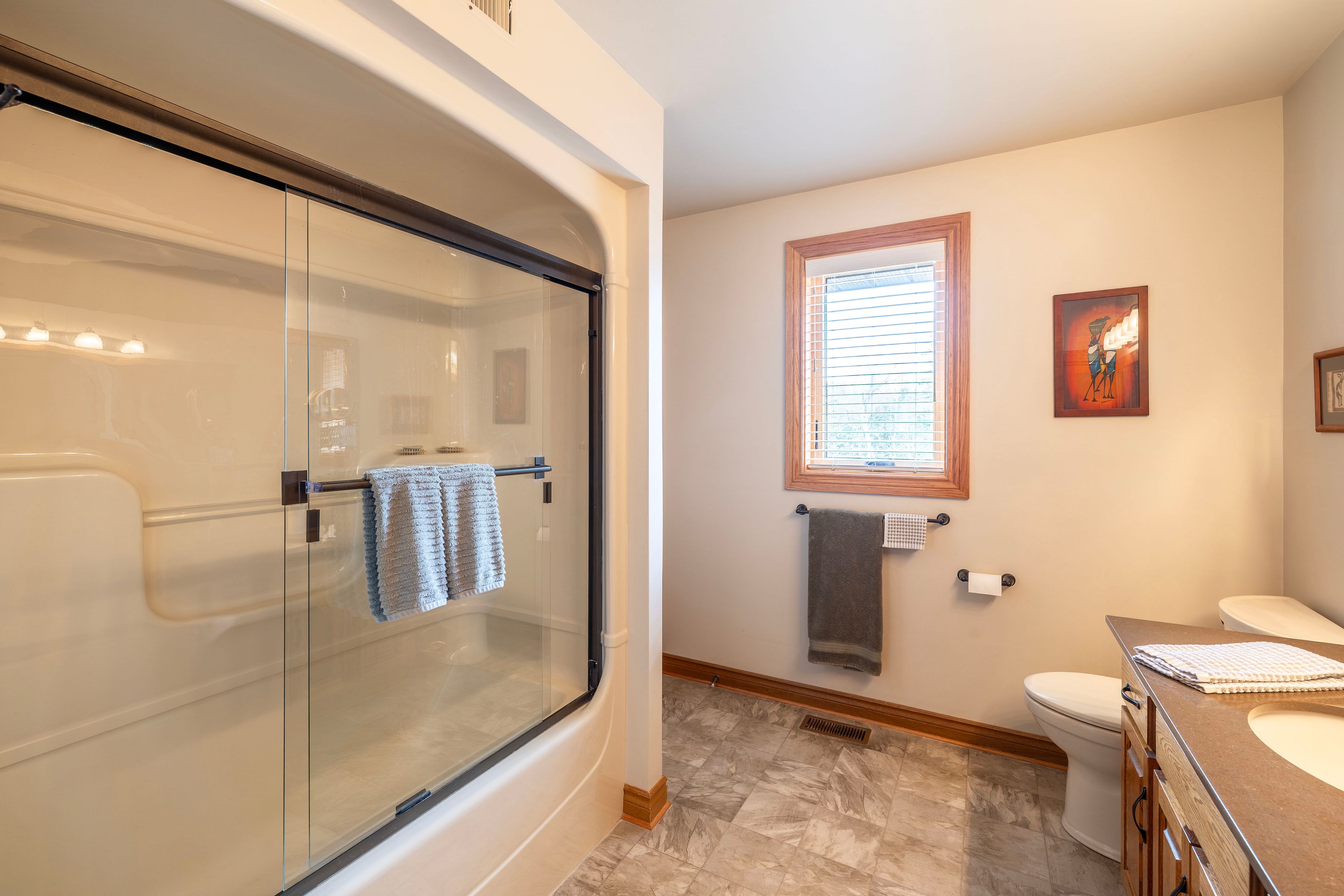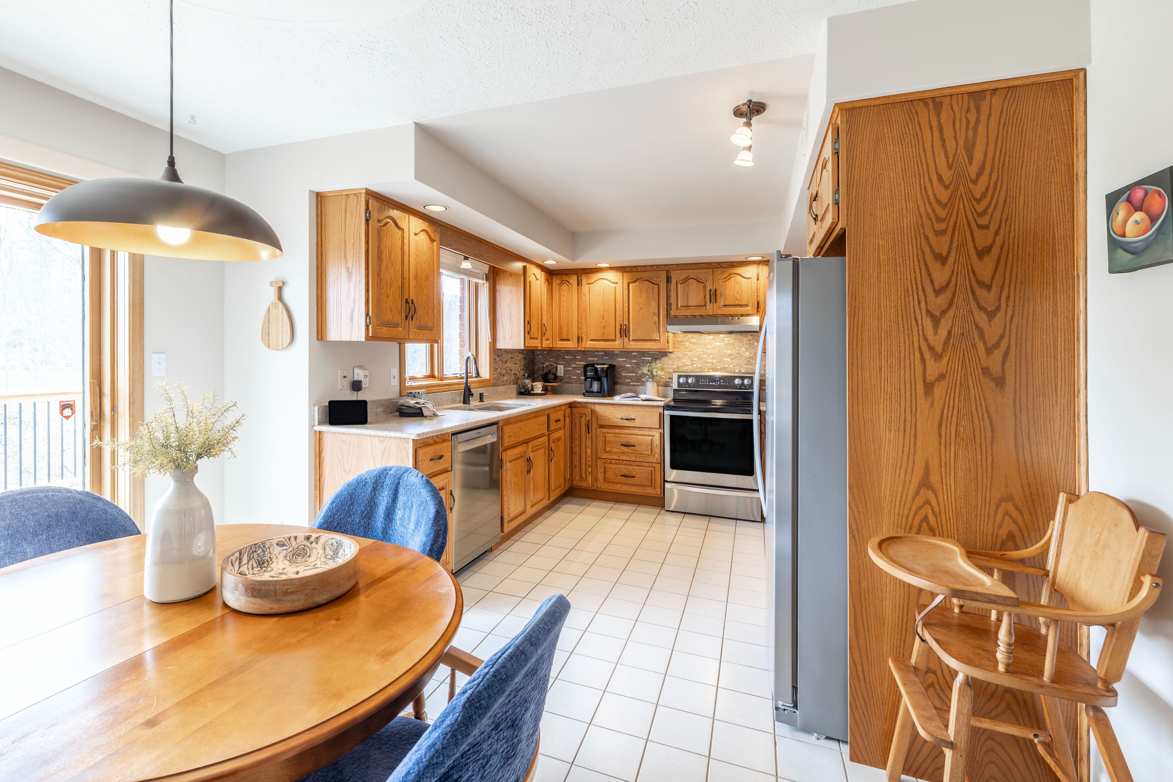 • Sun-filled kitchen with quartz countertops and stainless steel appliances.