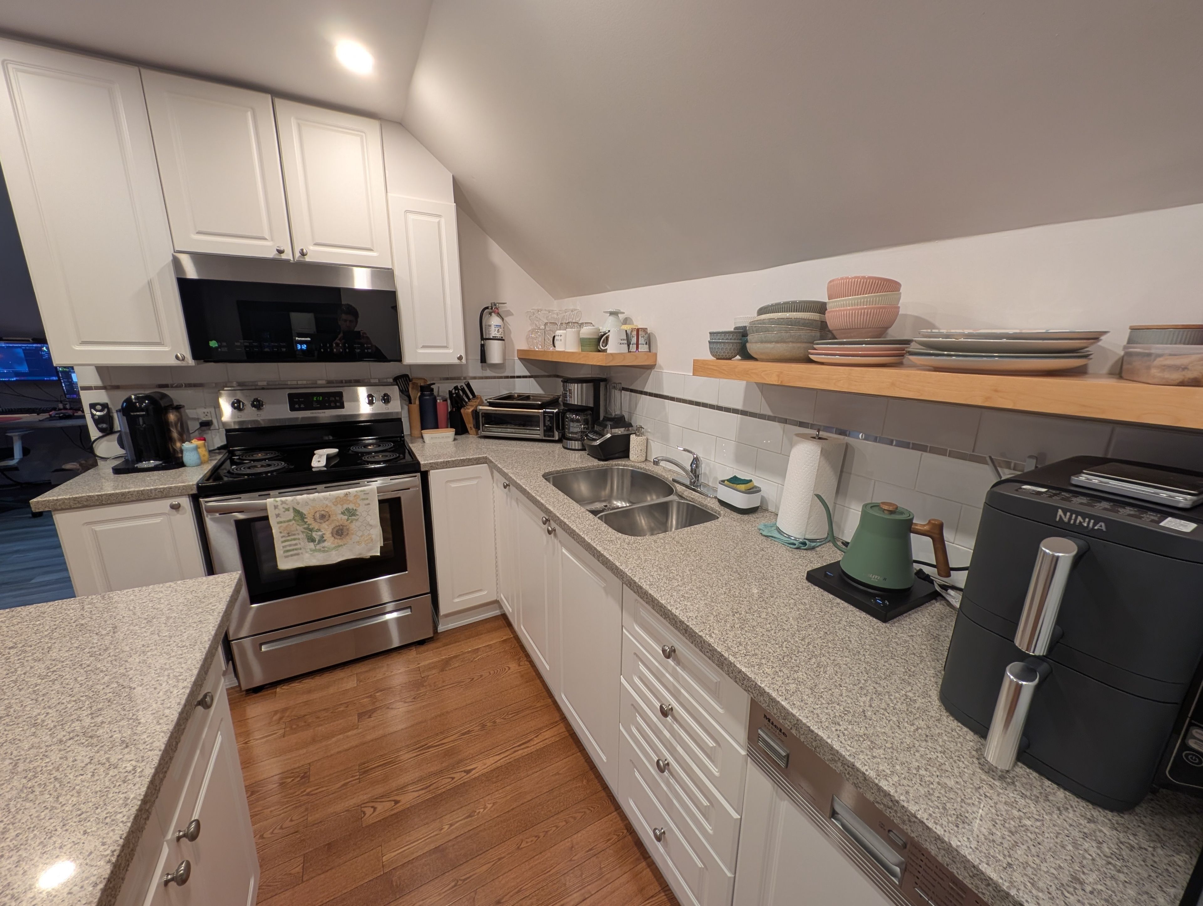 • Modern kitchen features a center island and quartz countertops.