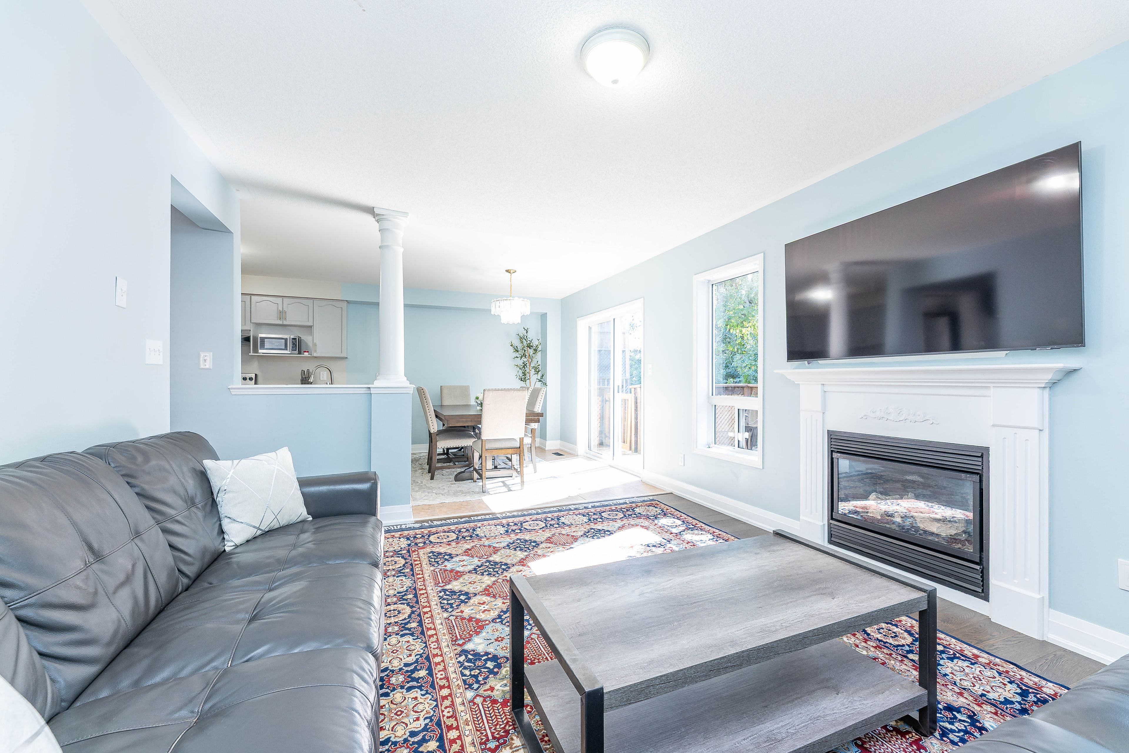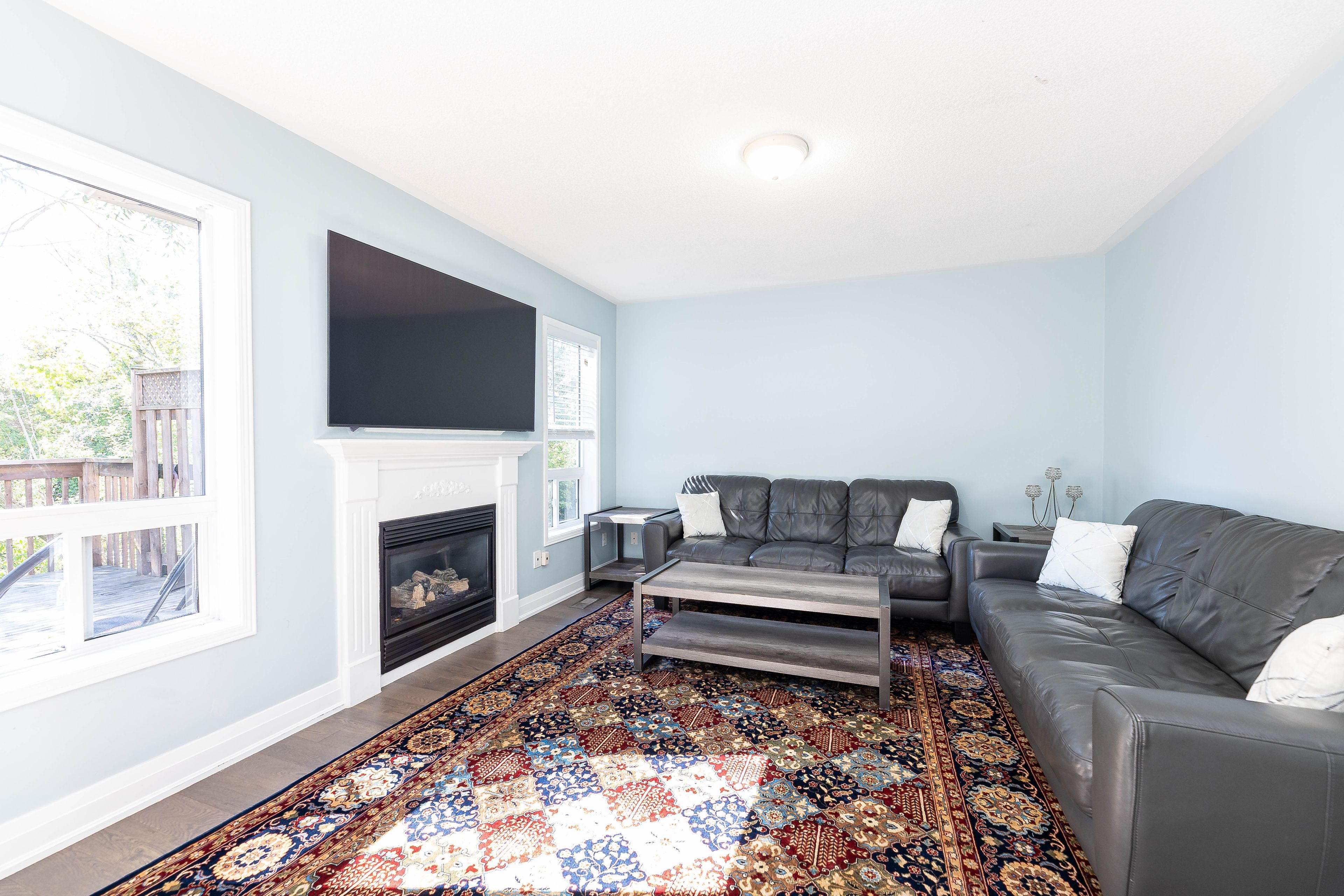 • Cozy family room with fireplace overlooking the backyard and ravine.