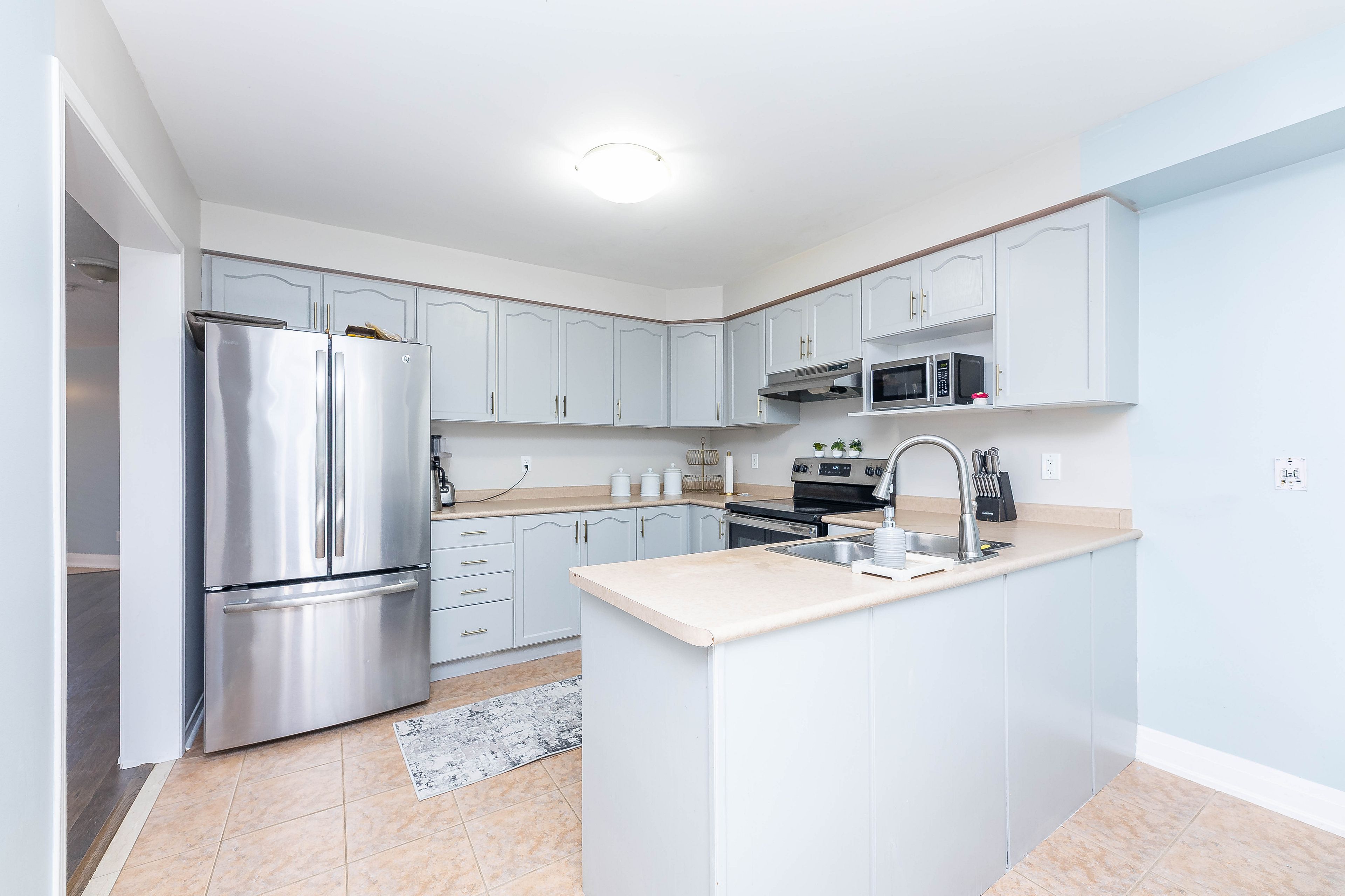 • Modern kitchen with stainless steel appliances and custom cabinets.