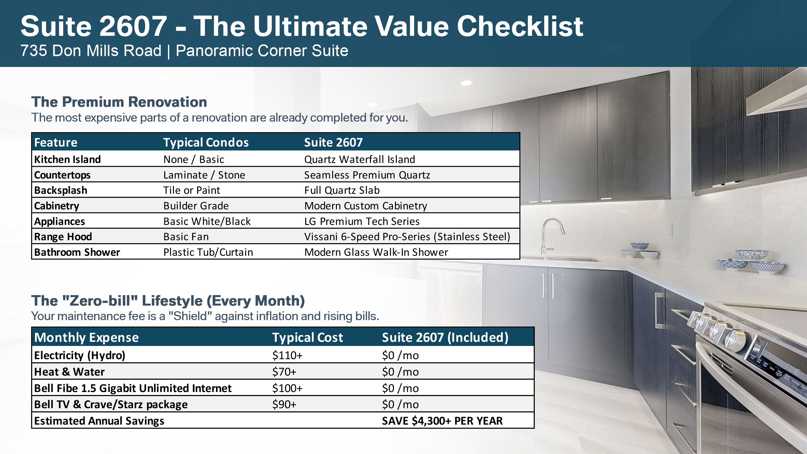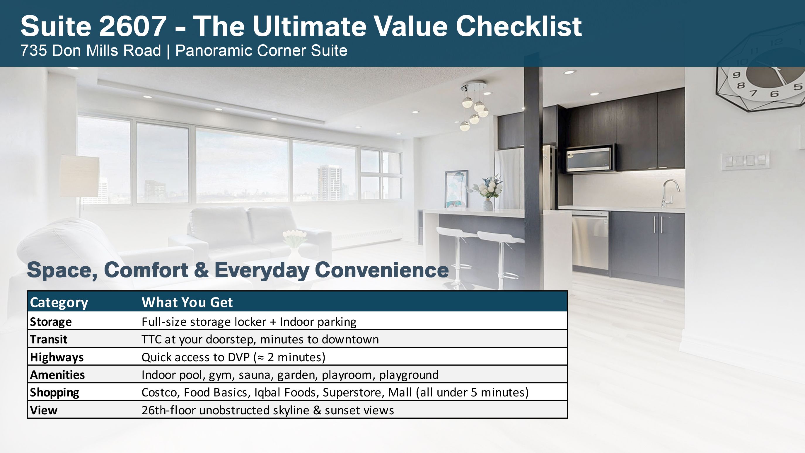 Welcome to suite 2607 at 735 don mills rd - a spacious, fully renovated corner unit offering exceptional value in today's market. With over 950 sq ft of living space, this home features a rare layout with generous room sizes and built-in cost savings that are increasingly hard to find. Located on the 26th floor, this bright unit offers unobstructed eastern skyline views, large windows, and abundant natural light throughout the day. The thoughtfully designed open-concept layout is ideal for both everyday living and entertaining. The modern kitchen has been fully renovated with quartz countertops, quartz backsplash, a waterfall island, new cabinetry, and premium lg stainless steel appliances, complemented by pot lights and updated fixtures. The bathroom features a sleek, contemporary glass stand-up shower. This well-maintained, non-smoking home includes 2 generous bedrooms, 1 underground parking space, and a large, full-sized storage locker. A major highlight: all utilities are included in the maintenance fees - heat, water, electricity, plus premium bell fibe 1. 5 gigabit unlimited internet, tv, and crave/starz - offering predictable monthly costs and meaningful savings compared to many condo buildings. Residents also enjoy access to premium amenities including an indoor pool, gym, sauna, and garden. Unbeatable location with ttc at your doorstep, quick access to dvp and hwy 401, minutes to downtown, and close to costco, east york town centre, parks, schools, libraries, banks, restaurants, and the upcoming lrt. An ideal opportunity for first-time buyers or investors seeking space, convenience, and long-term value in a well-established building. Excellent layout with premium renovations and truly hard to replace at this size and price point.