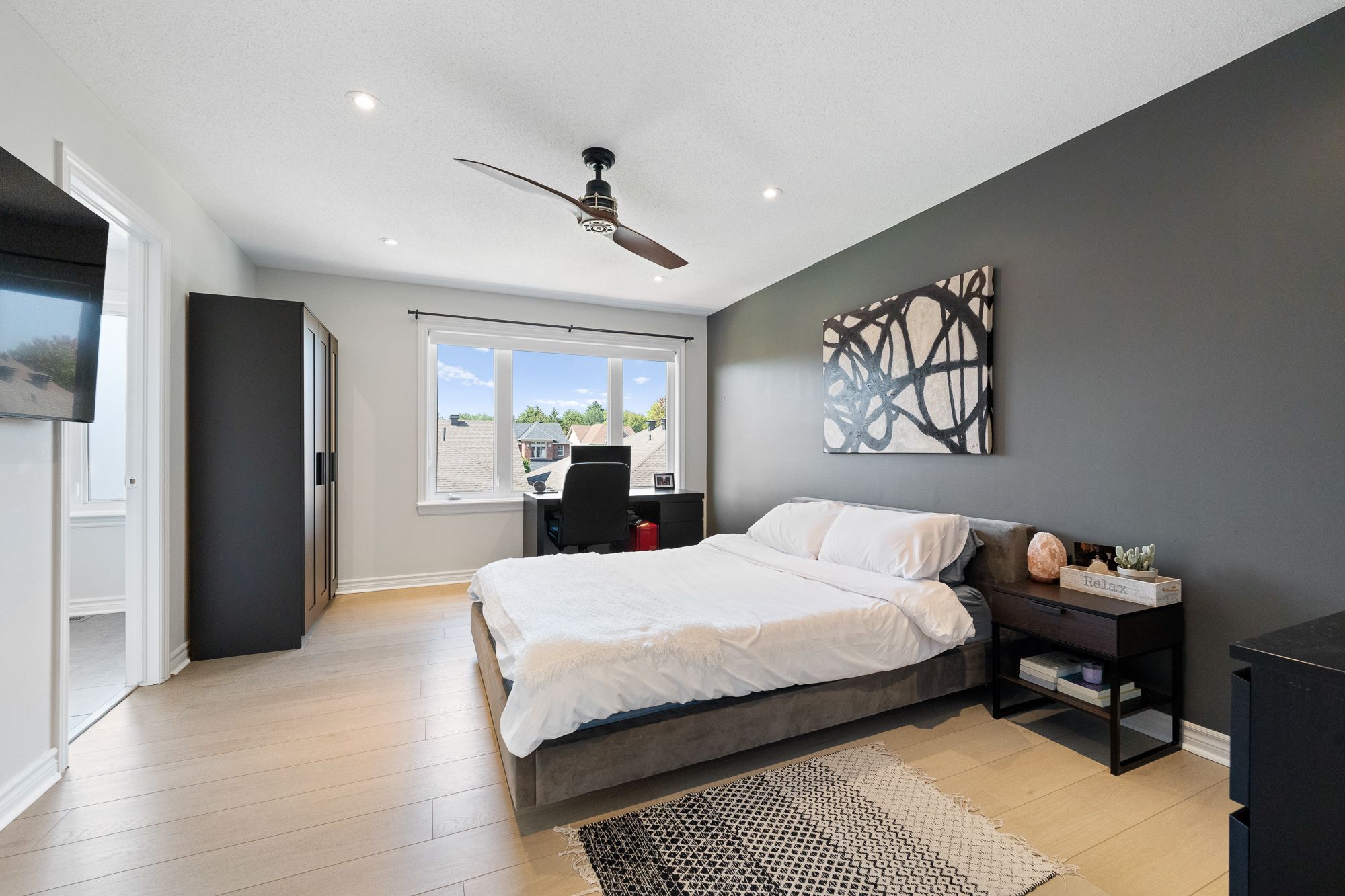 • Bright living room with high ceilings and hardwood flooring throughout.