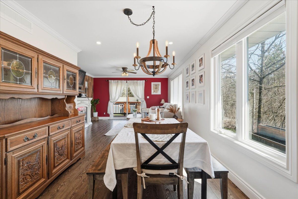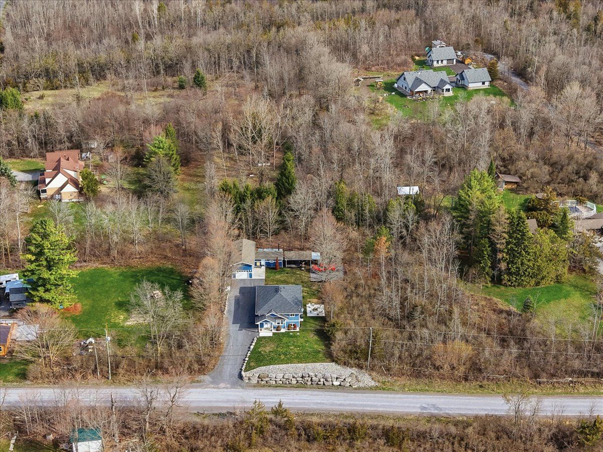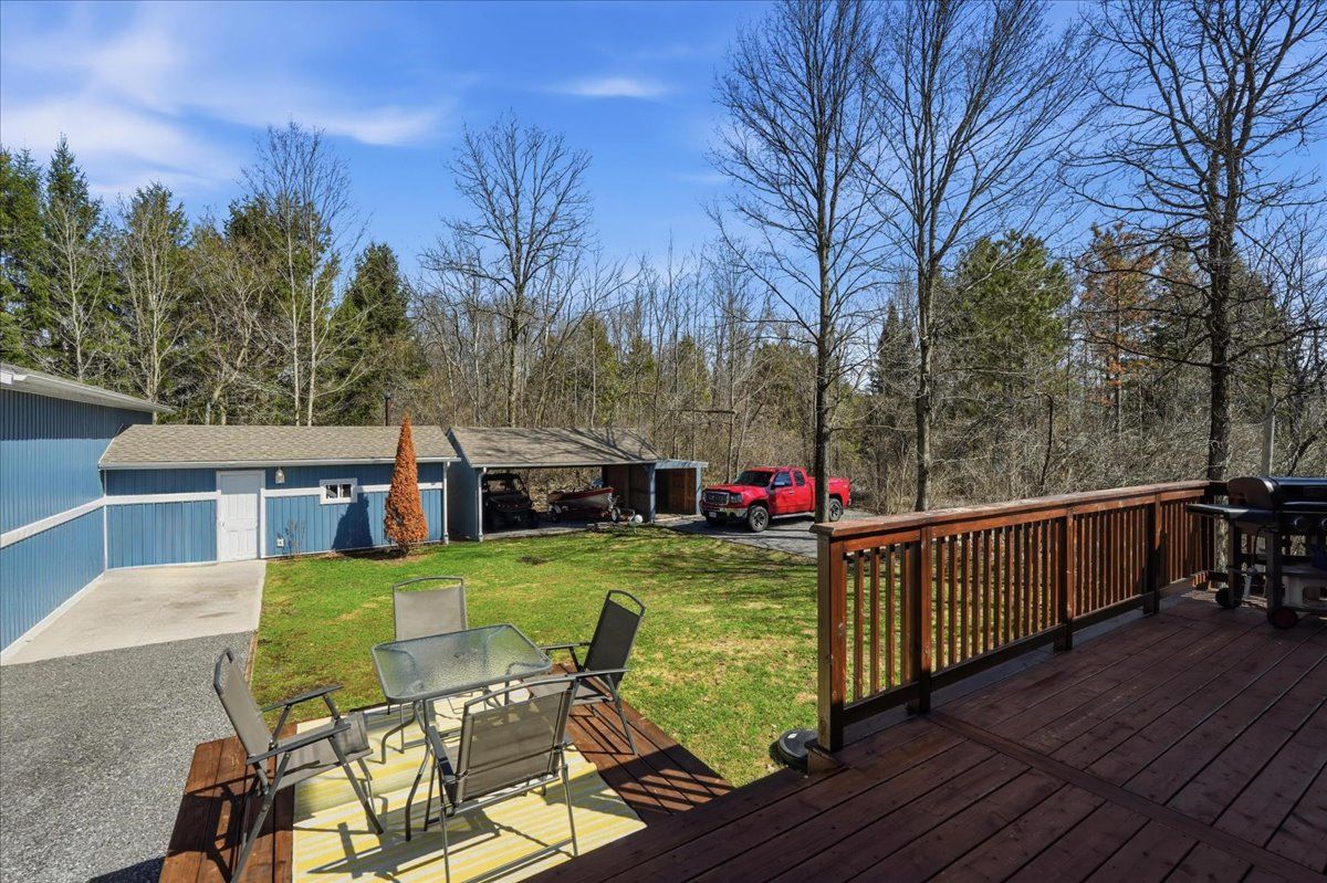 Immaculate raised bungalow set in a peaceful rural setting, offering privacy and a truly impressive shop for over 1,000 square feet. This inviting home features an open concept main floor with a bright kitchen, dining, and living area, filled with natural light from large windows. The kitchen offers ample cabinetry and a spacious island, perfect for everyday living and entertaining. Patio doors from the living room lead to a large deck with rough-in electrical for a hot tub that overlooks the backyard with a fire pit area - an ideal place to relax and unwind under the stairs on warm summer evenings. The main floor includes two bedrooms and a 4 piece bathroom, along with a spacious foyer and tasteful decor throughout. The lower level is finished with a cozy rec room, an additional bedroom, laundry area, and plenty of storage space. The heated detached shop with 13 ft high ceilings is a standout feature-ideal for storing recreational vehicles, working on hobbies, or creating your own workshop space. It offers welding plugs, rough-in electrical for a hoist, and a large electric heater. With easy access to the 401, belleville and napanee, this turnkey and well-maintained property with excellent curb appeal and landscaping is ready and waiting for you.