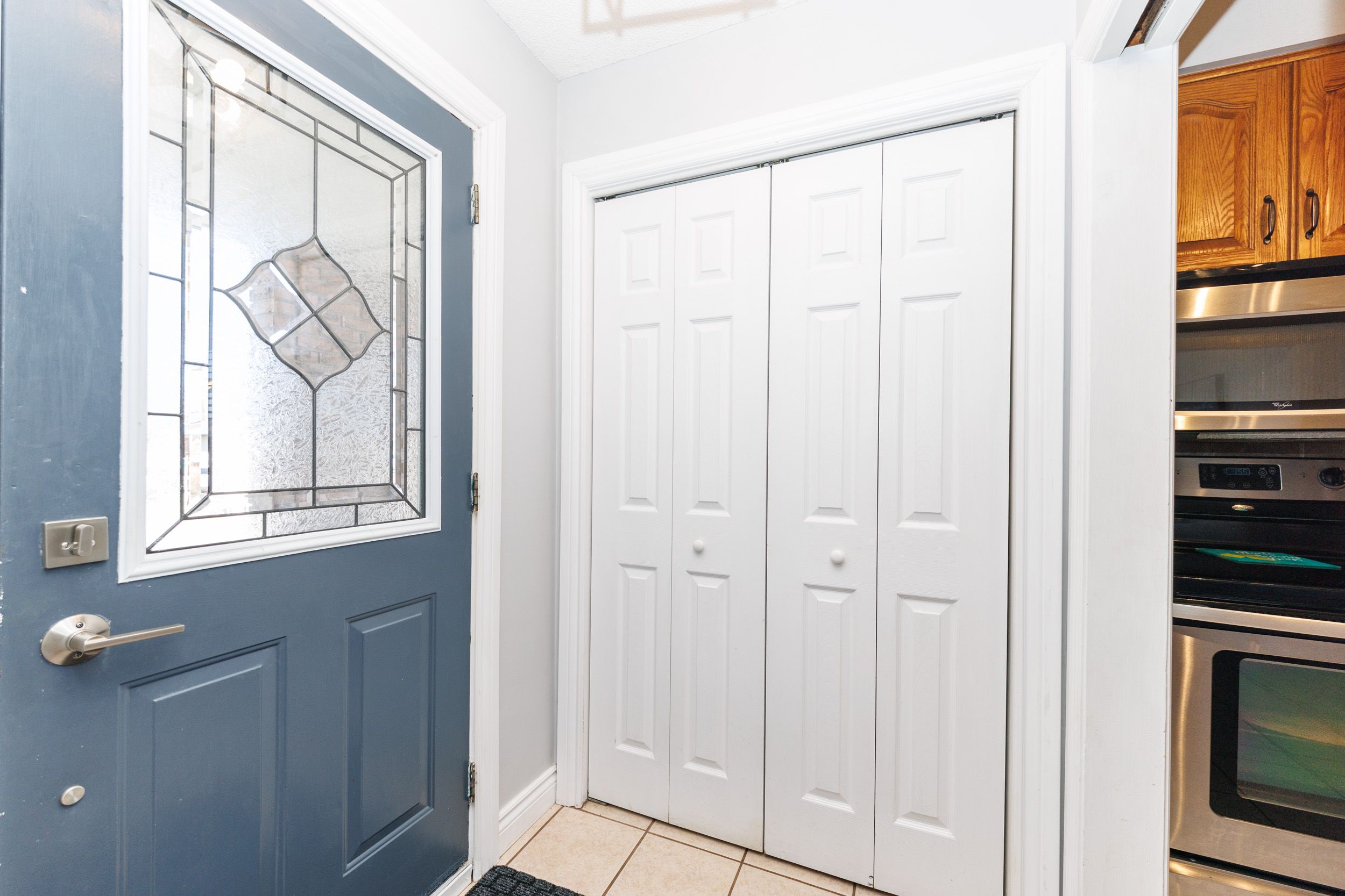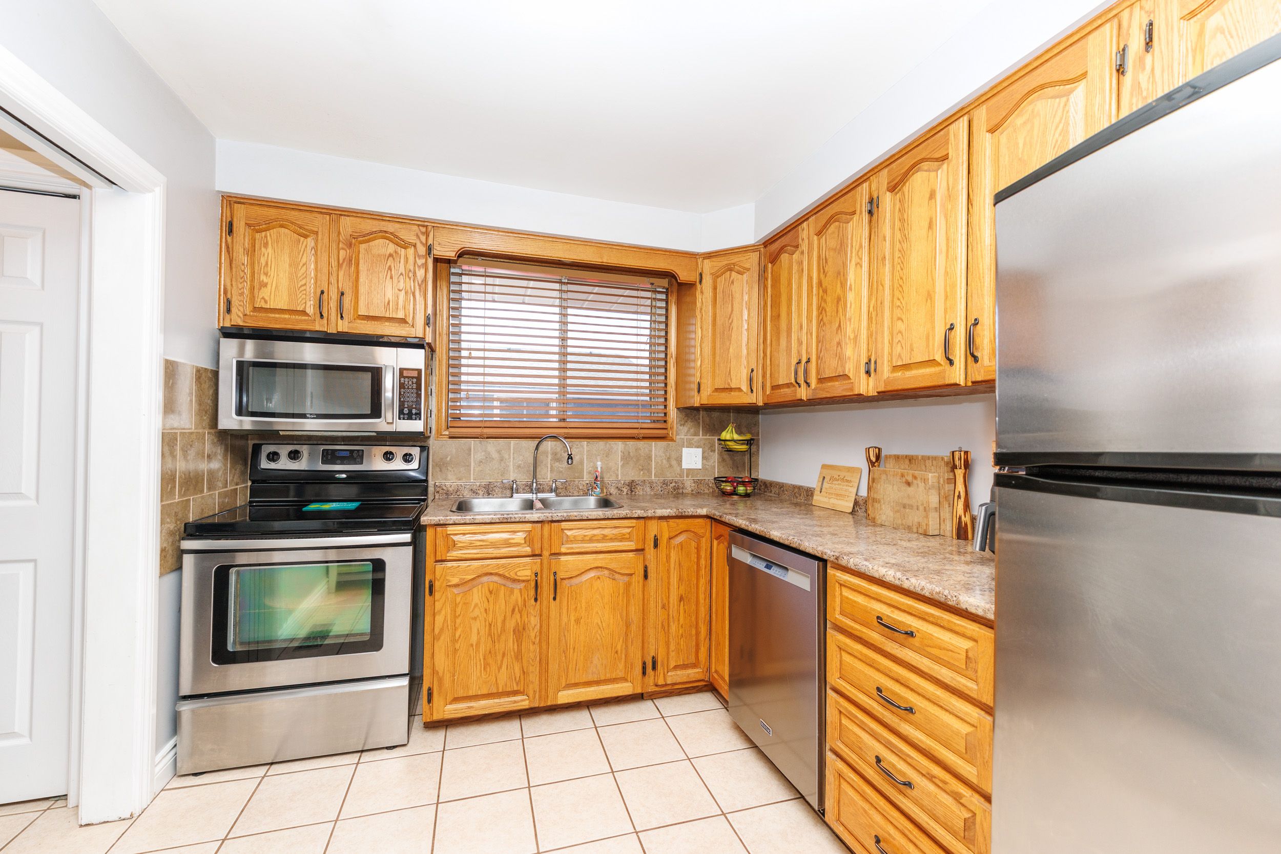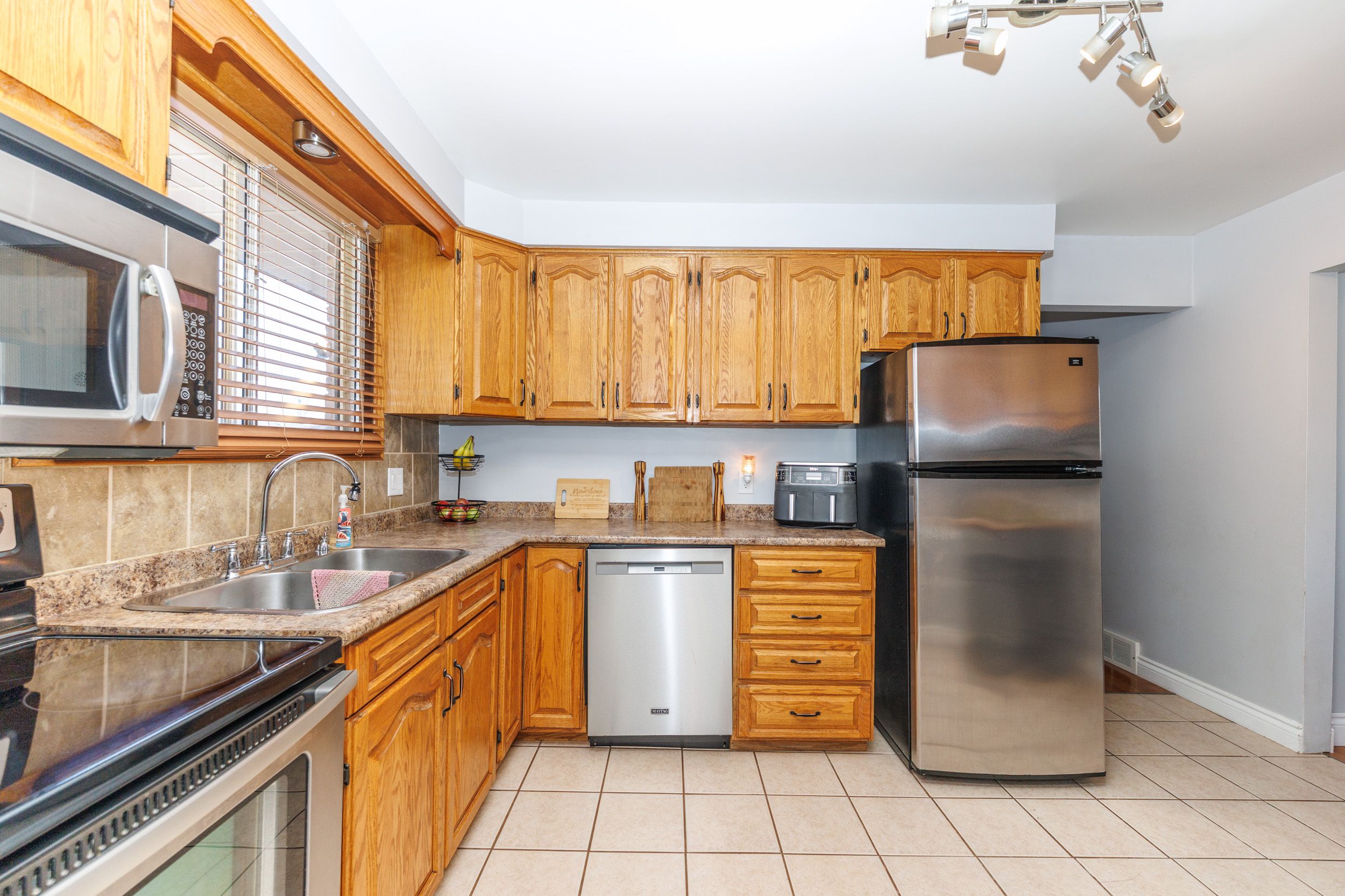 • Spacious eat-in kitchen with natural wood cupboards, great for home chefs.