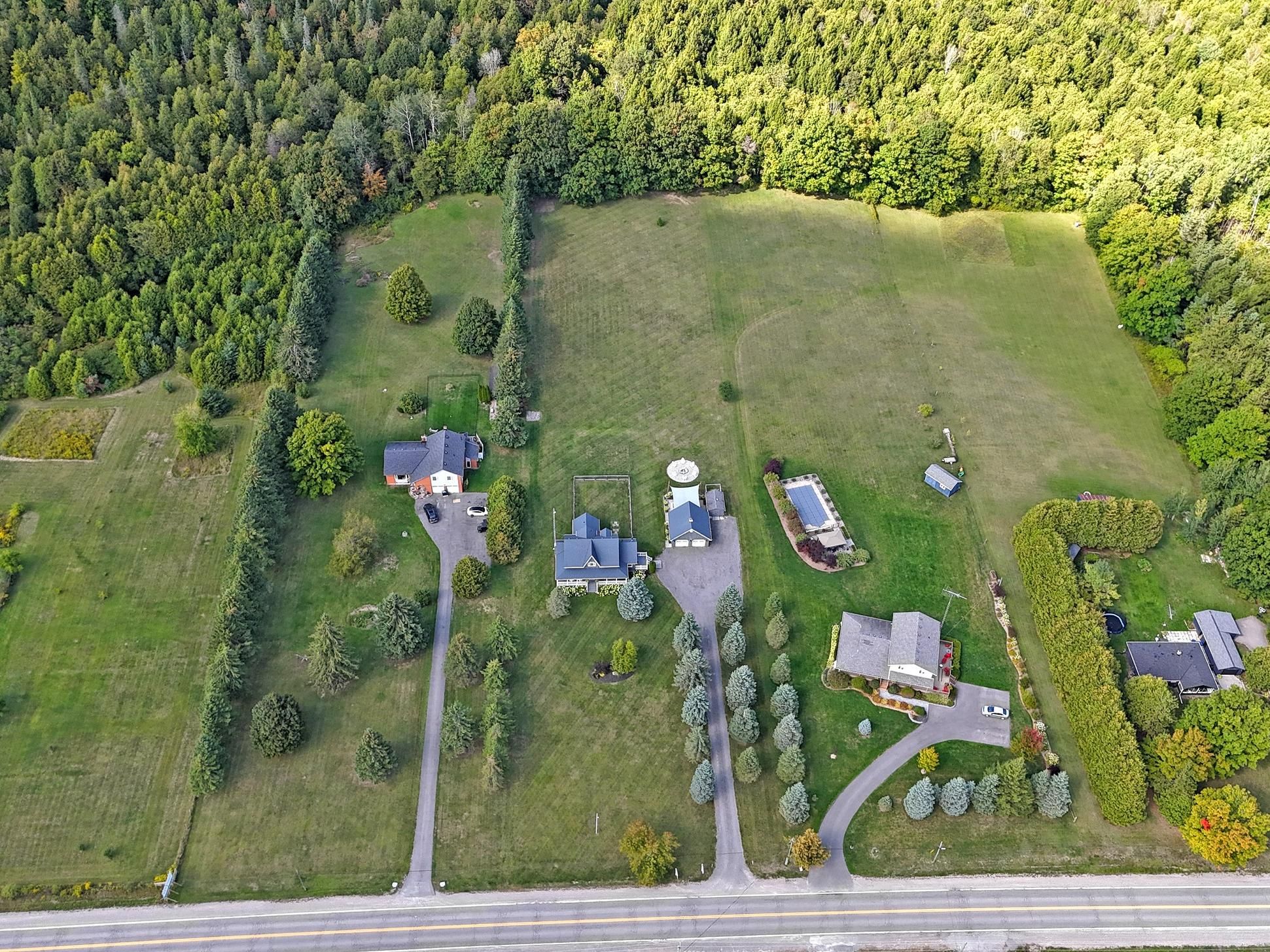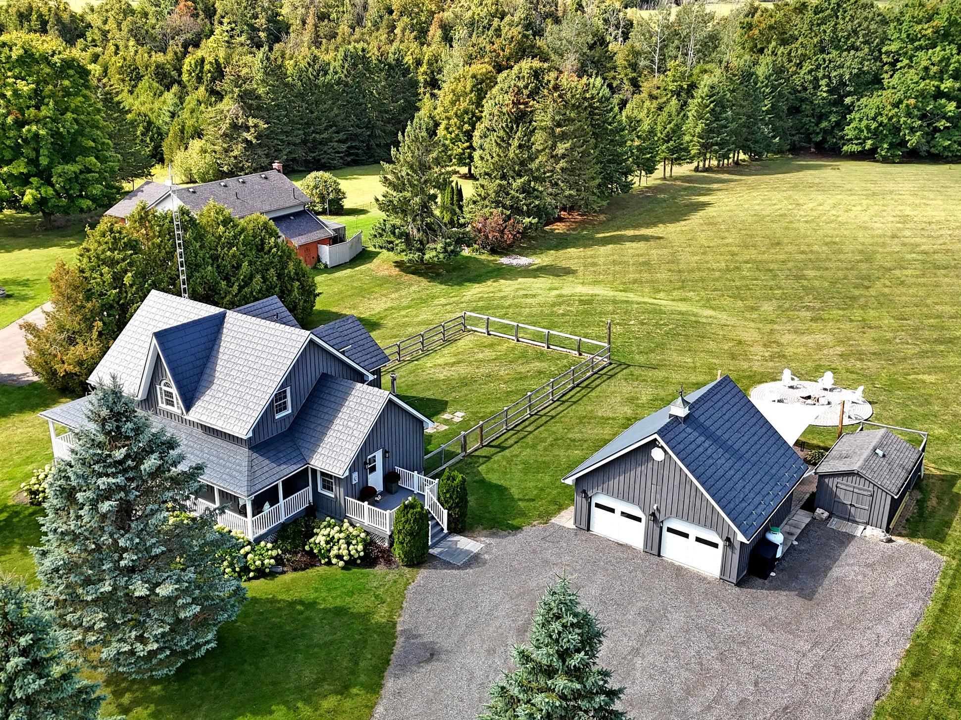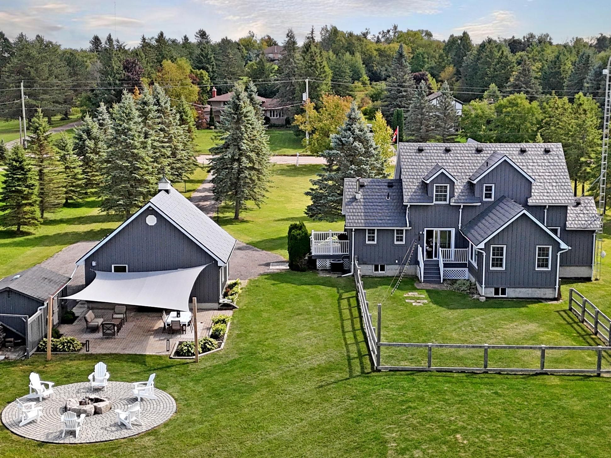 4+1 bedroom modern country home that sits on 2. 31 acres of beautifully landscaped grounds, surrounded by rolling meadows, woodlands, and the serene countryside of rural uxbridge. Boasting exceptional curb appeal, a long lamp-lit driveway leads to an elegant board and batten exterior, a welcoming front porch, and vibrant floral gardens during the warmer months. Inside, the luxury home features a shiplap-accented foyer which opens to a refined sunken family room with hardwood flooring, fireplace, and an 11' vaulted ceiling. The elegant spacious kitchen features stainless steel appliances, granite countertops, a mosaic stone backsplash, under-cabinet lighting, a walk-in pantry, and a breakfast area with backyard access. A well-appointed mudroom provides a side entrance and direct access to the finished basement, which includes a recreation area with dry bar, fifth bedroom, laundry, and abundant storage. The main floor primary suite offers a walk-in closet and a 3-piece ensuite with a marble-topped vanity and heated floors, while the second floor features three generous bedrooms and a 4-piece main bathroom with a stone sink. Additional highlights include a heated 600sqft detached garage, a covered stone patio, fire pit surrounded by interlock stone, fenced yard, and garden shed. Conveniently located just a short drive from a local cider brewery, bison farm, fresh farm produce, and the town of uxbridge for everyday essentials. This home seamlessly blends elegance and lifestyle, offering refined living amongst the serenity of the countryside.