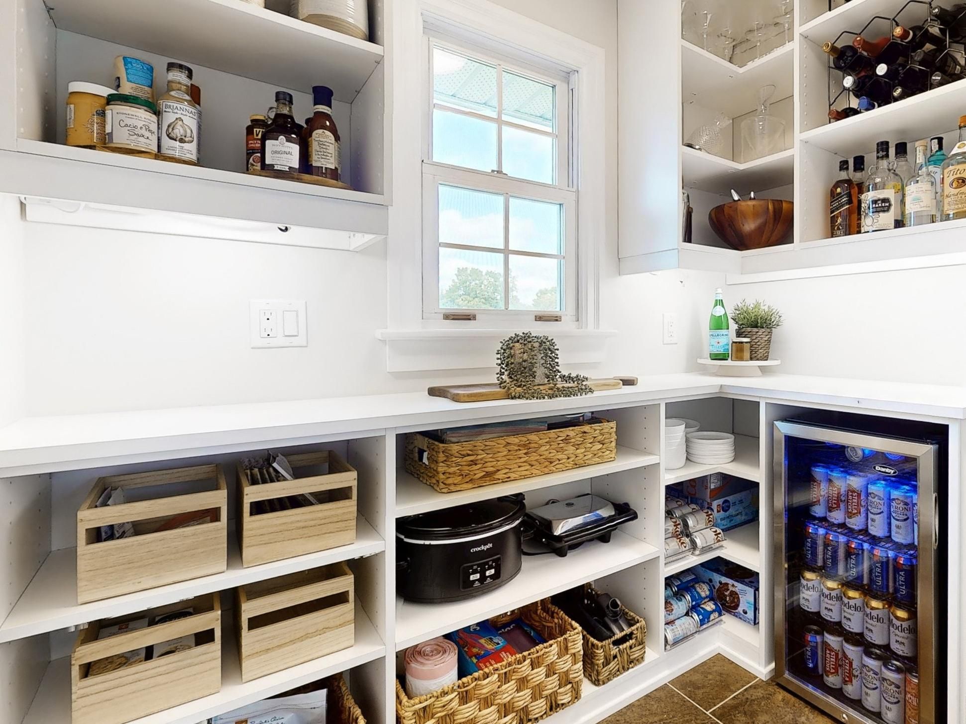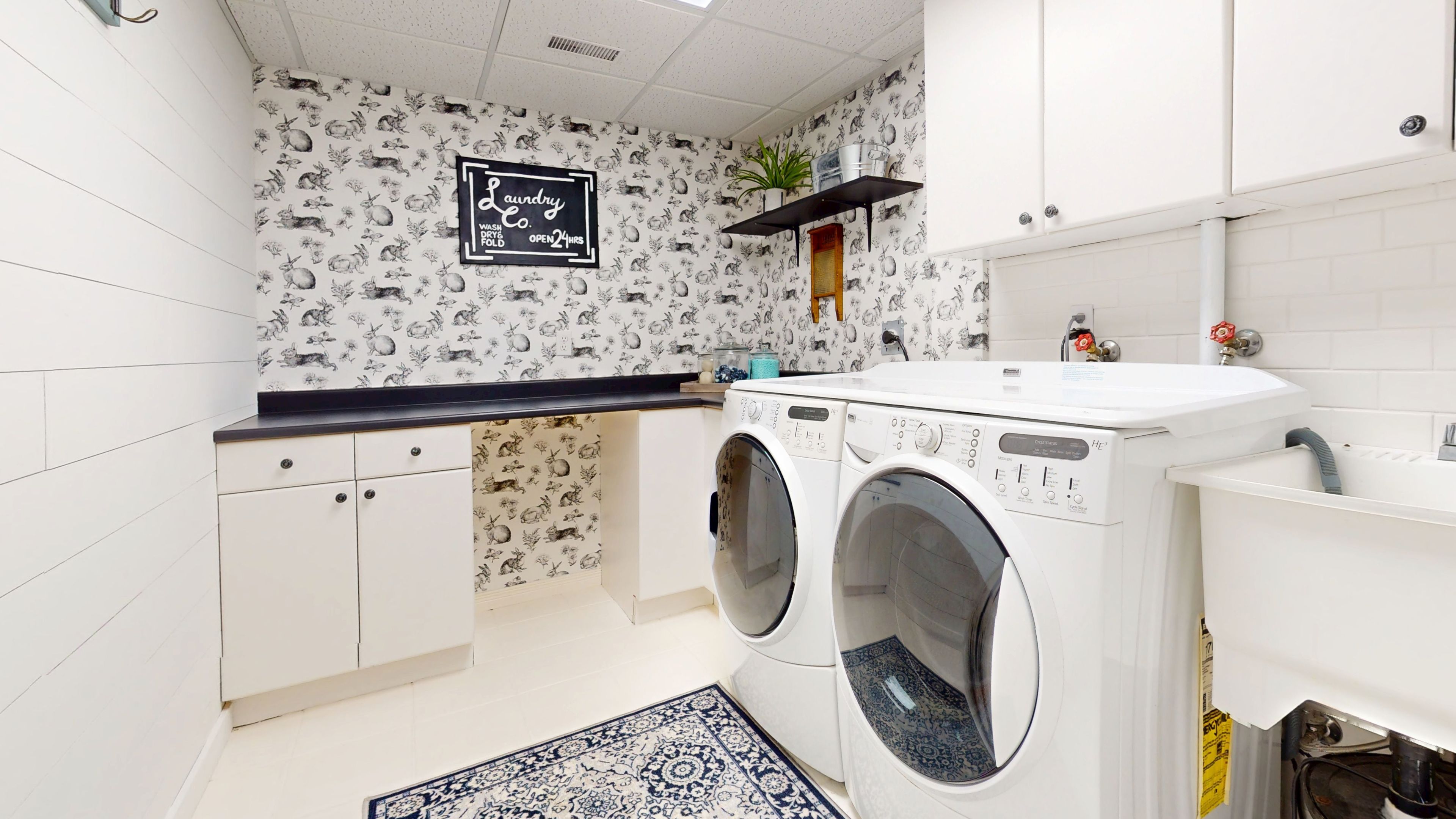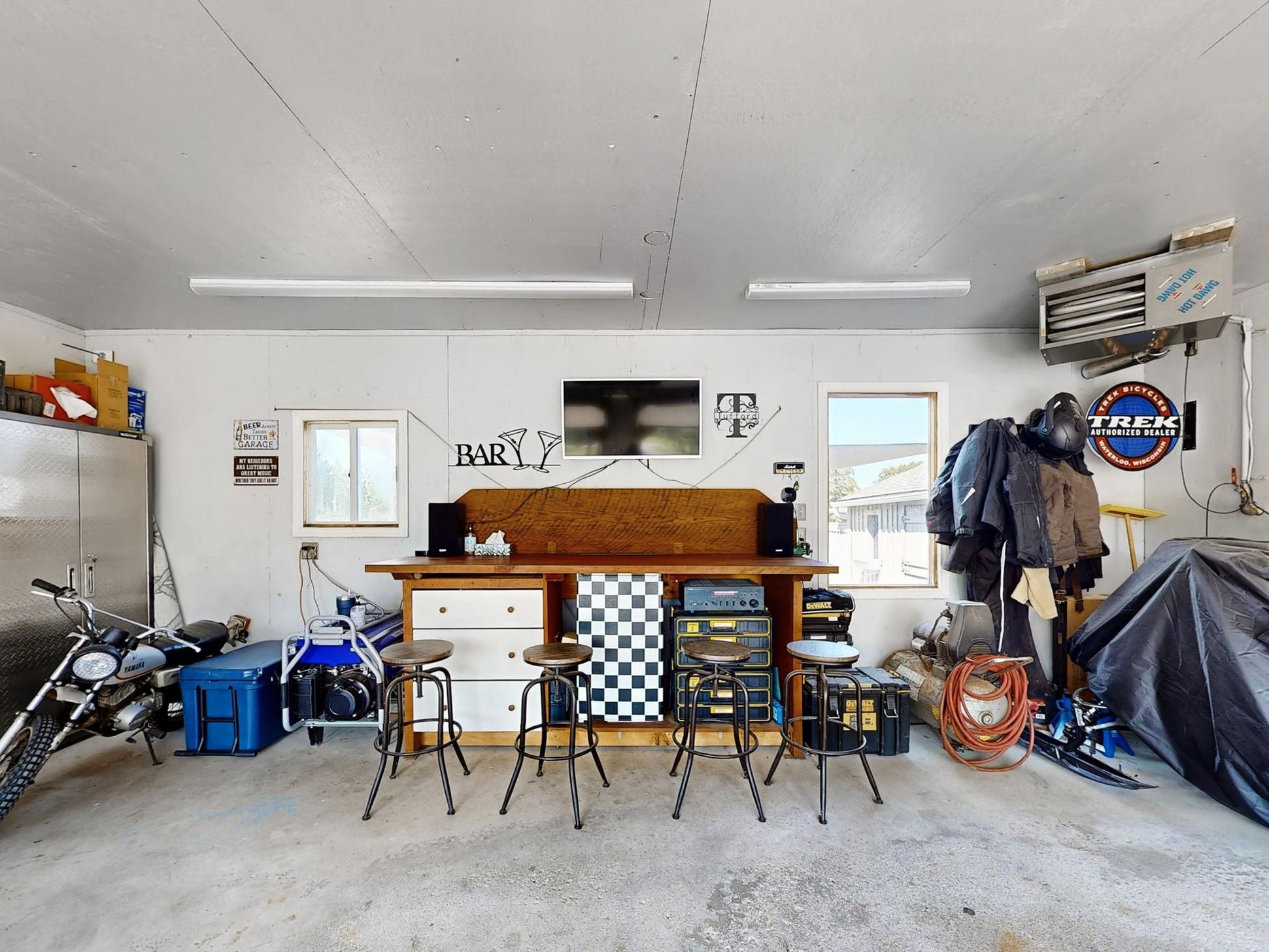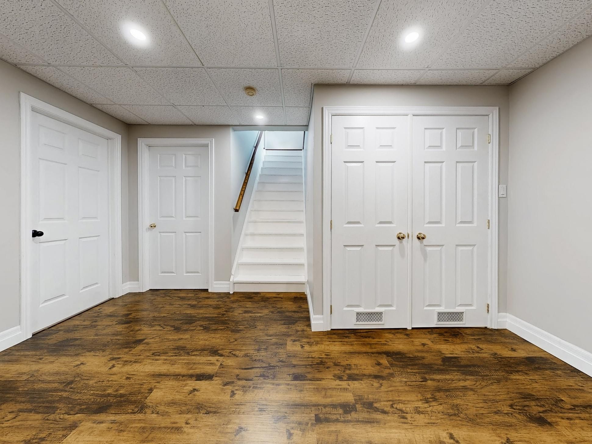 • Finished basement includes recreation area, extra bedroom, and storage.