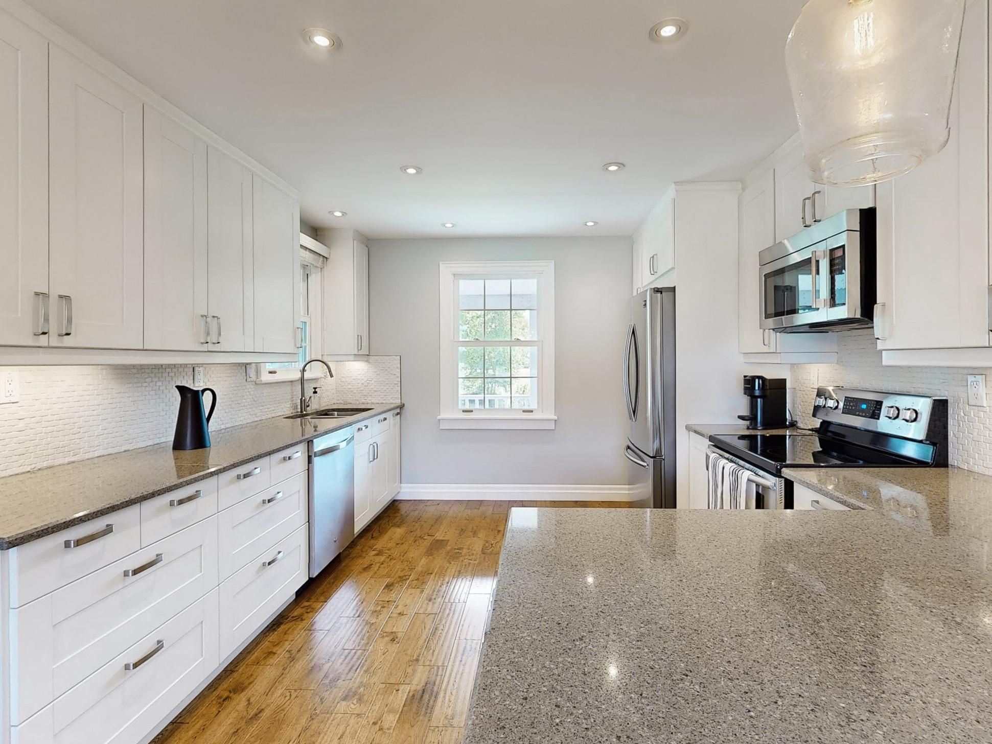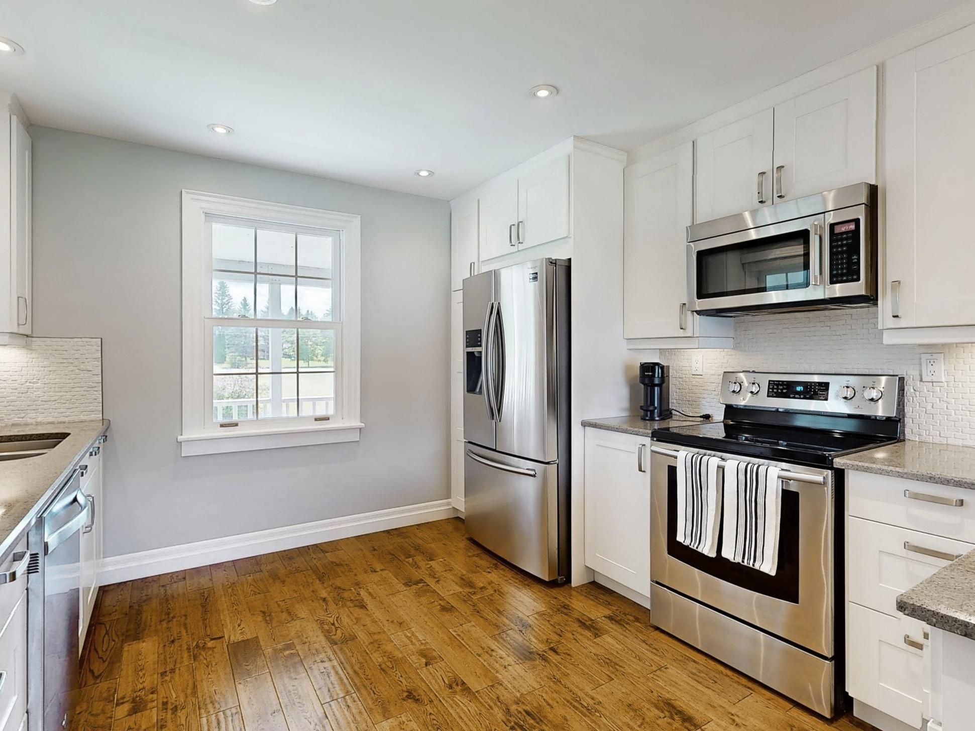 • Elegant kitchen with stainless steel appliances and granite countertops.