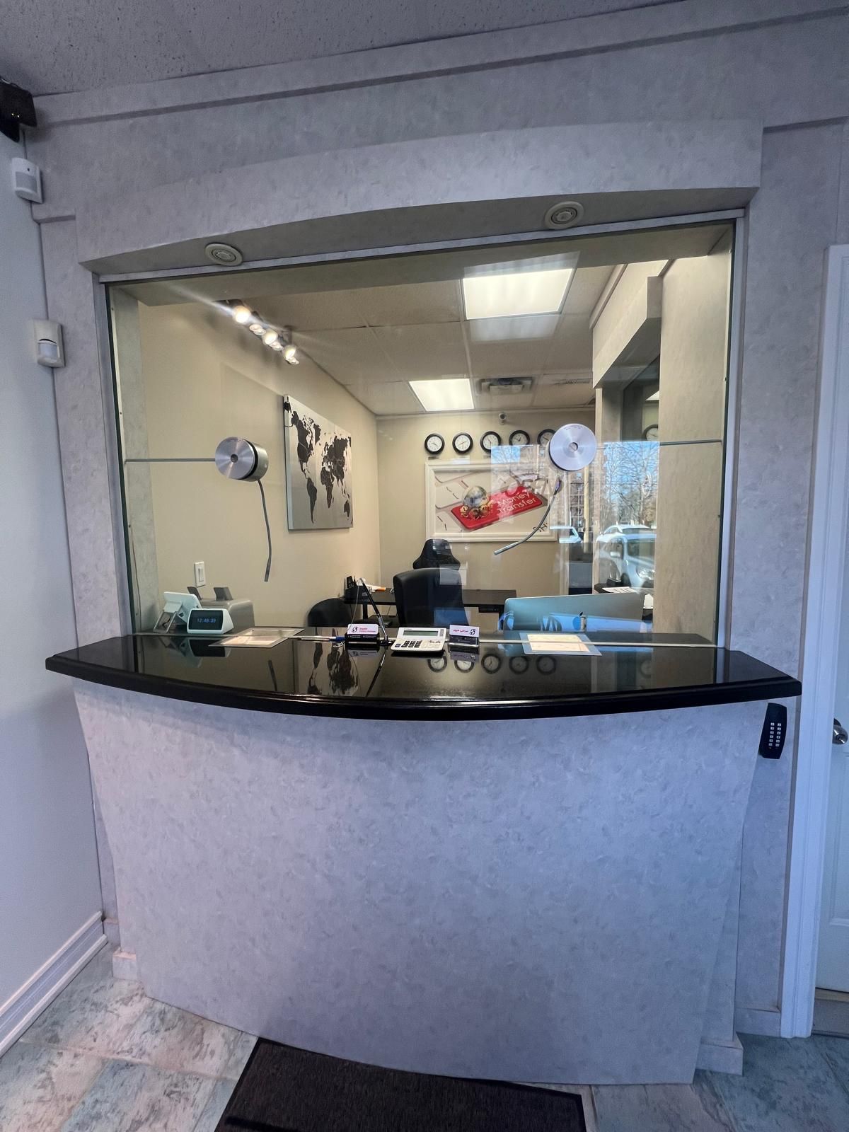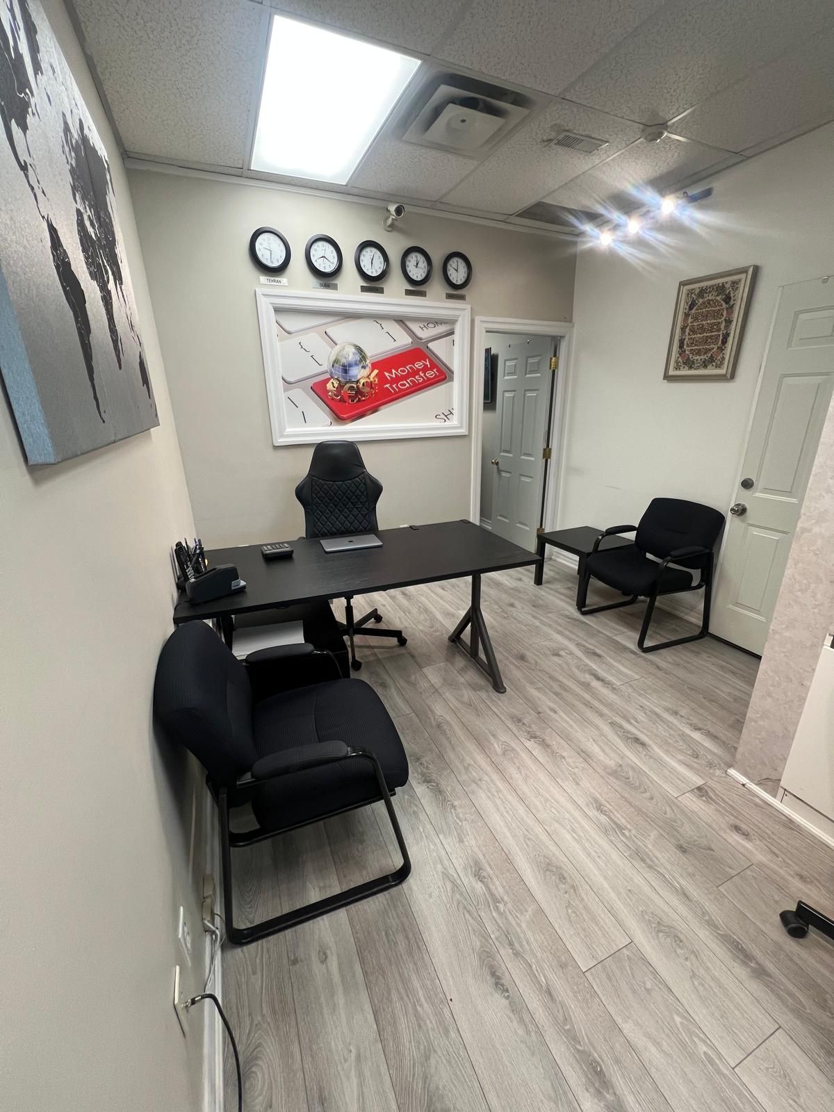 Custom-built design for a currency exchange, fully renovated: new flooring, fresh paint, upgraded lighting, protected room with a separate secure door, bullet-resistant glass, professional anti-theft safe, two window intercom speaker systems, new cabinetry with ample filing space, sink with hot and cold water, refrigerator and microwave, two lcd tvs, complete cctv surveillance system, secured back door with access to the office area, two phone lines, desk and chair set, employee time-tracking device, attractive lease rate with renewal option $2663. 1 monthly