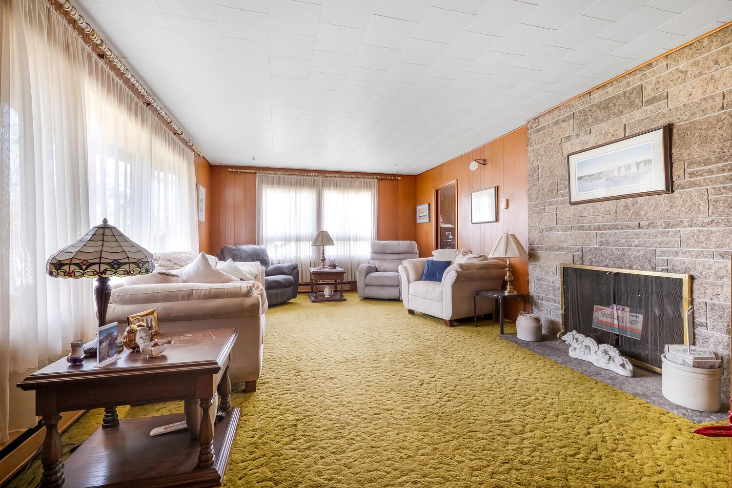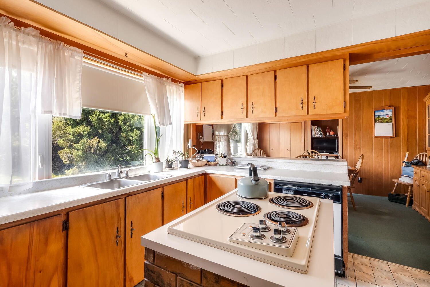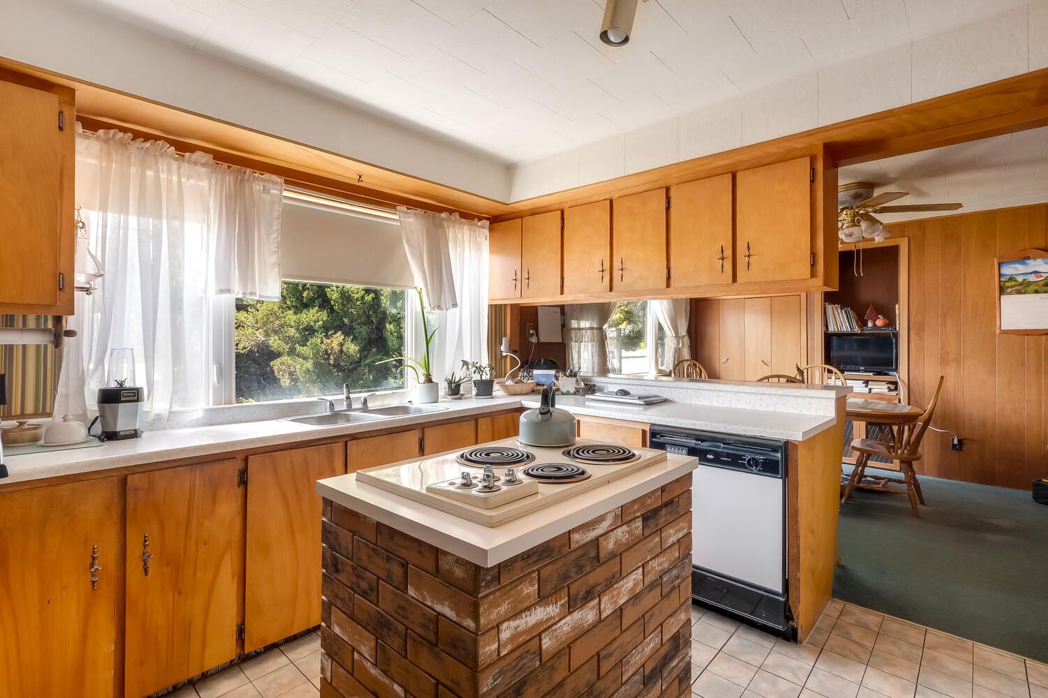• Spacious home with open kitchen, living room, and cozy wood fireplace.
