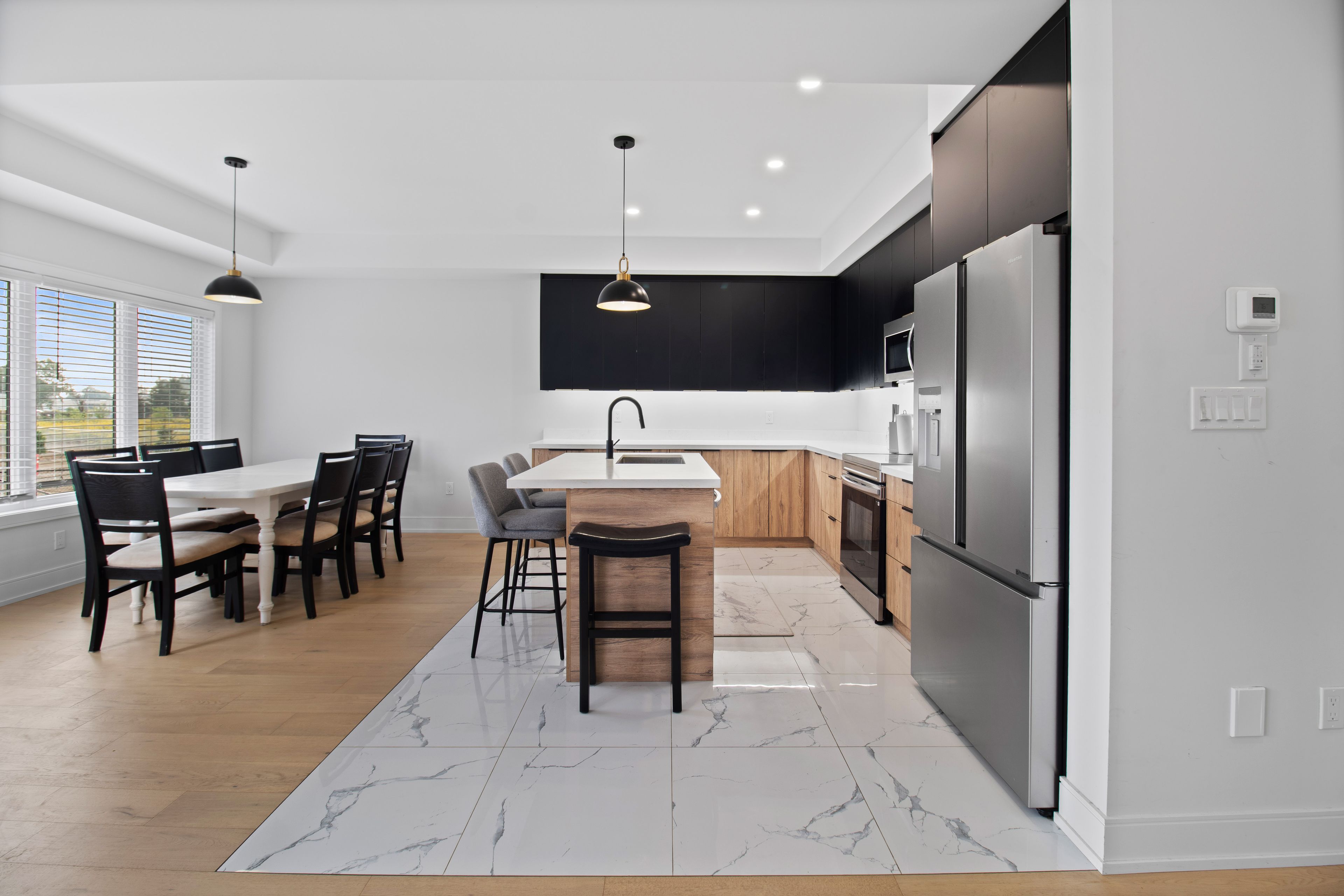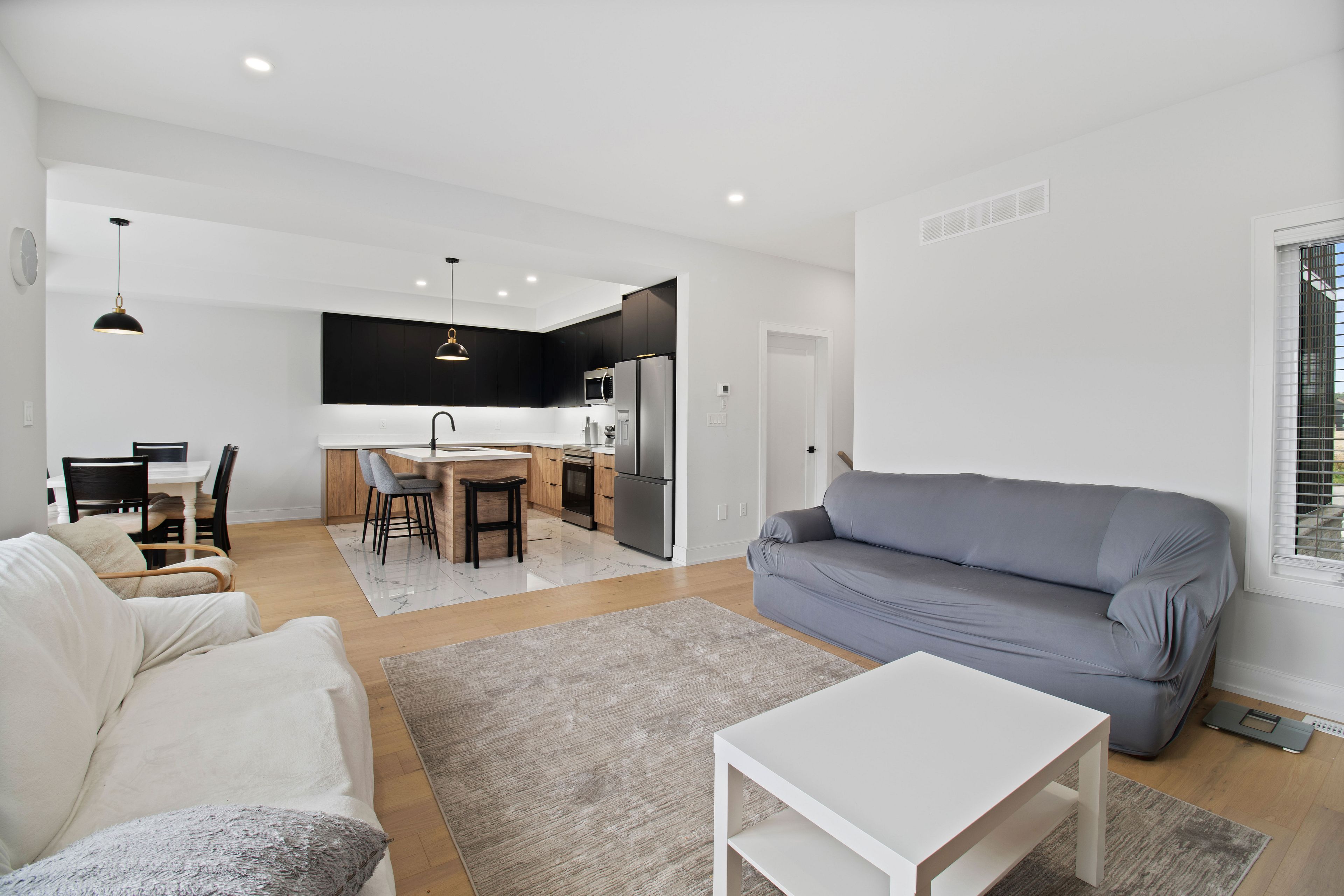 • Open concept living/dining area with a backyard view and balcony.