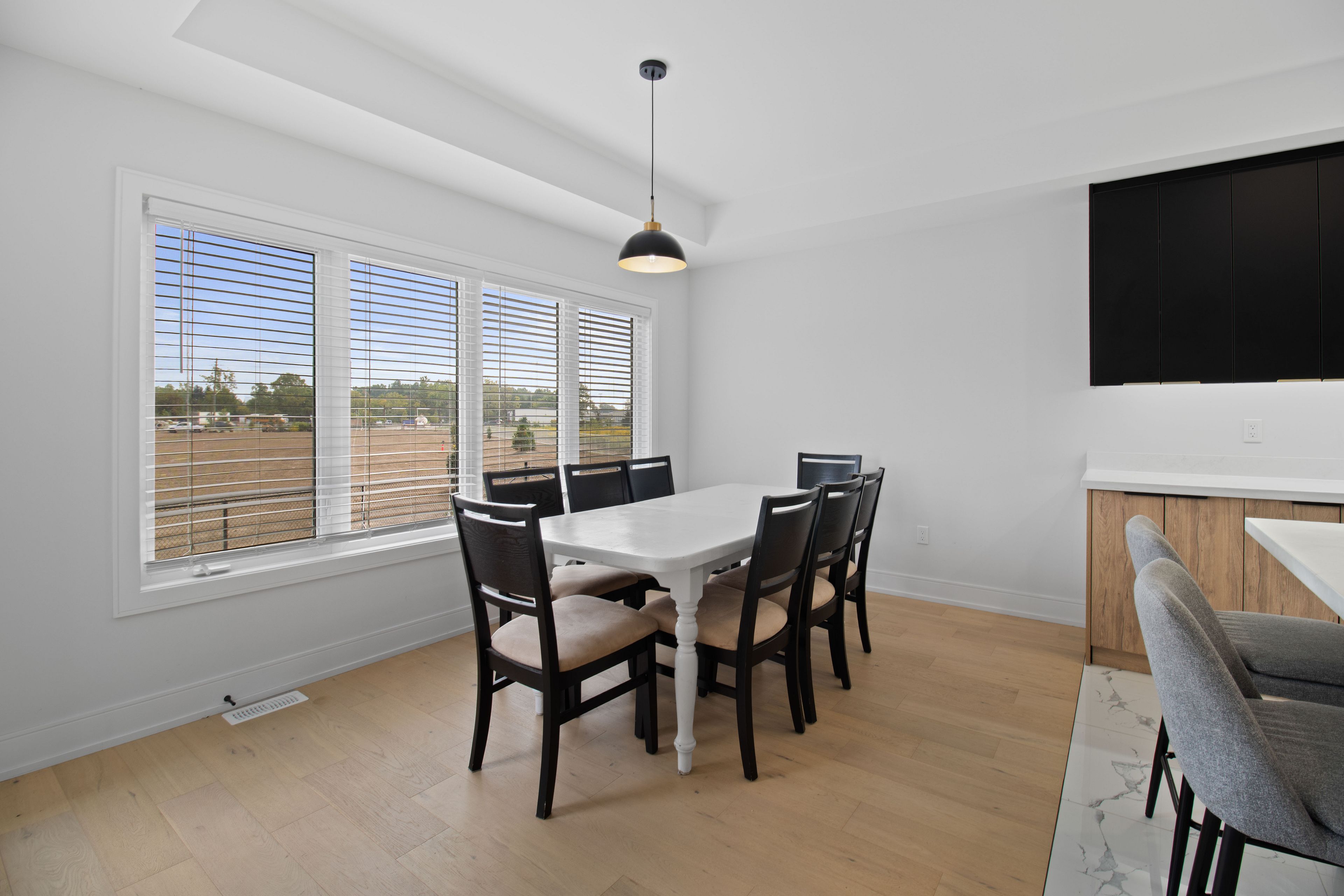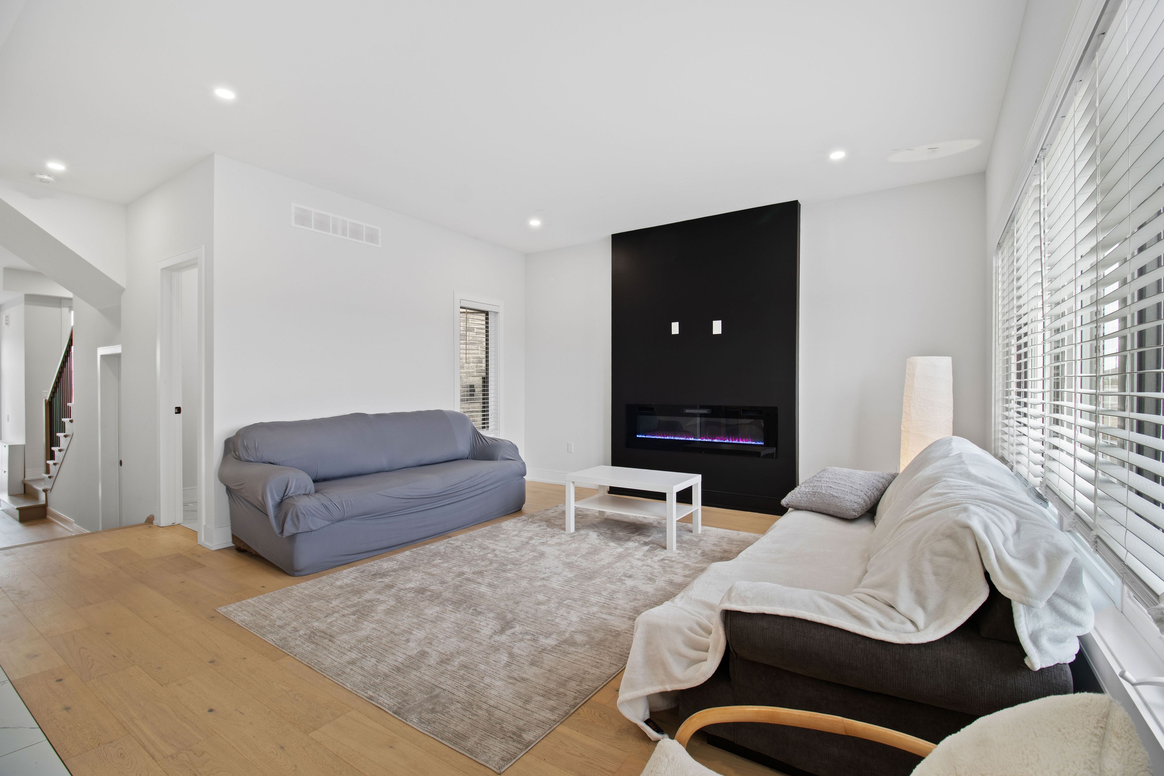 • Spacious open concept living/dining area with balcony and electric fireplace.