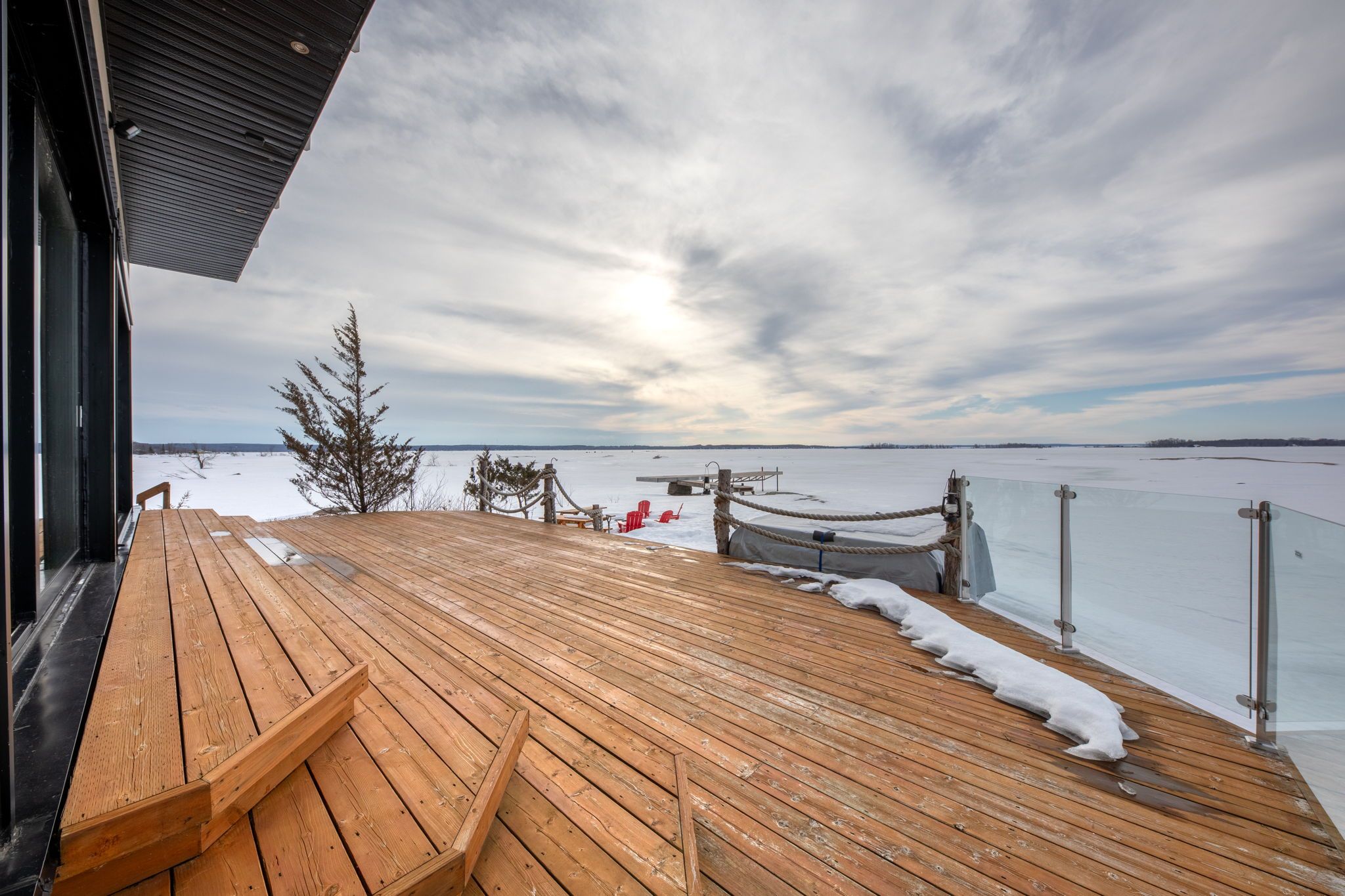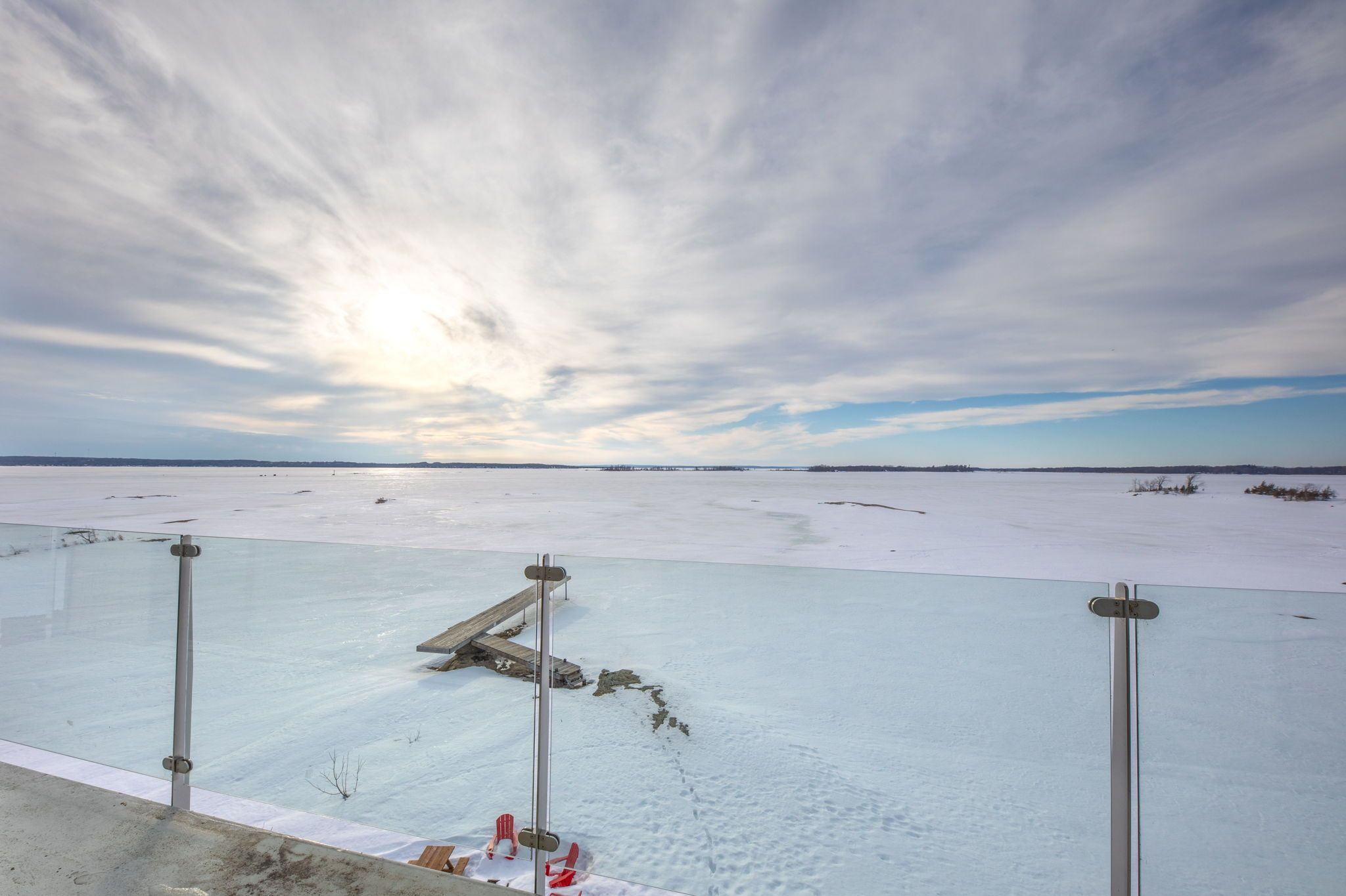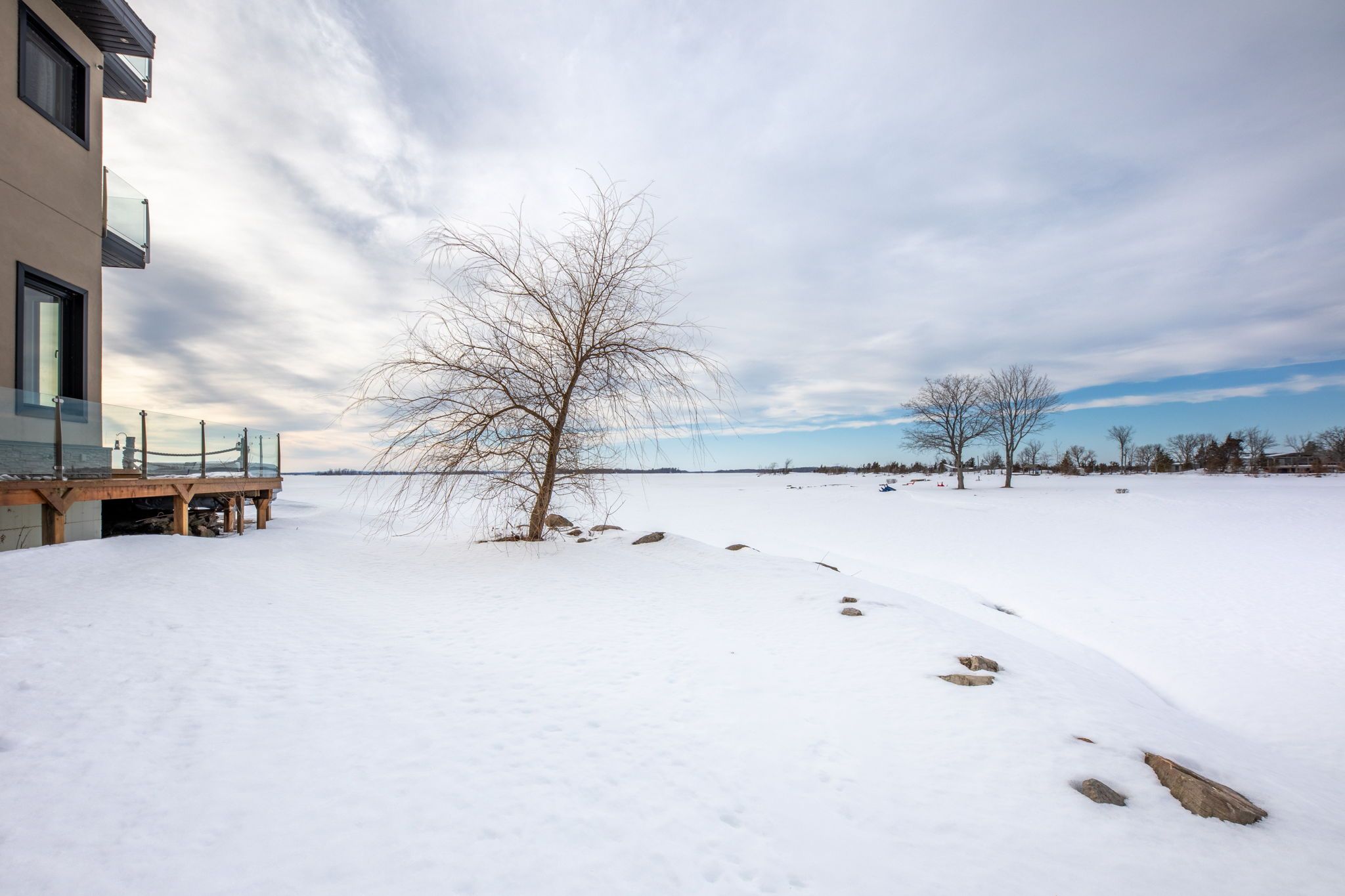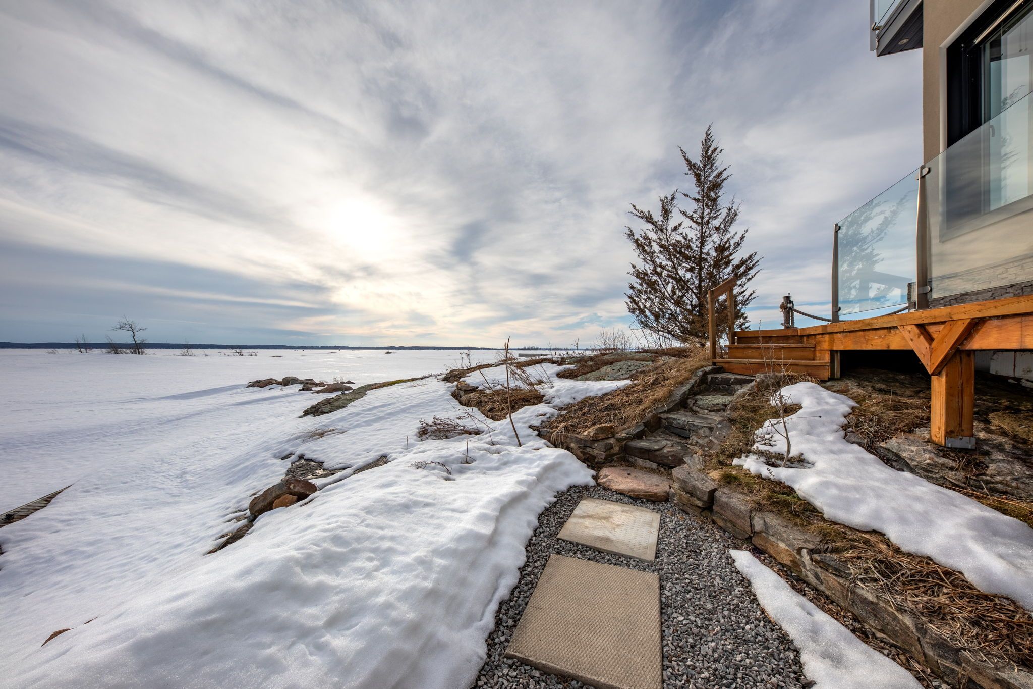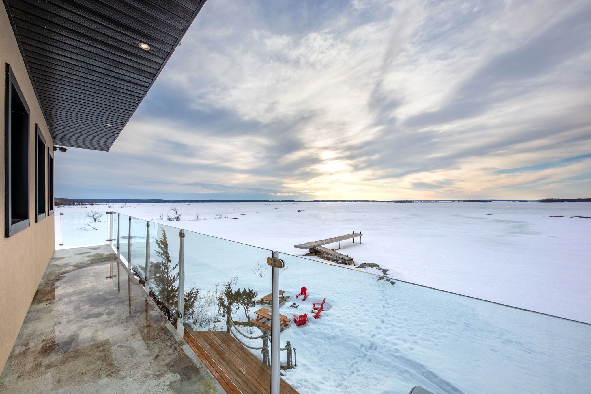 An extraordinary waterfront estate on georgian bay! This architecturally striking 2. 5-storey residence offers approximately 3,000 sq ft of refined living space on a rare private peninsula with over 500 feet of pristine shoreline. Surrounded by water, the property delivers exceptional privacy, sweeping 270-degree panoramic views, and unforgettable sunsets. The main level is designed for elevated living and entertaining, featuring a seamless open-concept layout with expansive windows that frame the natural surroundings. The gourmet kitchen is beautifully appointed with premium stainless steel appliances, an oversized island with integrated cooktop and concealed ventilation and a walk-in pantry. The sunken living room creates a dramatic yet inviting setting, perfectly positioned to capture uninterrupted water views. A private office and elegant powder room complete the main floor. Upstairs, the second level offers a serene primary retreat with a spa-inspired 5-piece ensuite and a walk-through closet with custom built-ins. Two additional spacious bedrooms feature unique loft areas, complemented by a stylish 4-piece bath and a dedicated laundry room. The third floor presents a versatile space with hardwood flooring and walkout to a private balcony which offers elevated views over the bay. It's perfectly suited as a lounge, studio, or additional living area. Outdoors, enjoy a natural sandy beach, private boat launch, and endless waterfront recreation. The peninsula setting creates a truly rare and immersive georgian bay lifestyle. A heated and insulated garage with an unfinished loft above provides excellent future potential. Some trim work remains, offering the opportunity to personalize final finishes. Located just 90 minutes from the gta, this is a rare offering combining luxury, privacy, and exceptional waterfront living.