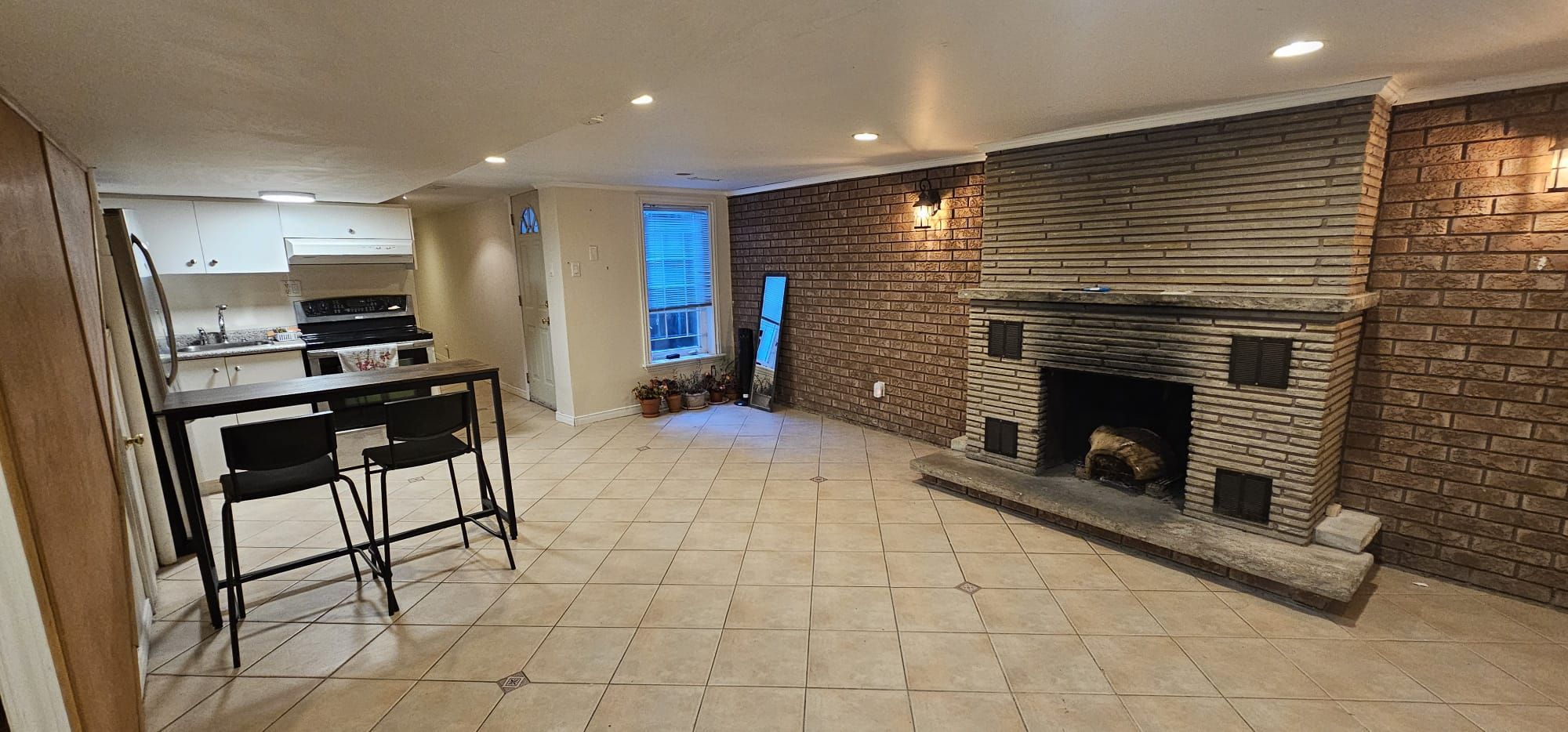 • Combined kitchen, dining, and living room with a cozy fireplace.
