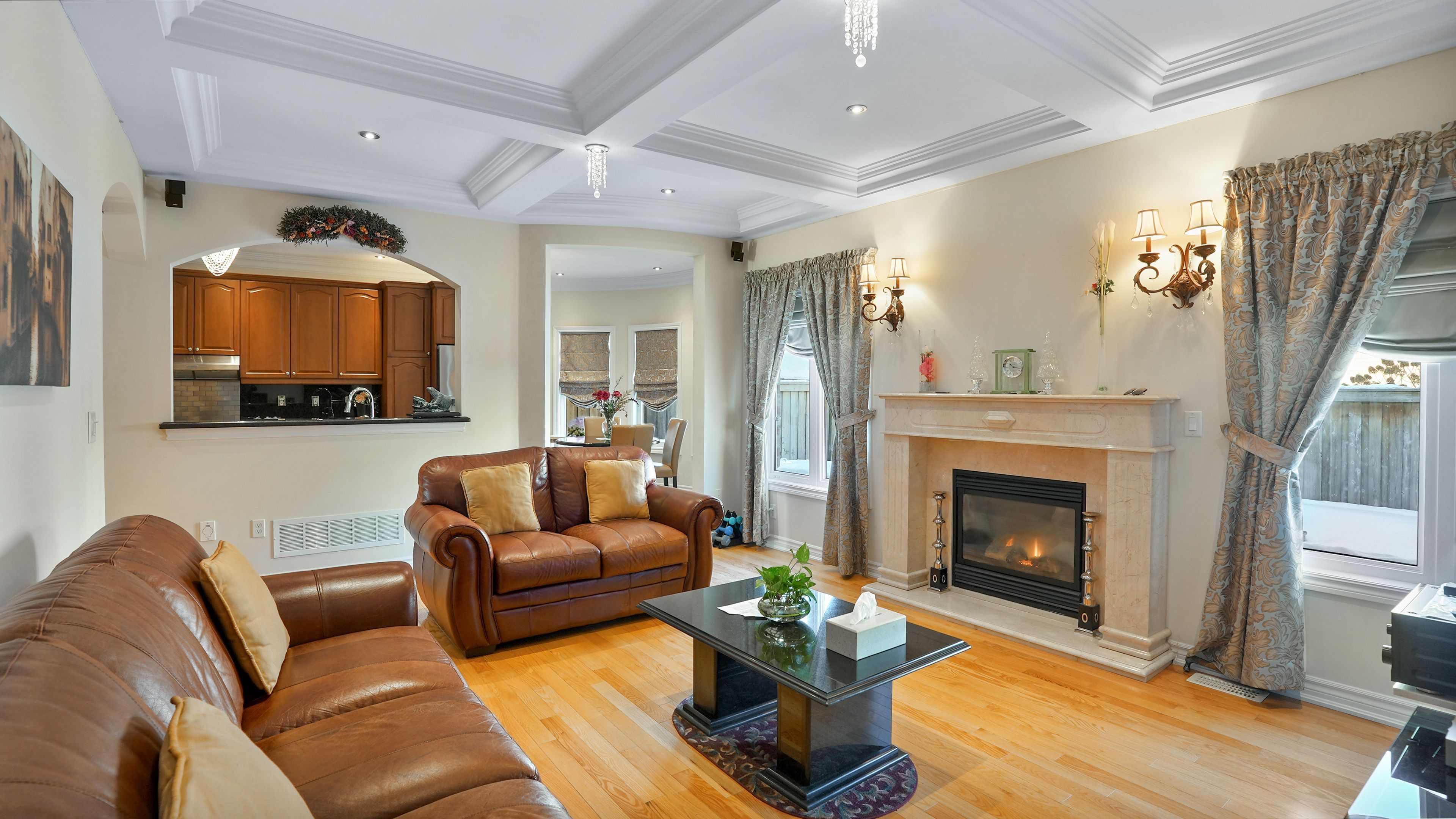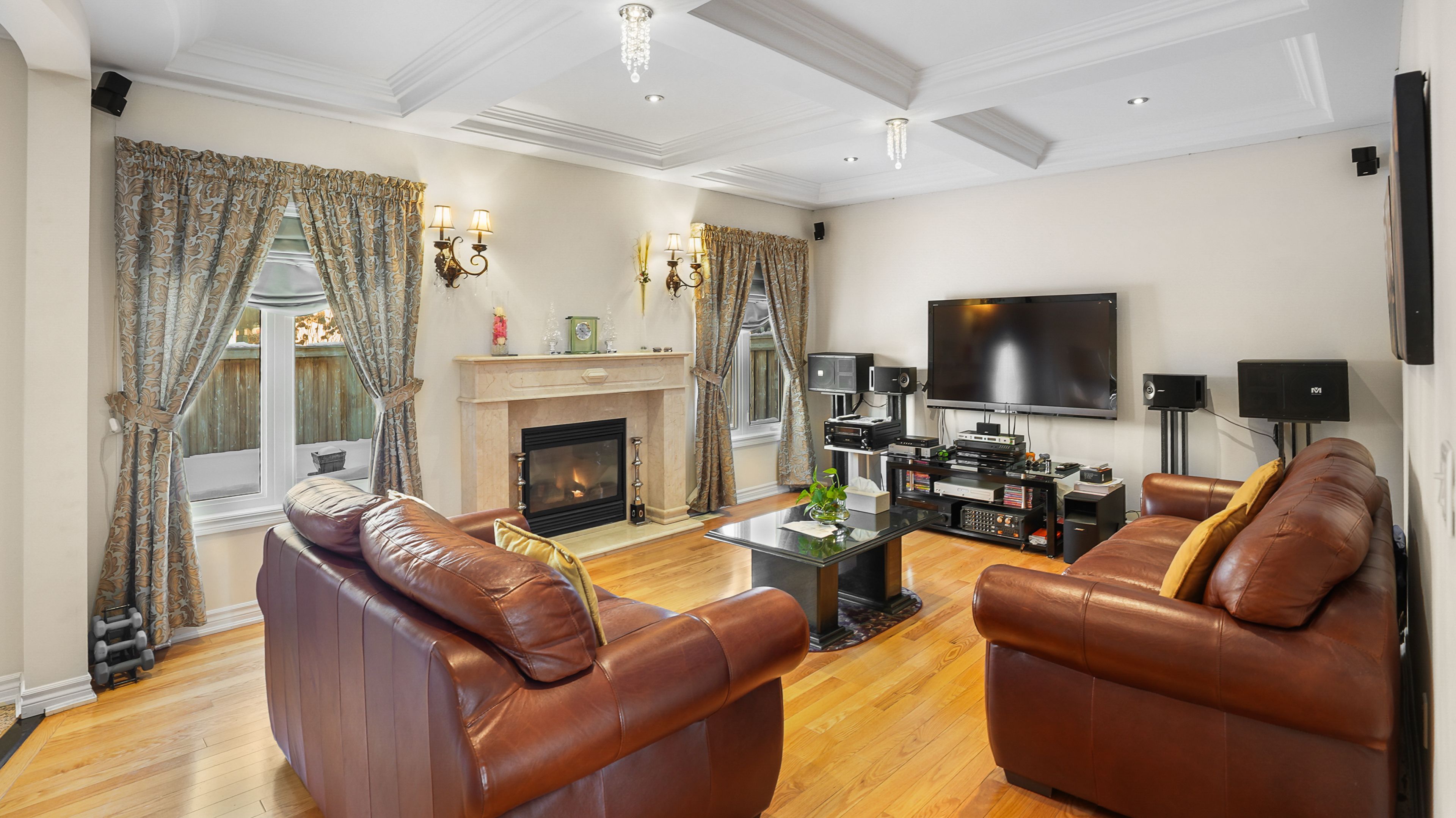 • Spacious family room with a custom coffered ceiling and fireplace.