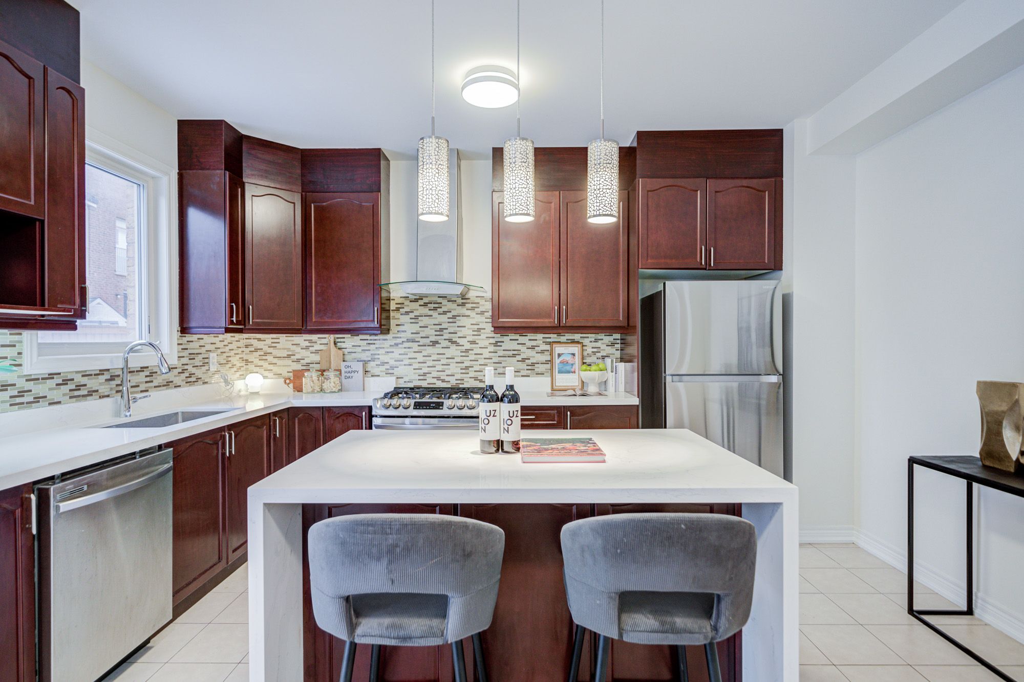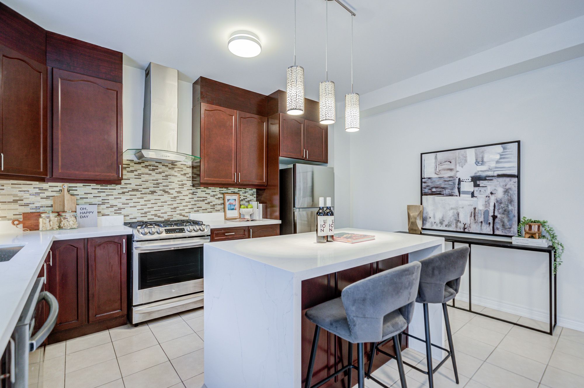 • Upgraded kitchen with new quartz countertops and stainless steel appliances.