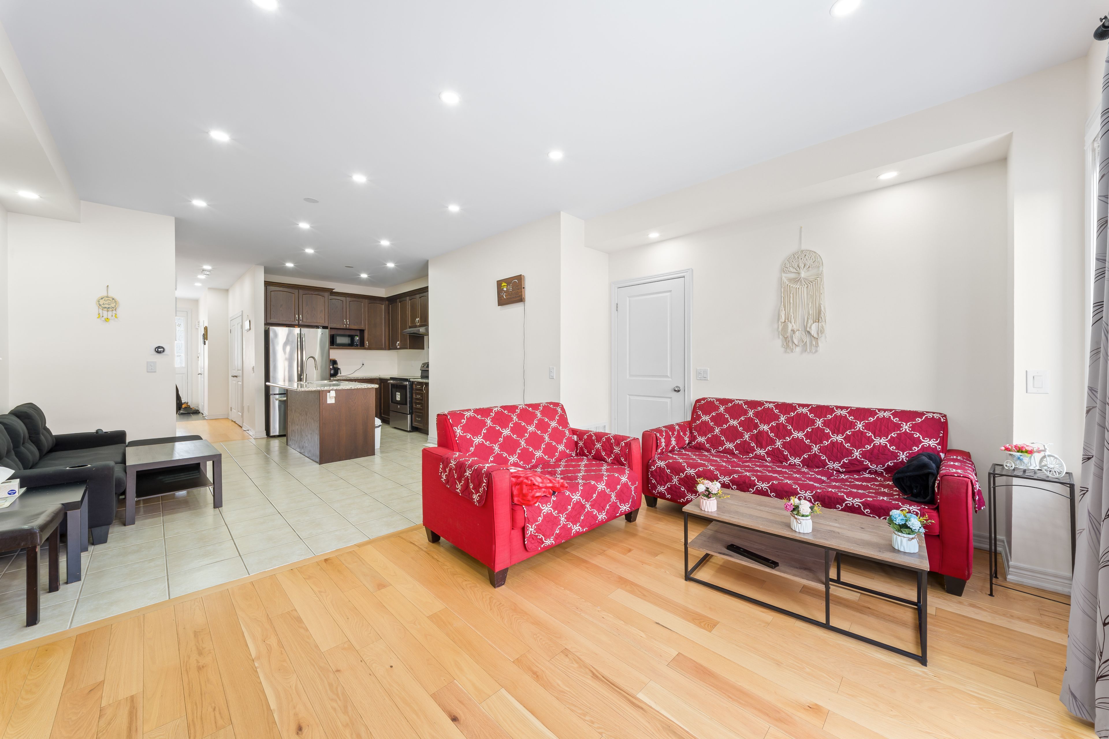 • Bright open-concept kitchen with stainless steel appliances and breakfast area.