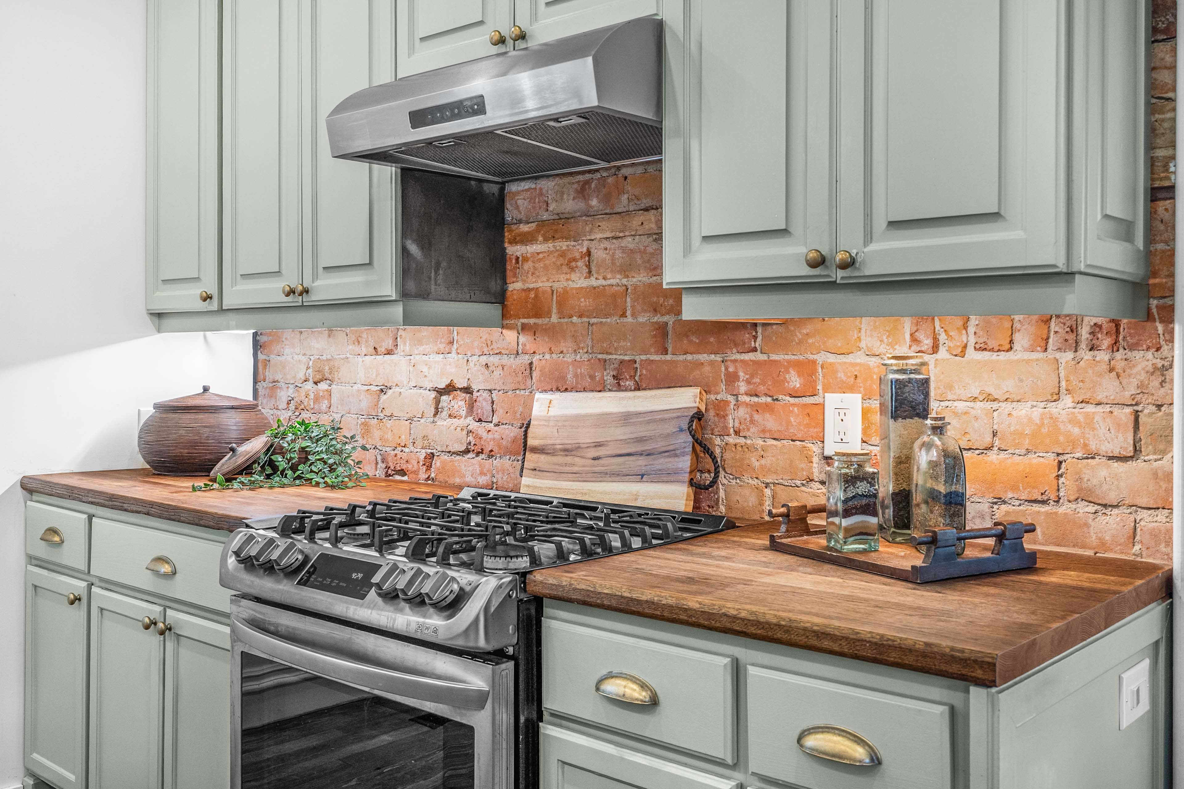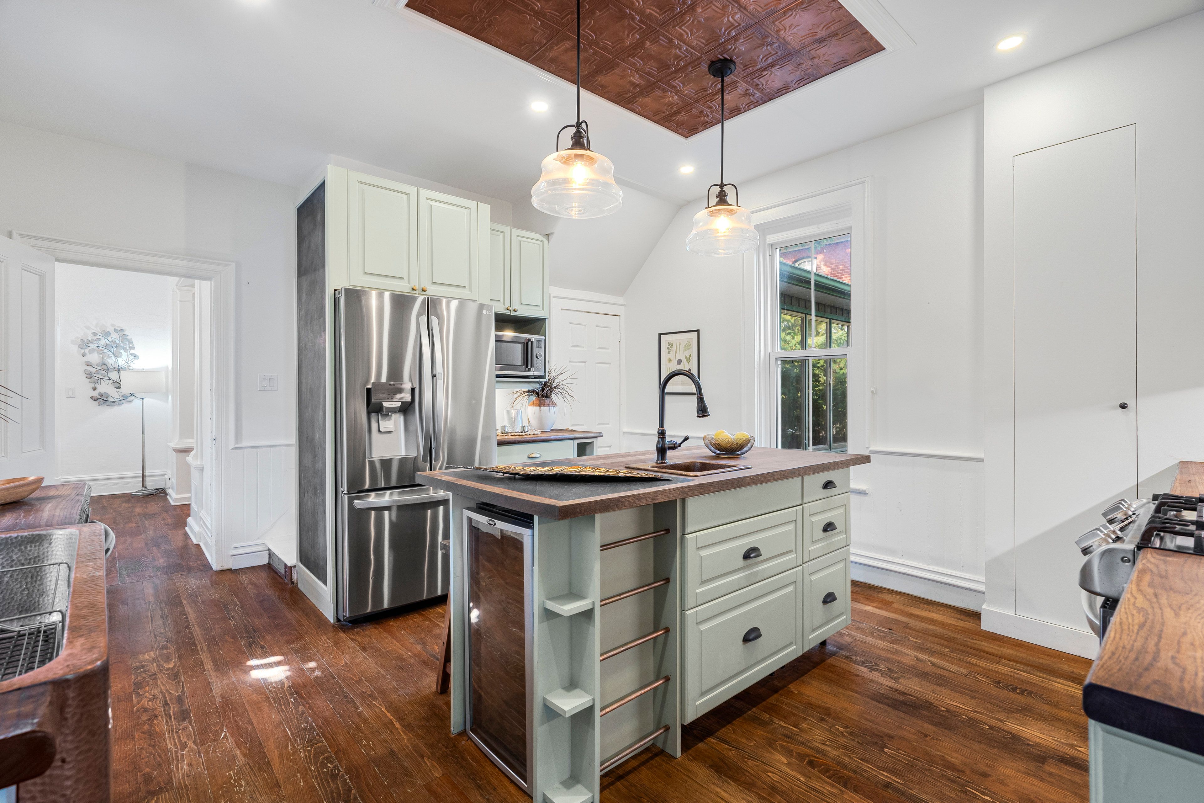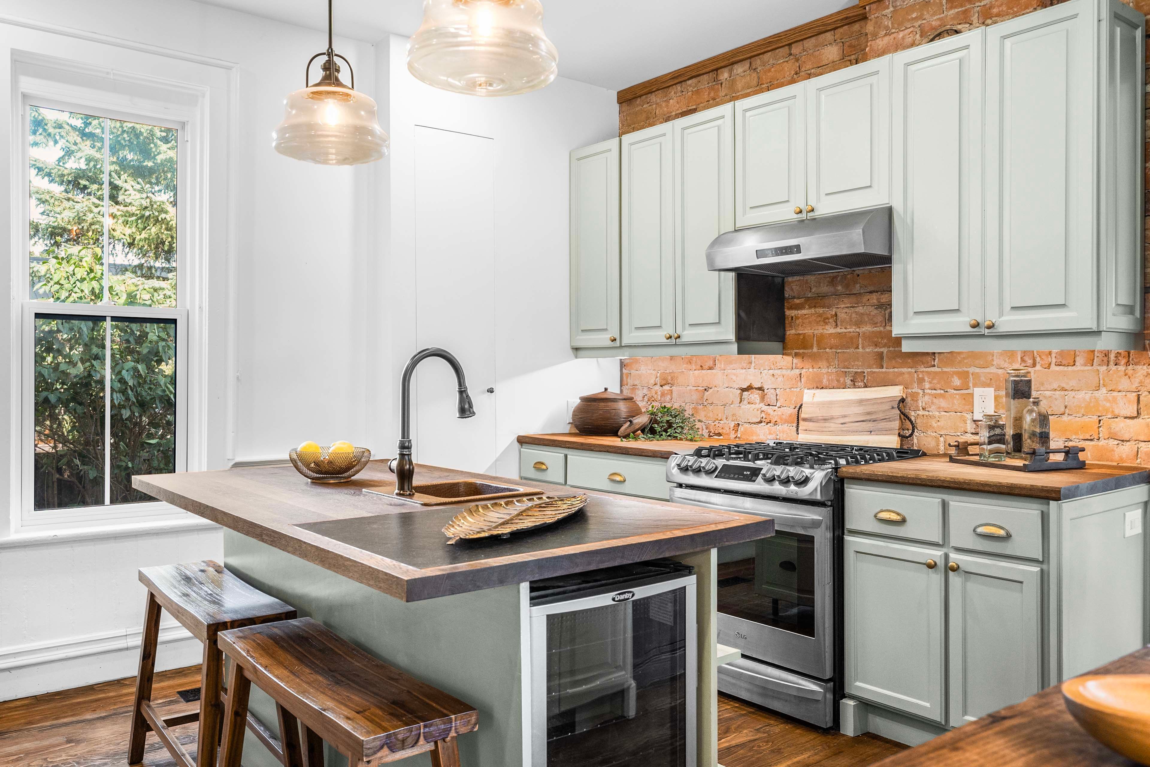 • Renovated kitchen with ample storage, gas range, and built-in wine fridge.