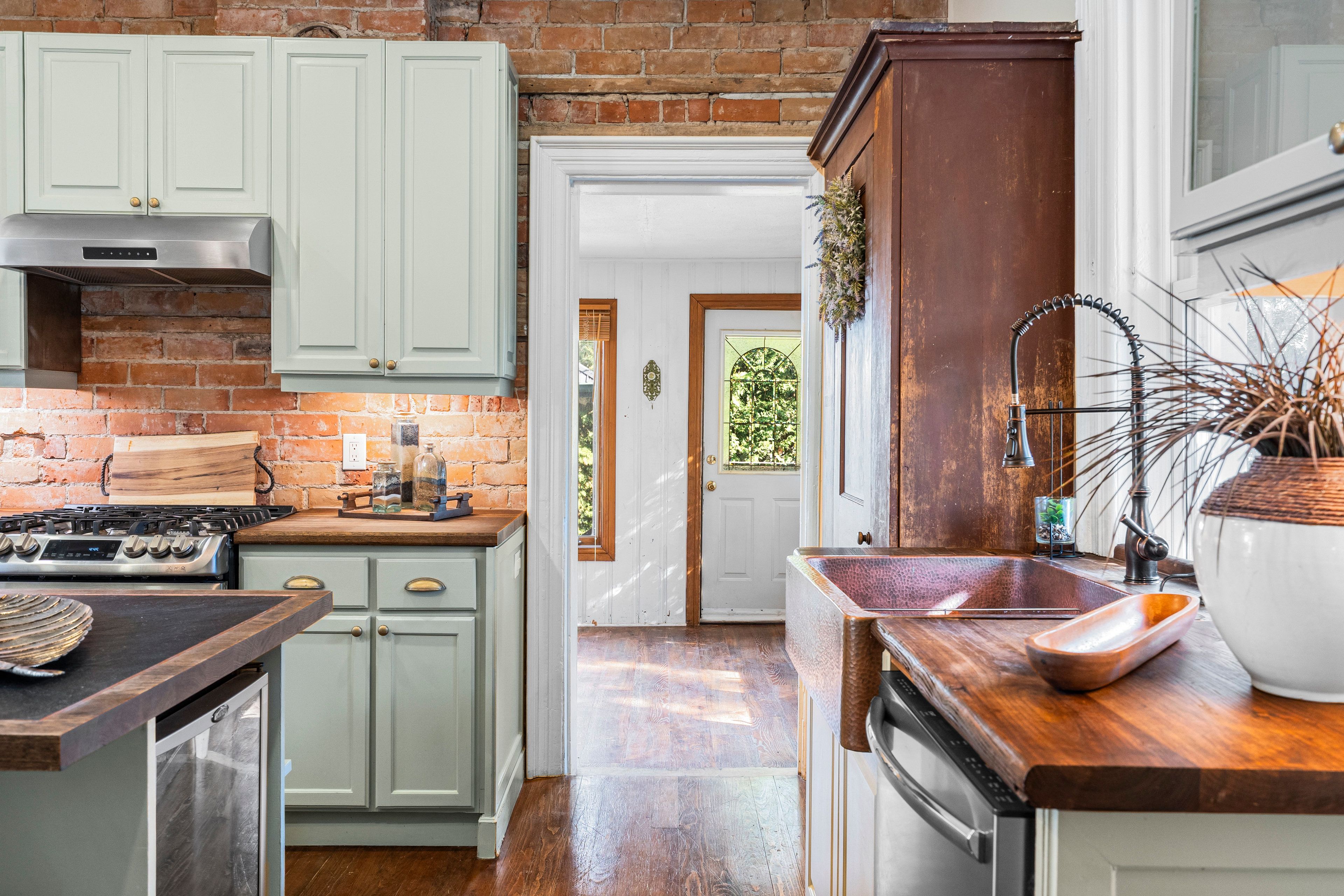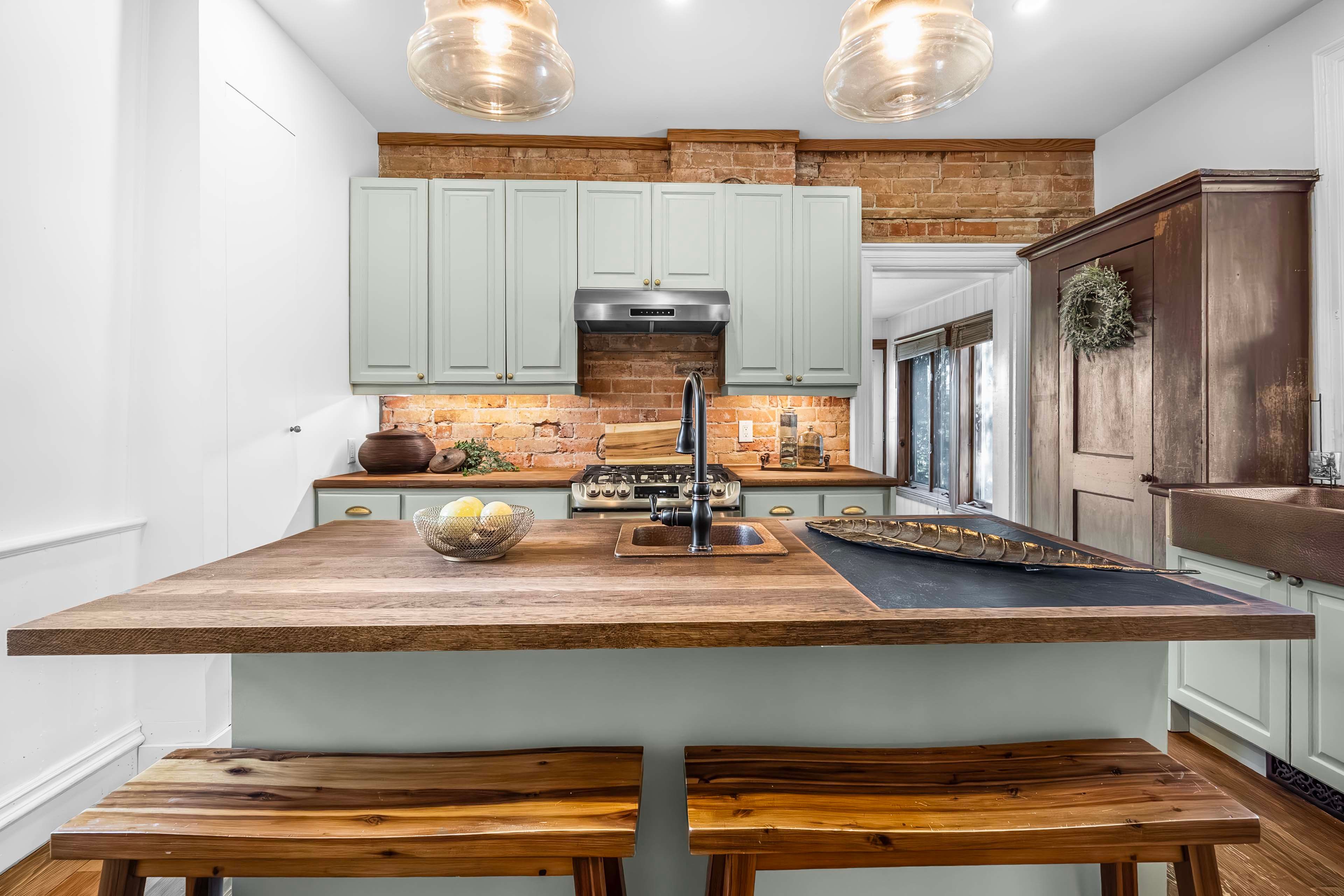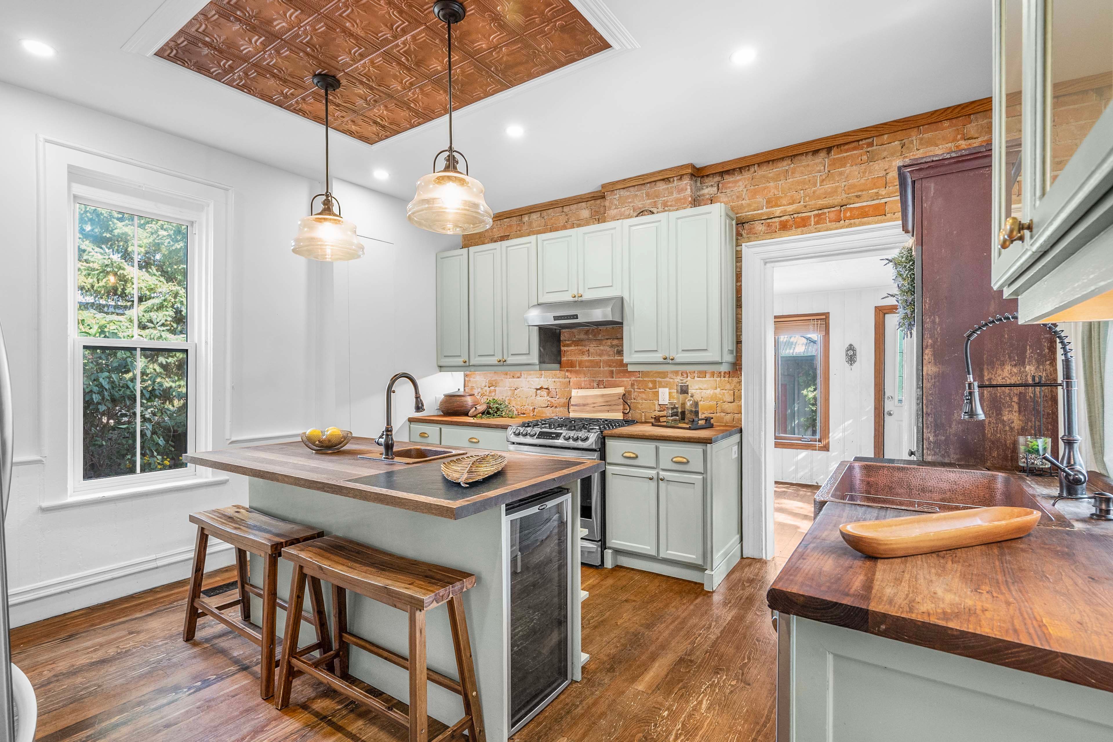 • Renovated kitchen with ample storage, gas range, and built-in wine fridge.