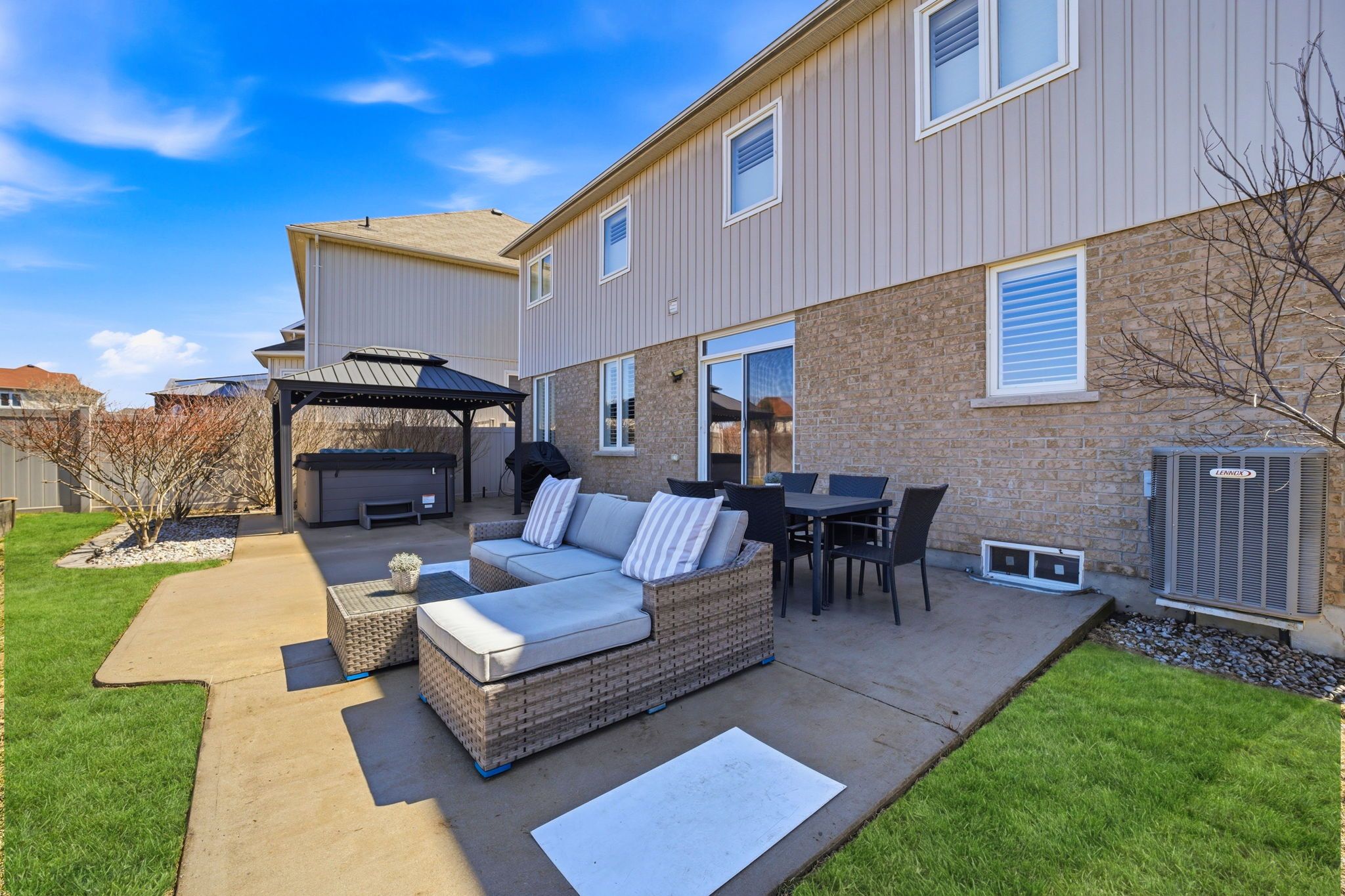 • Large backyard with concrete patio, hot tub, and sprinkler system.