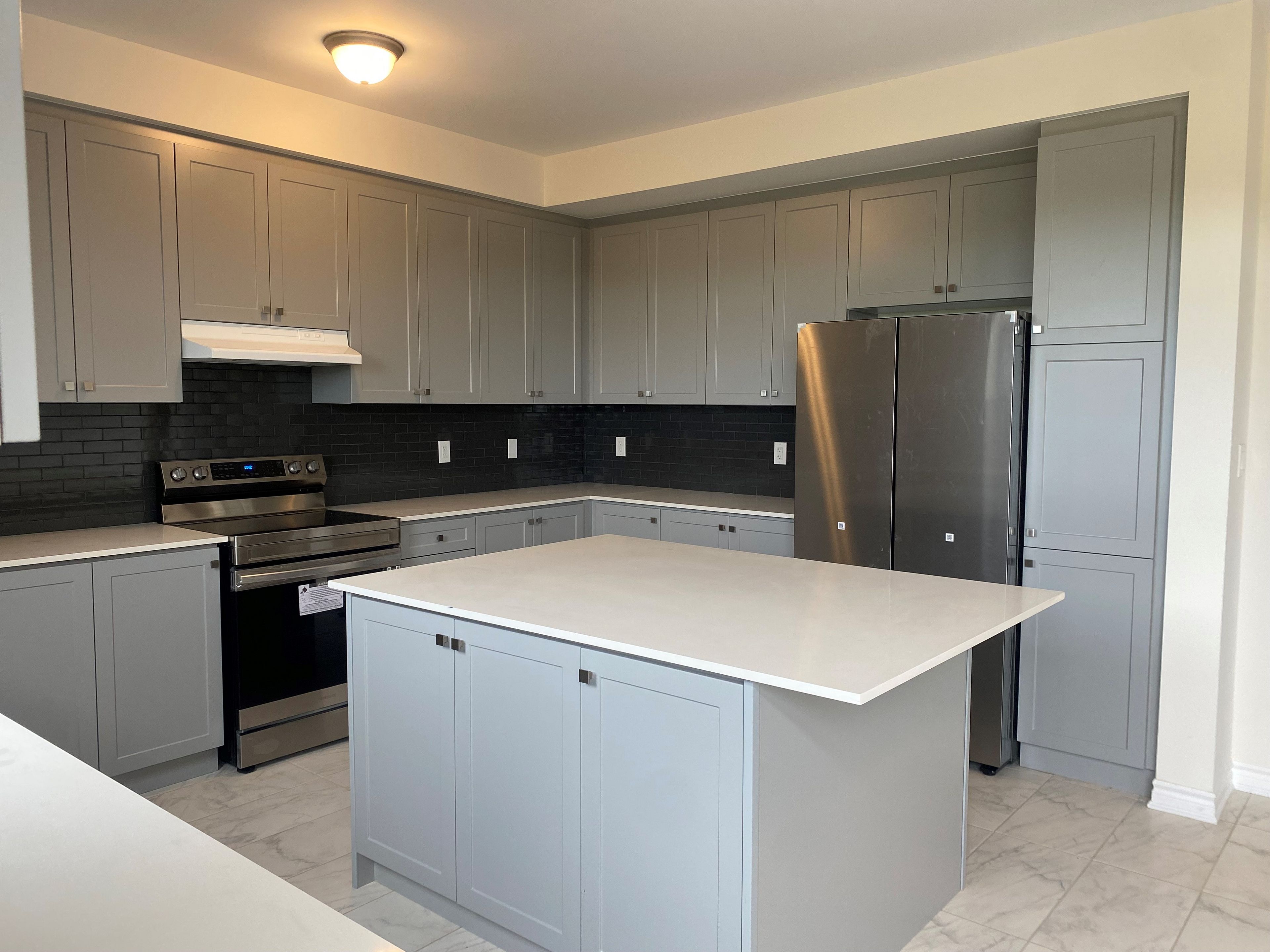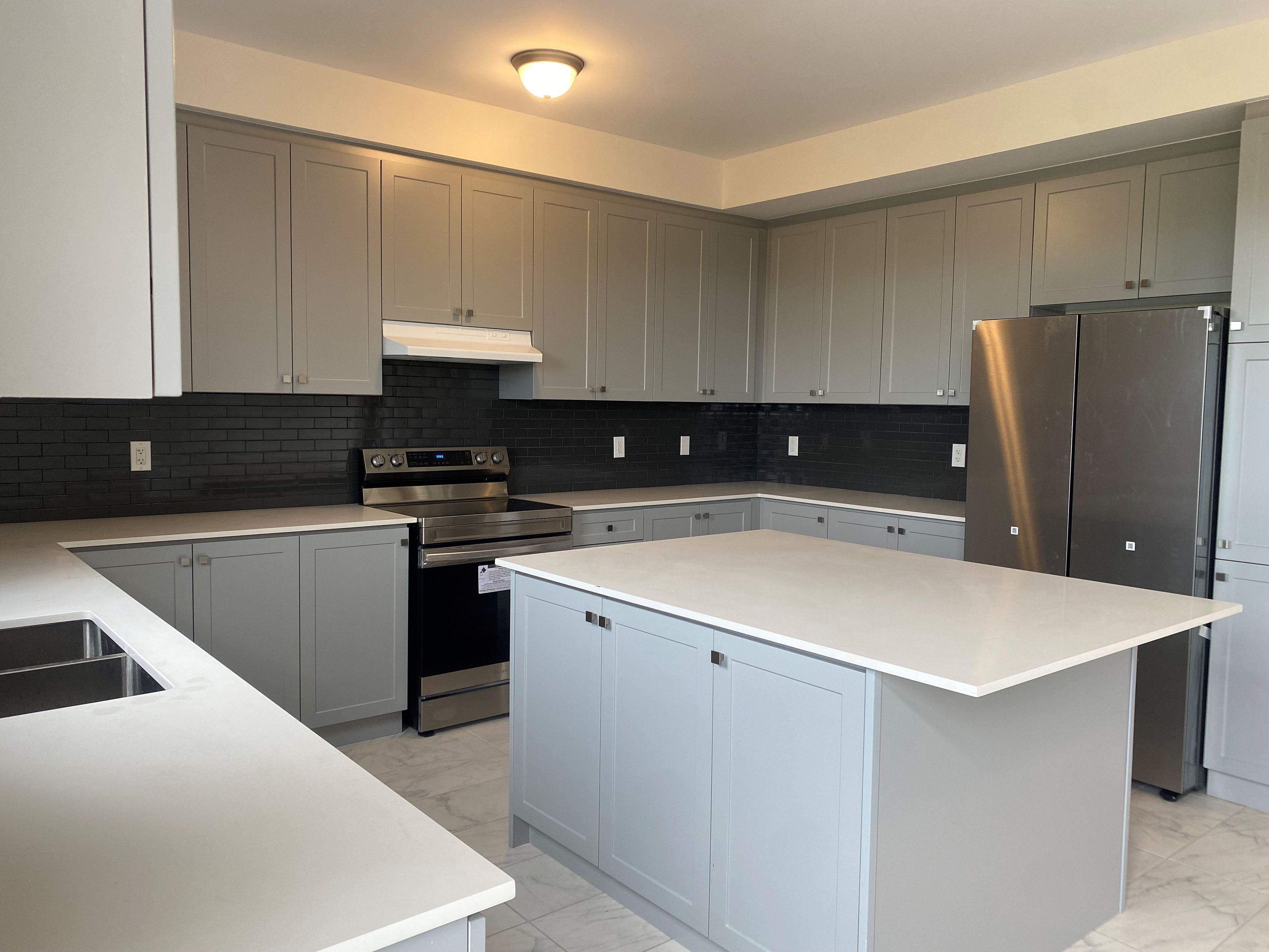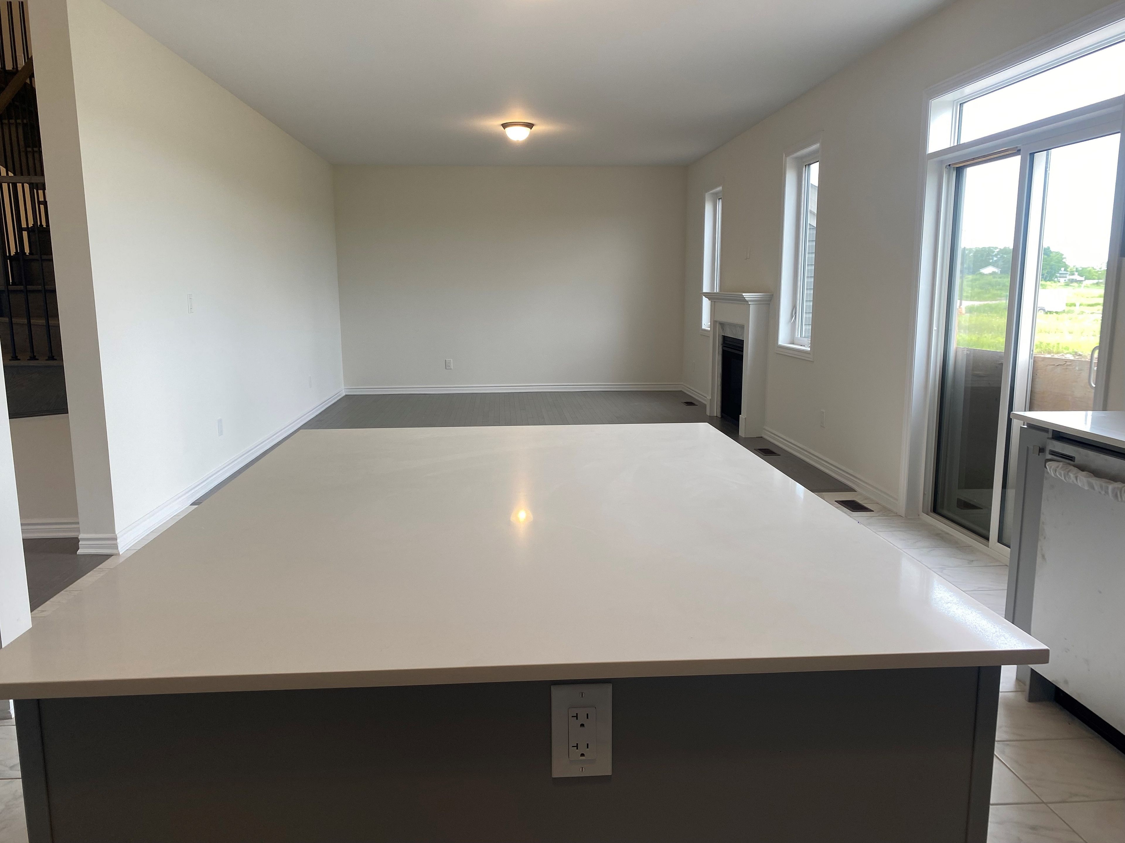 • Modern kitchen with center island and access to the backyard.