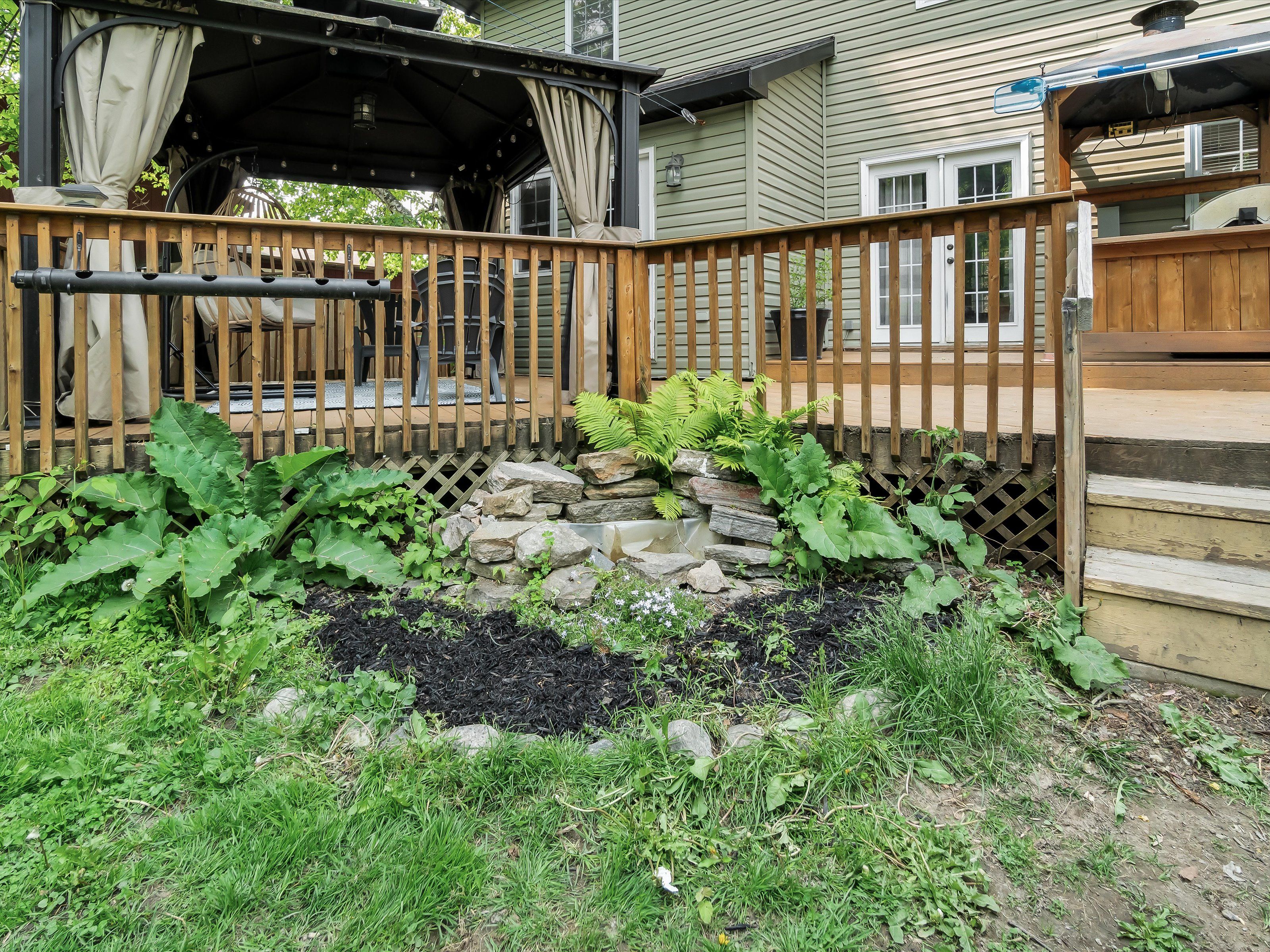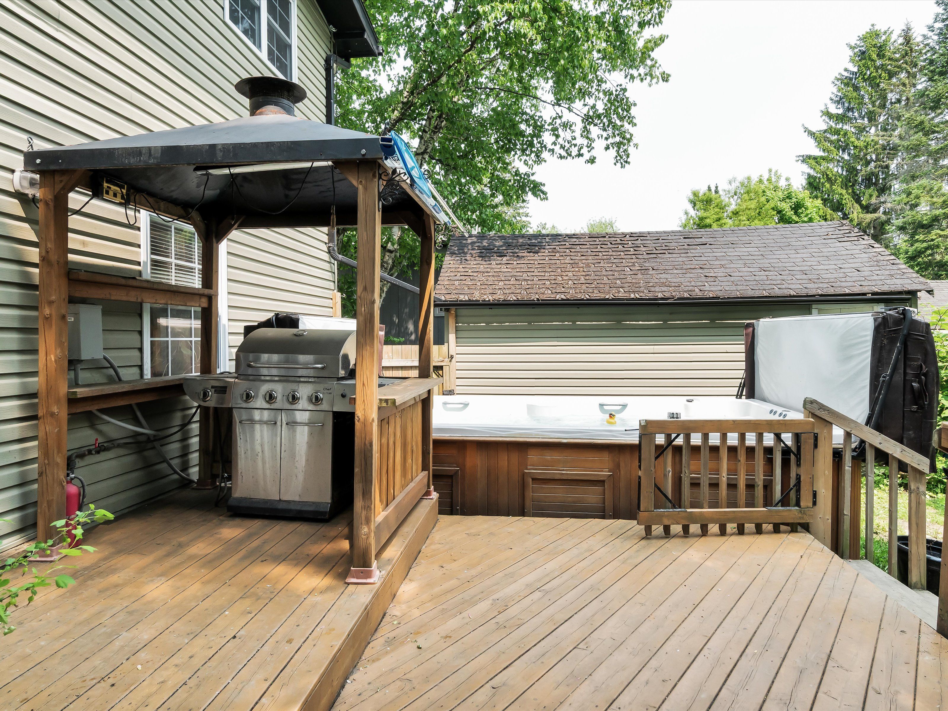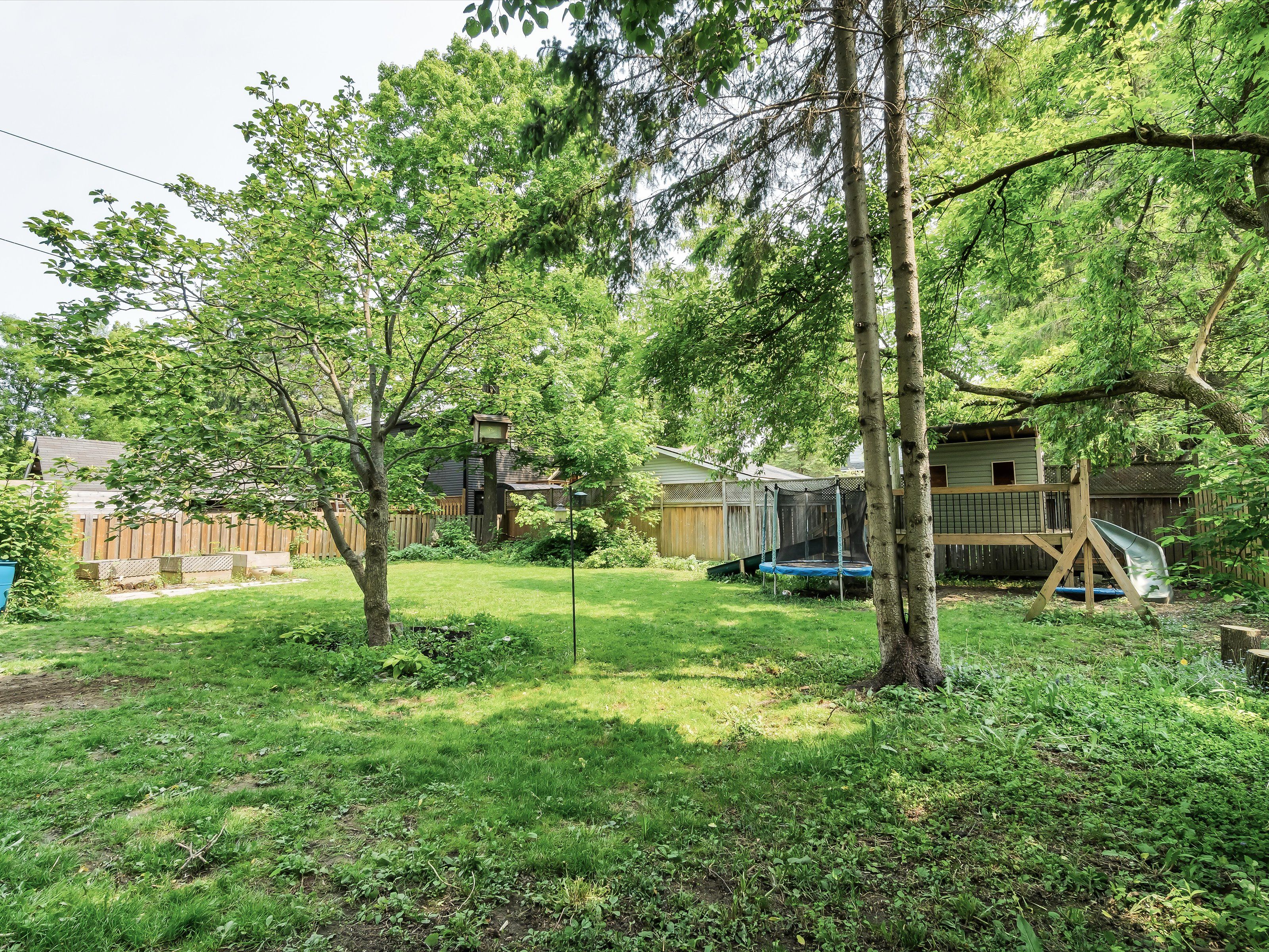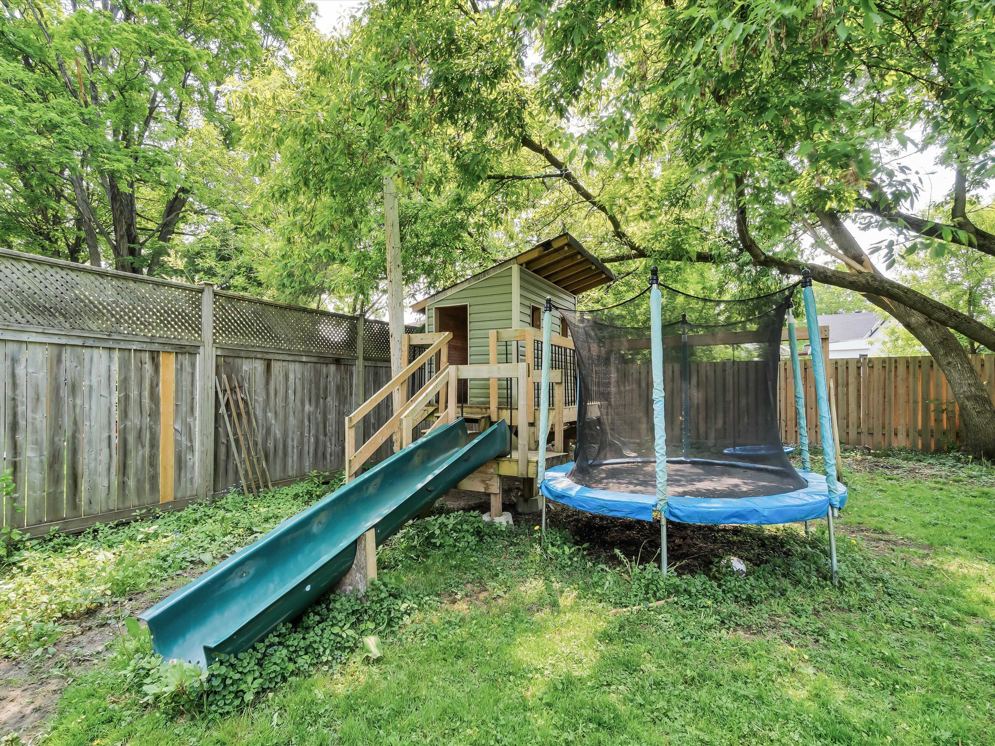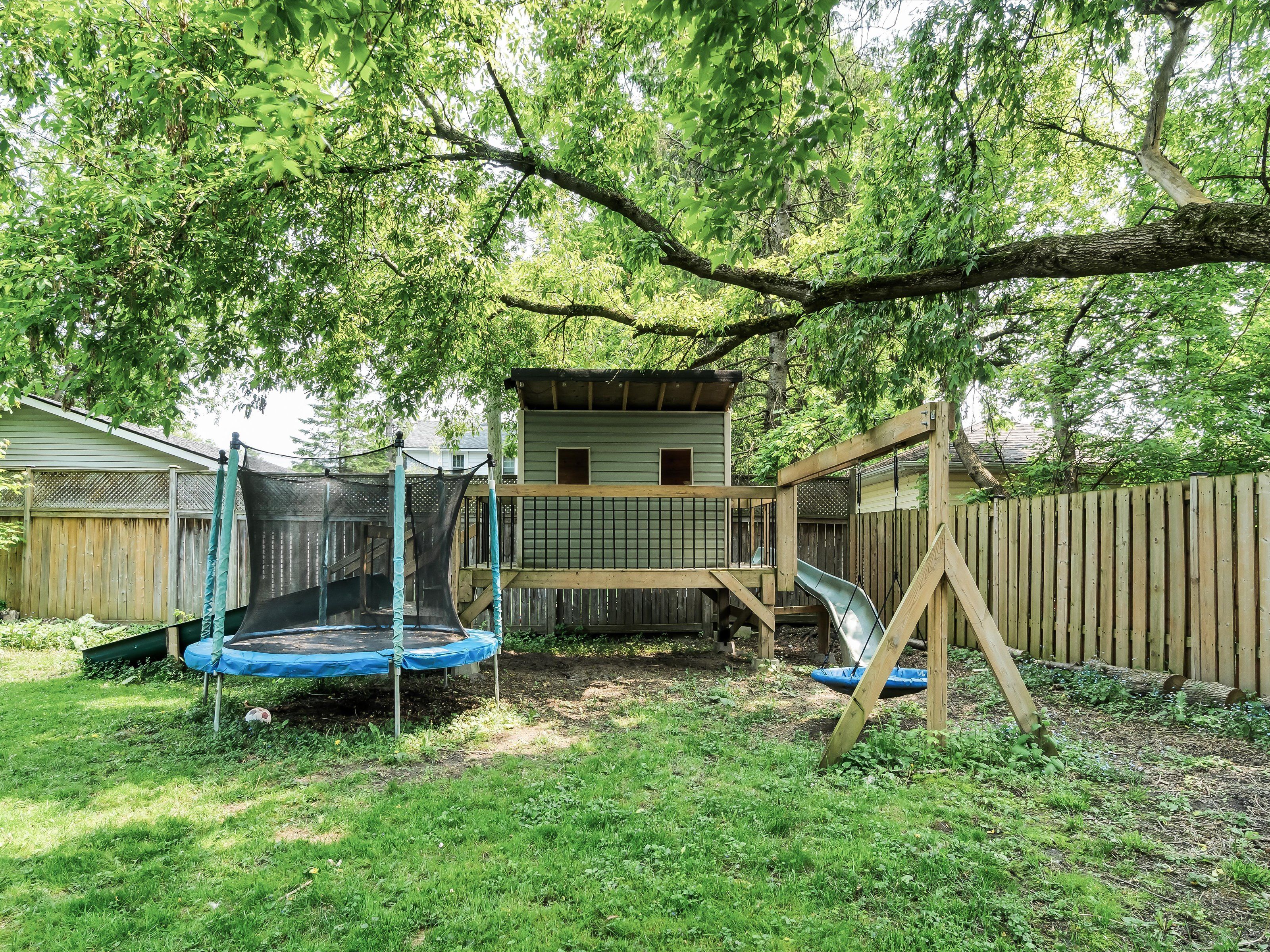 • Fully fenced yard features a deck, treehouse, and trampoline for kids.