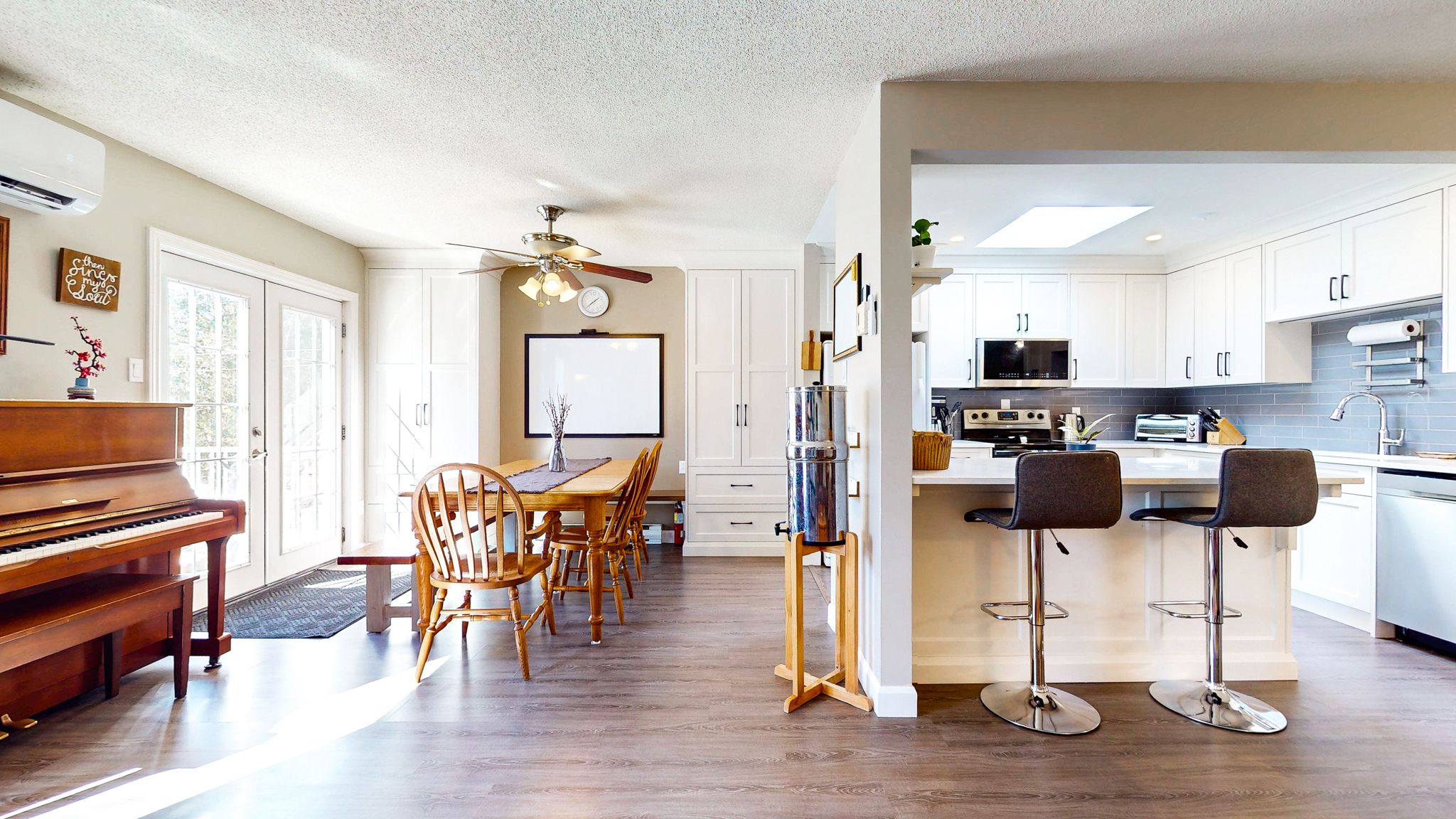 • Bright updated kitchen featuring quartz countertops and modern lighting.