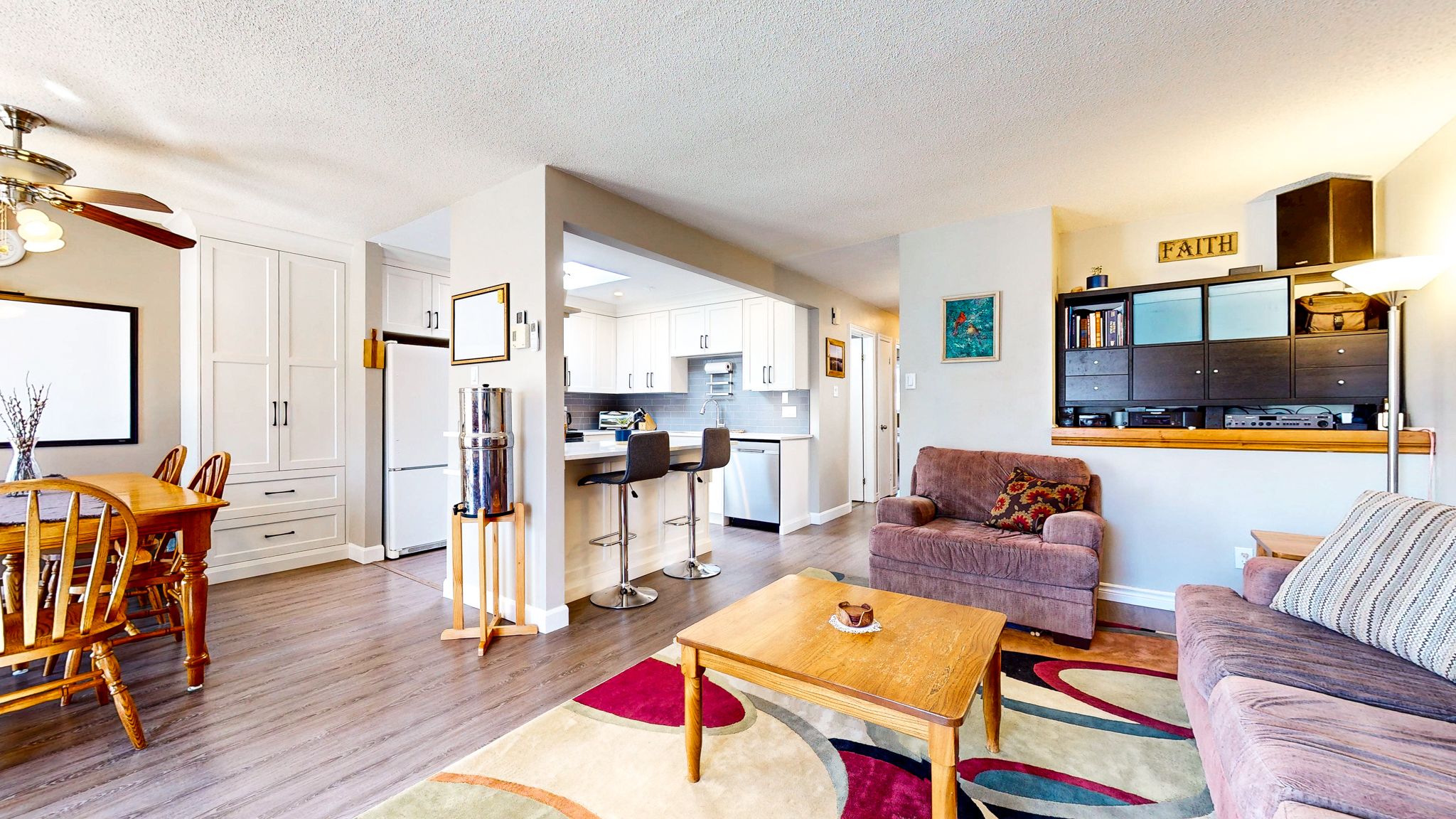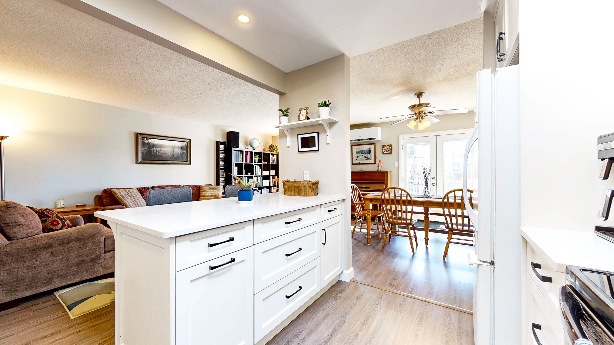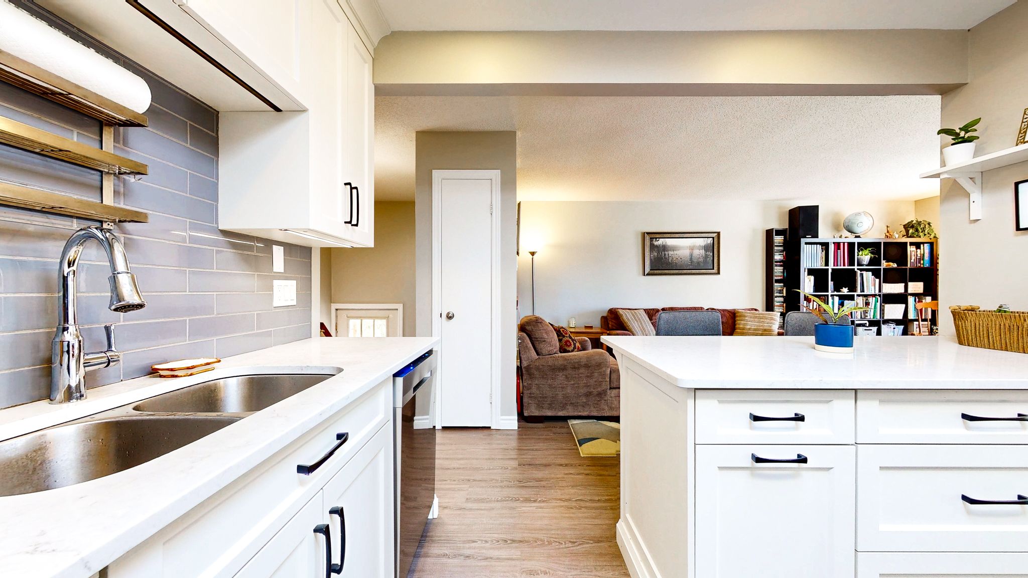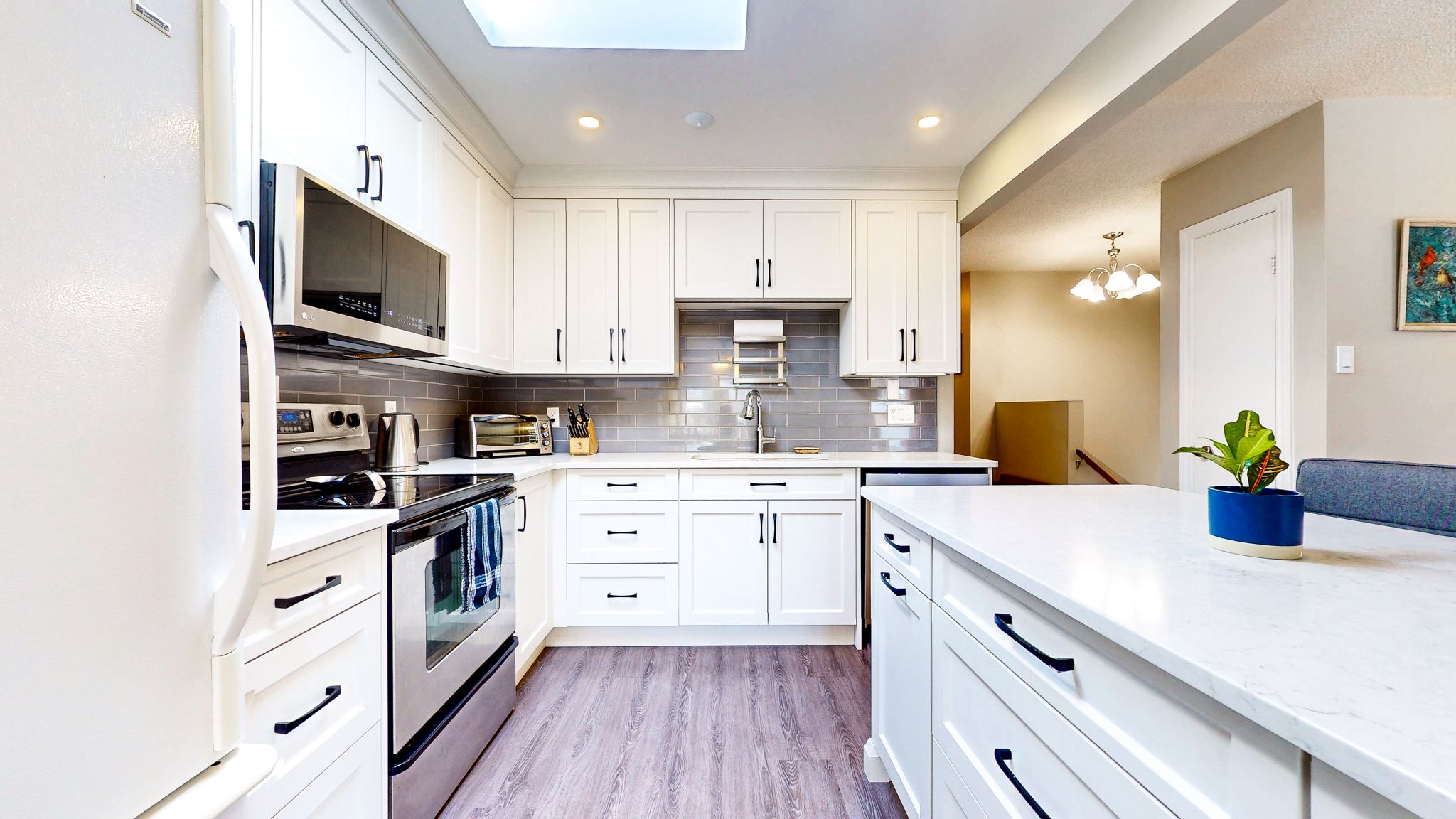 • Updated kitchen featuring quartz countertops and modern under-cabinet lighting.