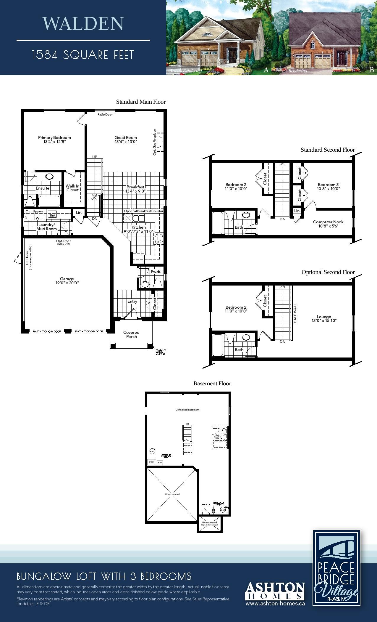 Introducing the walden -a stylish bungaloft in phase 4 of peace bridge village. This 1,584 sq. Ft. Home hits the sweet spot for comfort and functionality. The open-concept layout is made for hosting, whether it's holiday dinners or weekend get-togethers. The main floor features 9' ceilings, ceramic tile flooring, and a spacious primary suite with walk-in closets and a 4-piece ensuite. You'll also find a 2pc powder room, mudroom/laundry, and a bright, inviting living space. Upstairs, the loft adds flexibility with two bedrooms, a full bath, and a cozy lounge area ideal for guests or family. Need more space? Optional second-floor and finished basement plans are available. Located minutes from shops, restaurants, trails, lake erie beaches, and major highways including the peace bridge. The walden blends modern living with convenience.