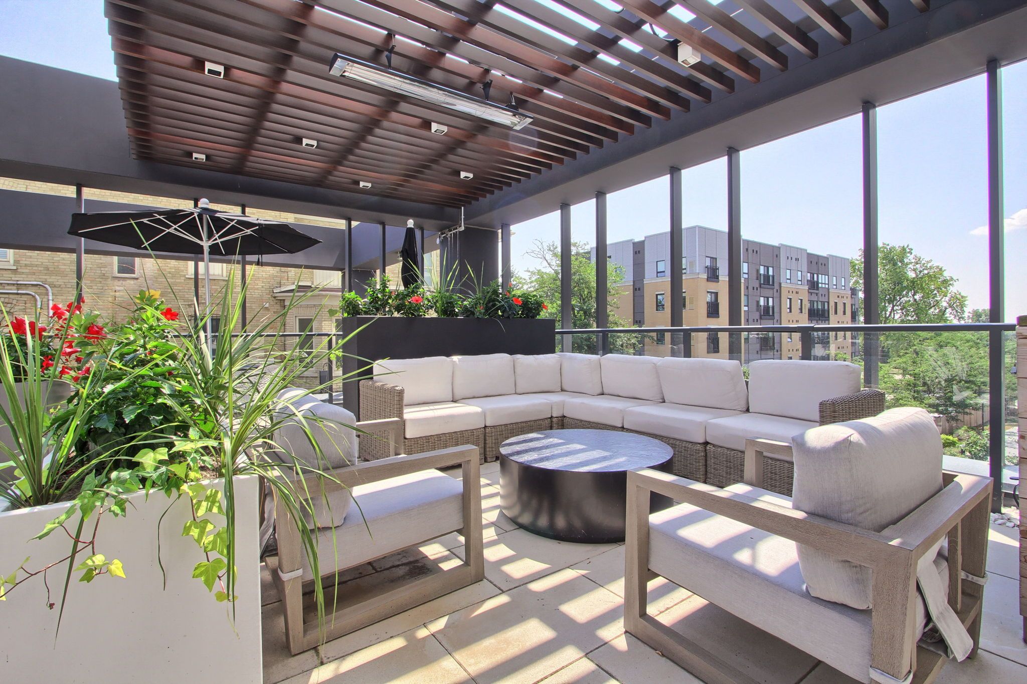 • Premium amenities like fitness center, sauna, and outdoor terrace available.