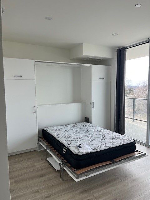 Look no further disrable bachelor studio condo living in the heart of kitchener-waterloo communityspacious open concept with natural light as well wih natural colours plenty of storage space queen size murphey bed wall unit bilut in appliances state of the art technology in suite control screen keyless entry key pad pot lights throughout massive 205 soft of terrance space, biulding amenties include, party room, rooftop lounge area, saunas and much more. Public transit at your door step, steps to grand river hospital, google hq, sun life hq, university of waterloo shops, groceries, and downtown.