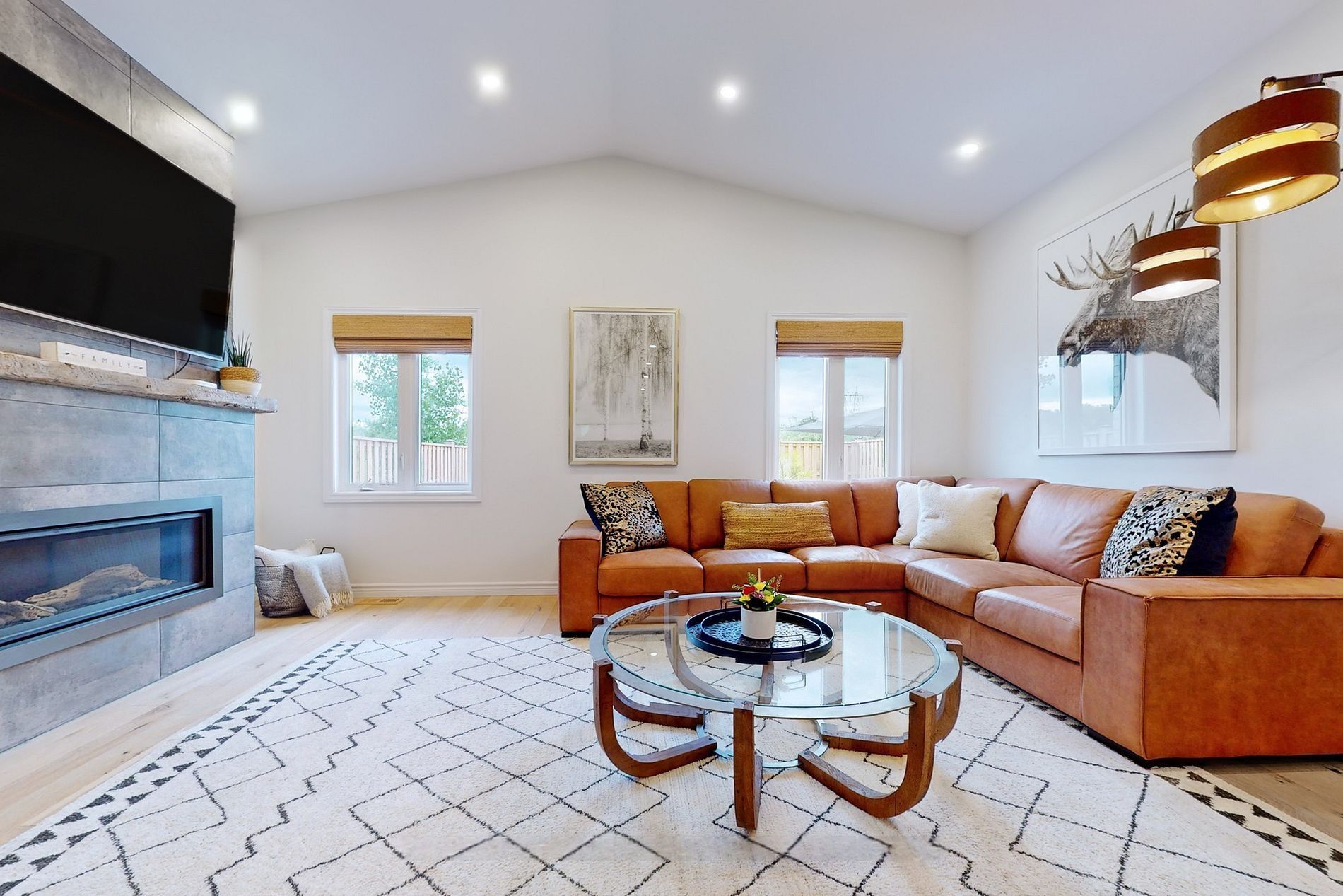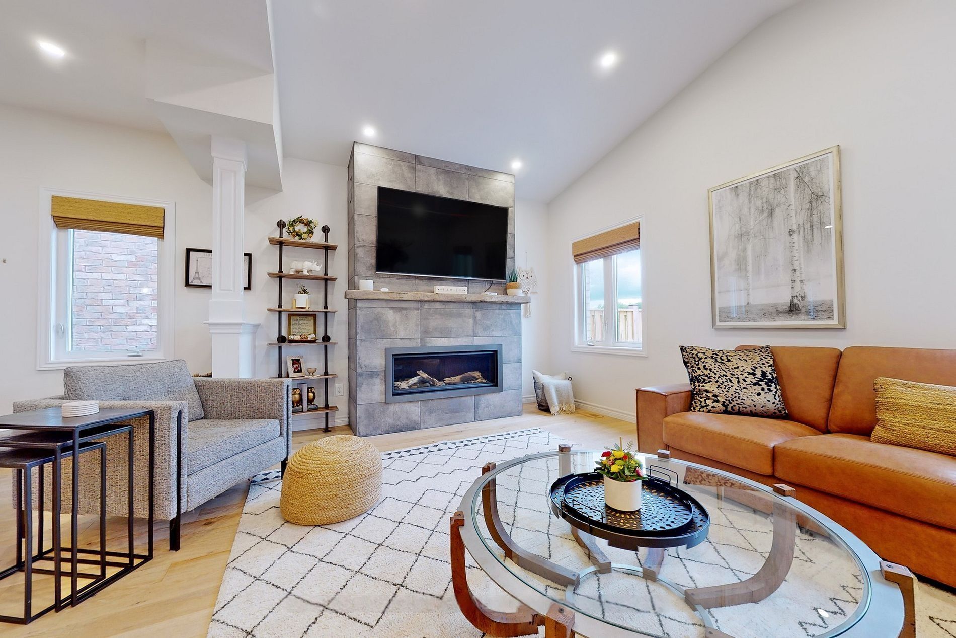 • Open living and dining area with vaulted ceiling and electric fireplace.