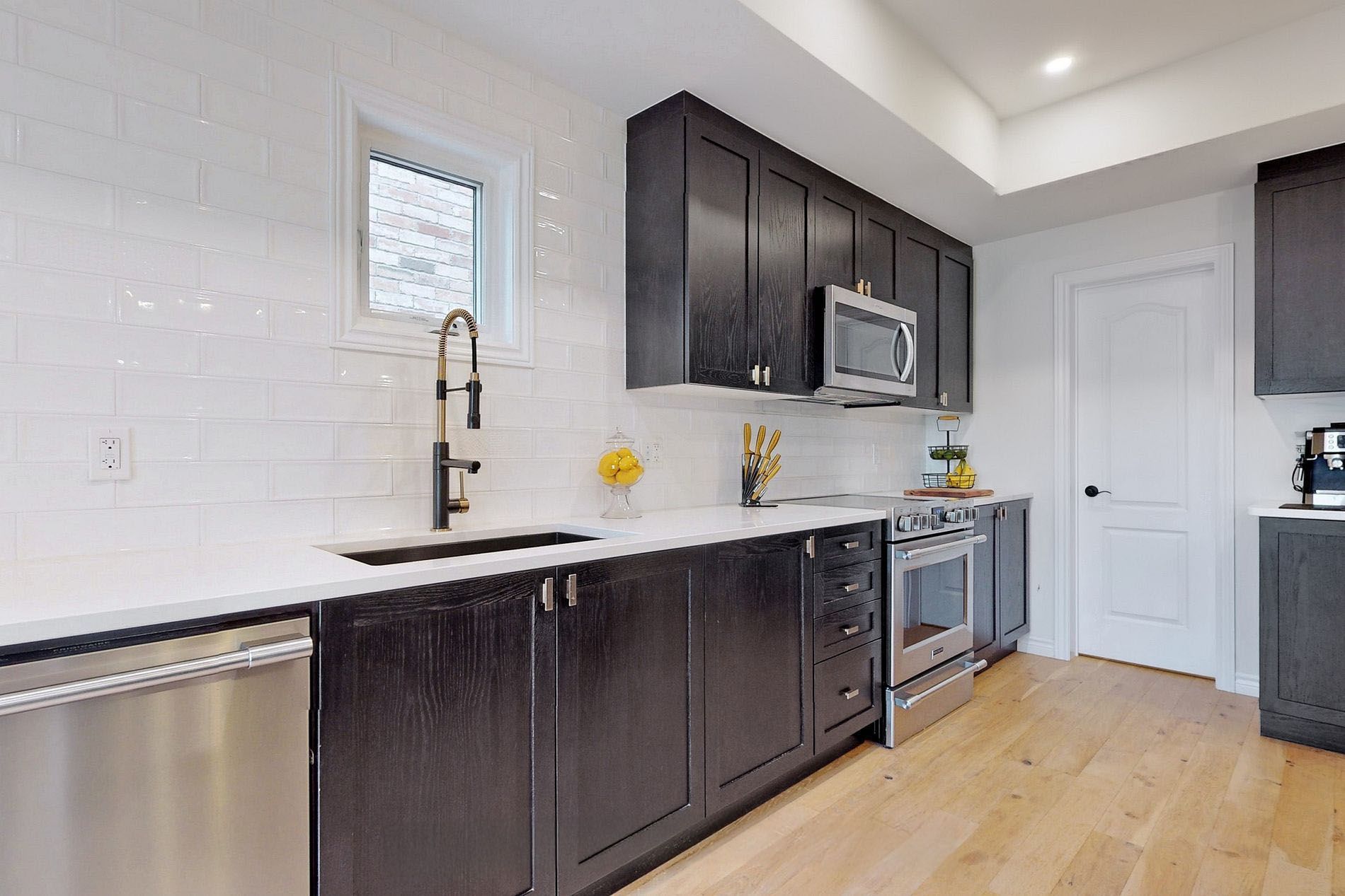 • Designer kitchen equipped with a large quartz island and beverage fridge.