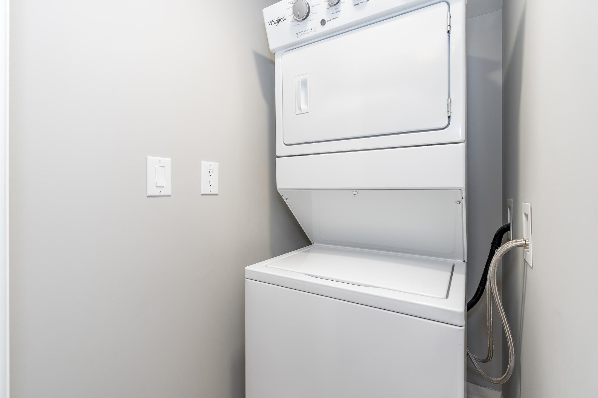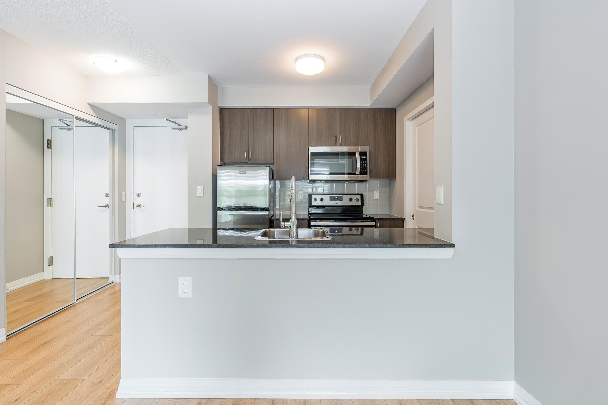 • Modern kitchen with quartz countertops and elegant laminate flooring throughout.