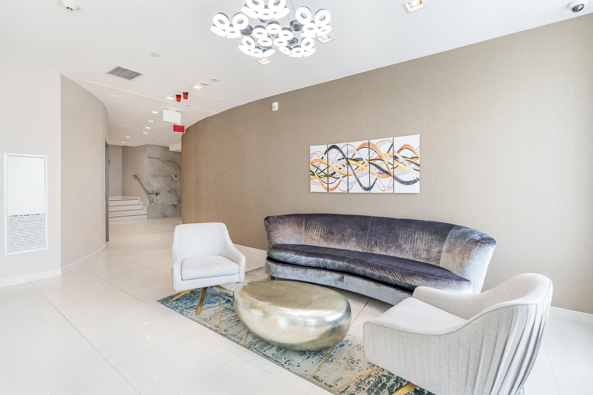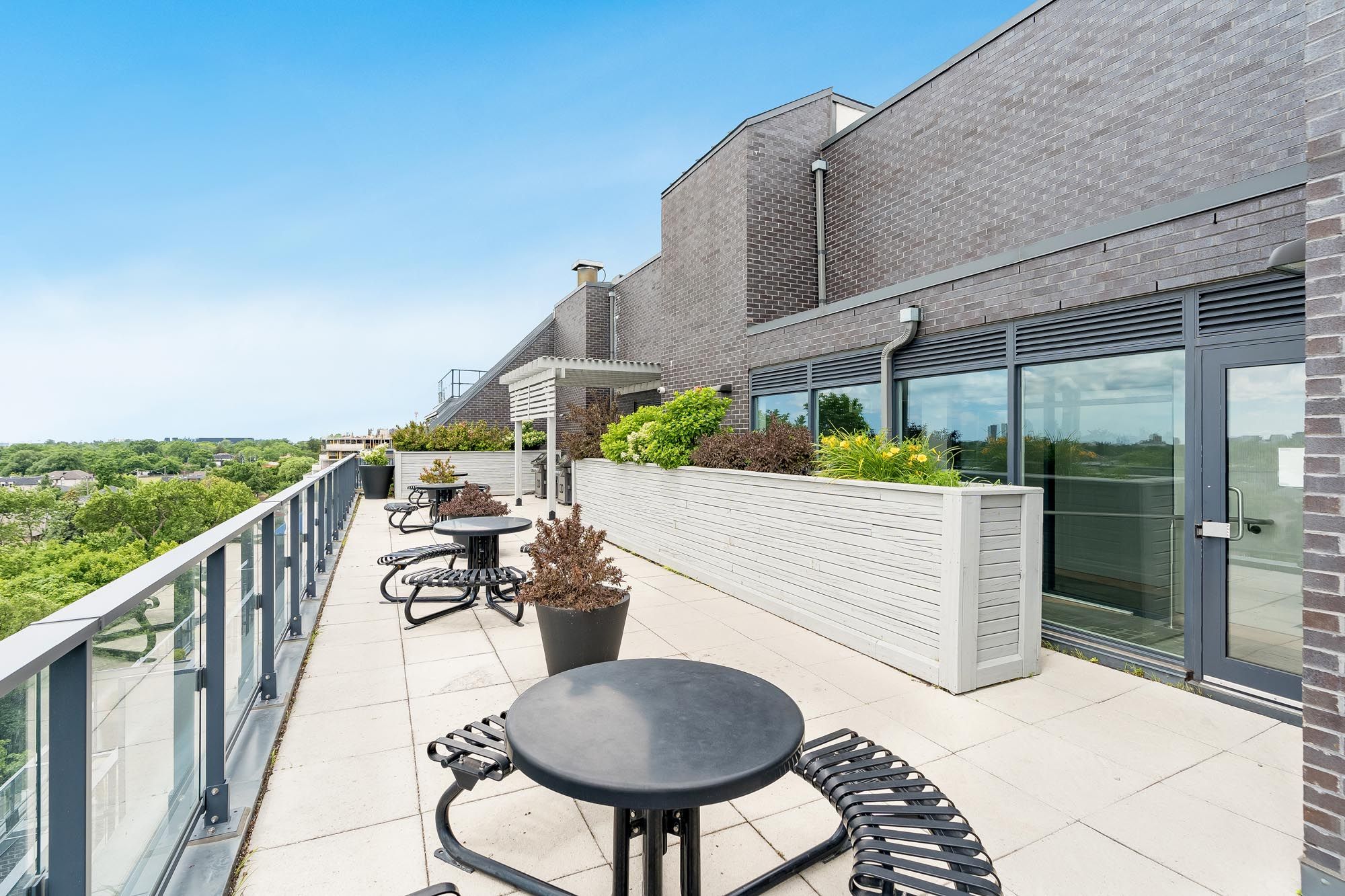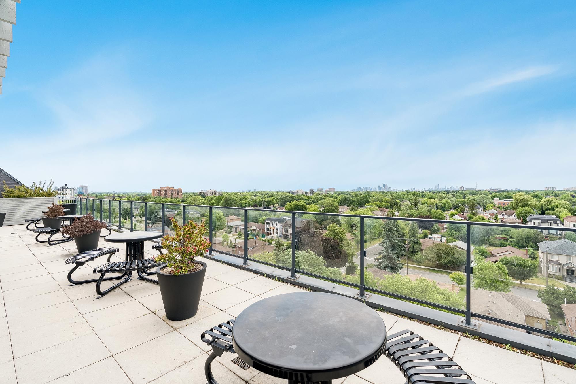 • Access to a rooftop terrace, fitness center, sauna, and party room.