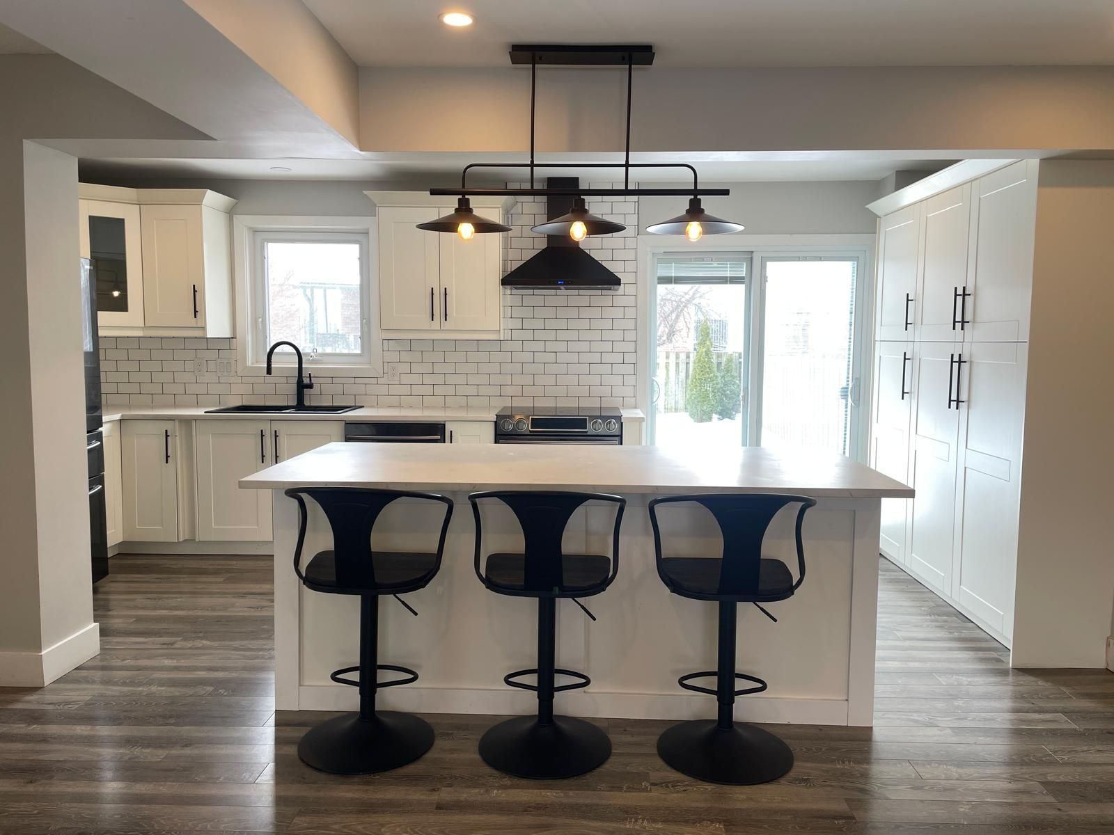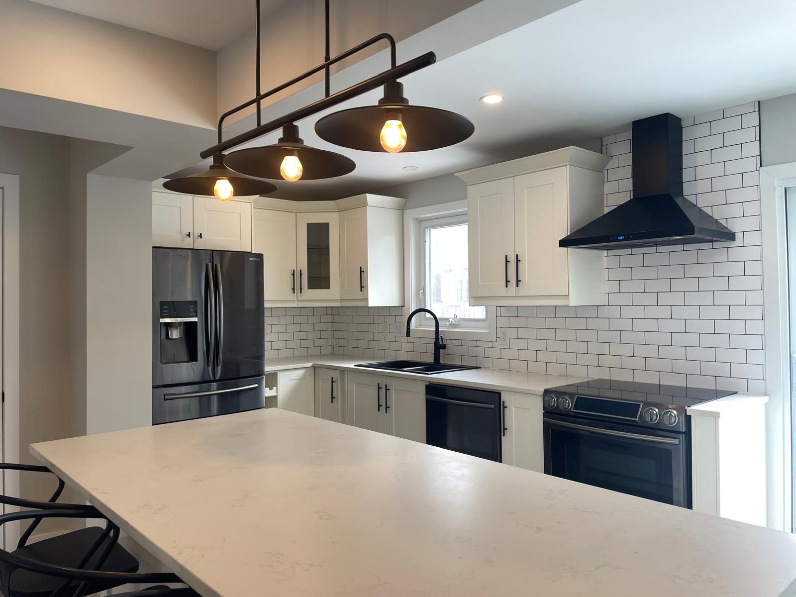 • Stylish white kitchen with quartz countertops and black stainless steel appliances.