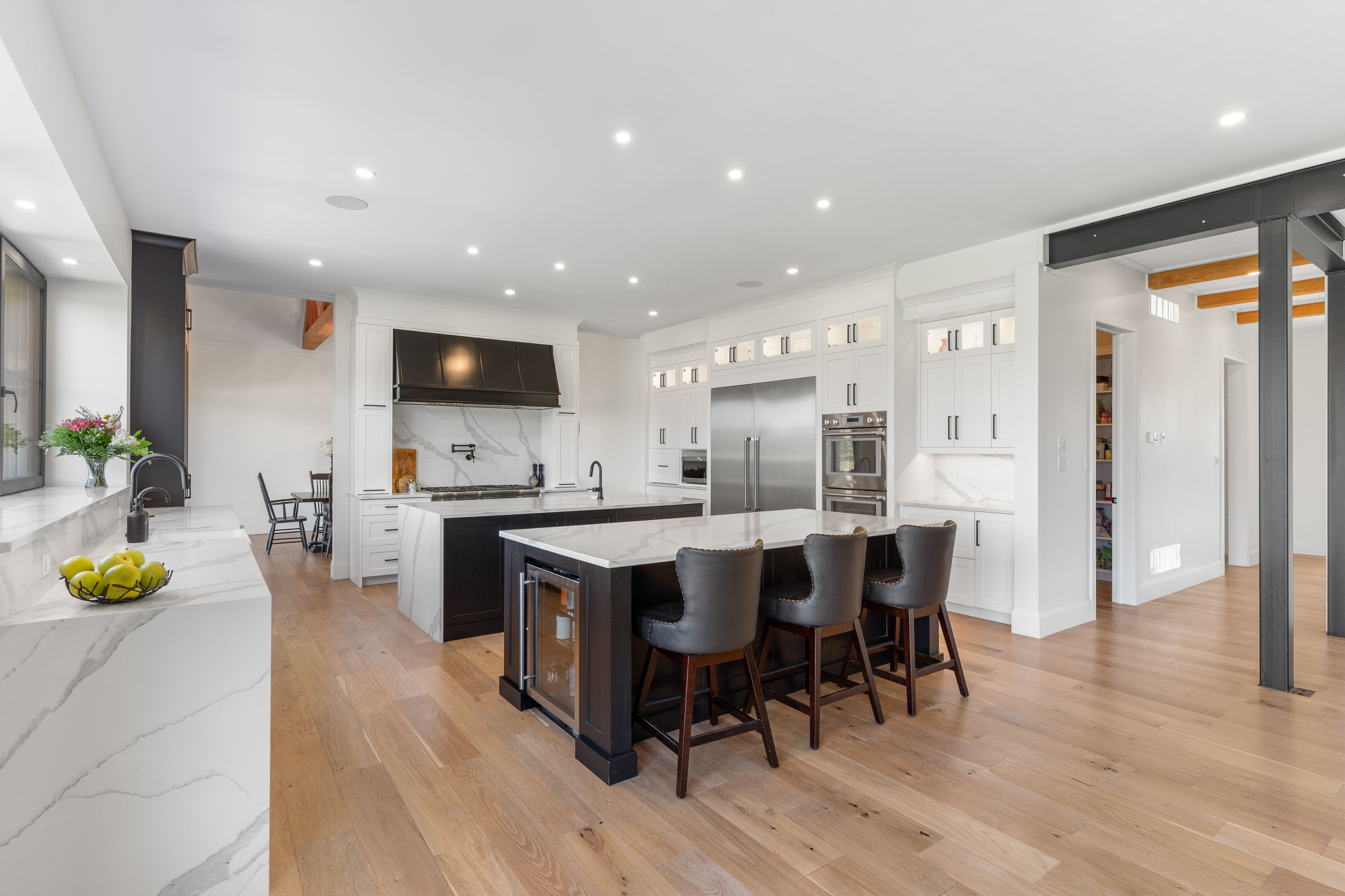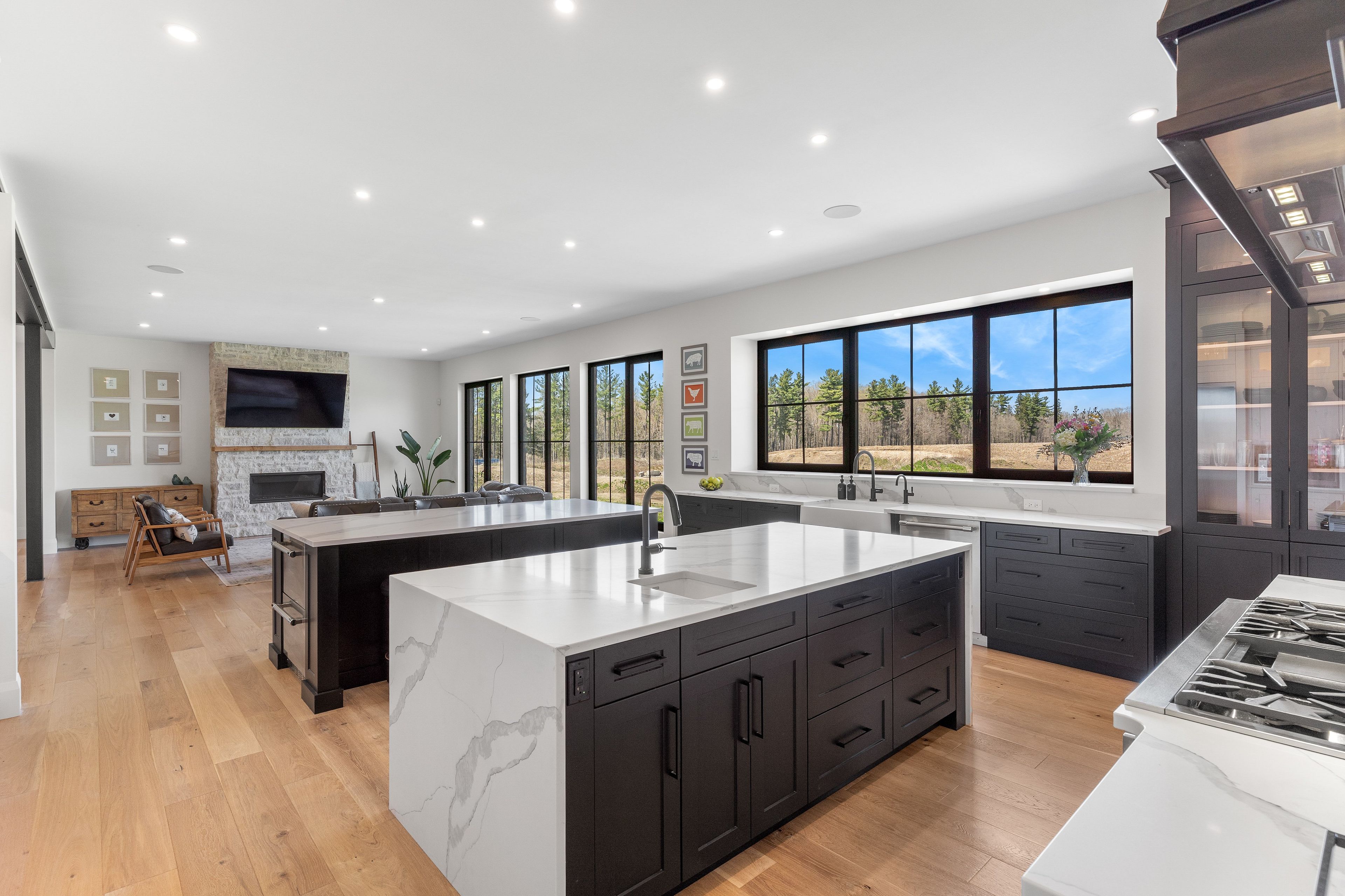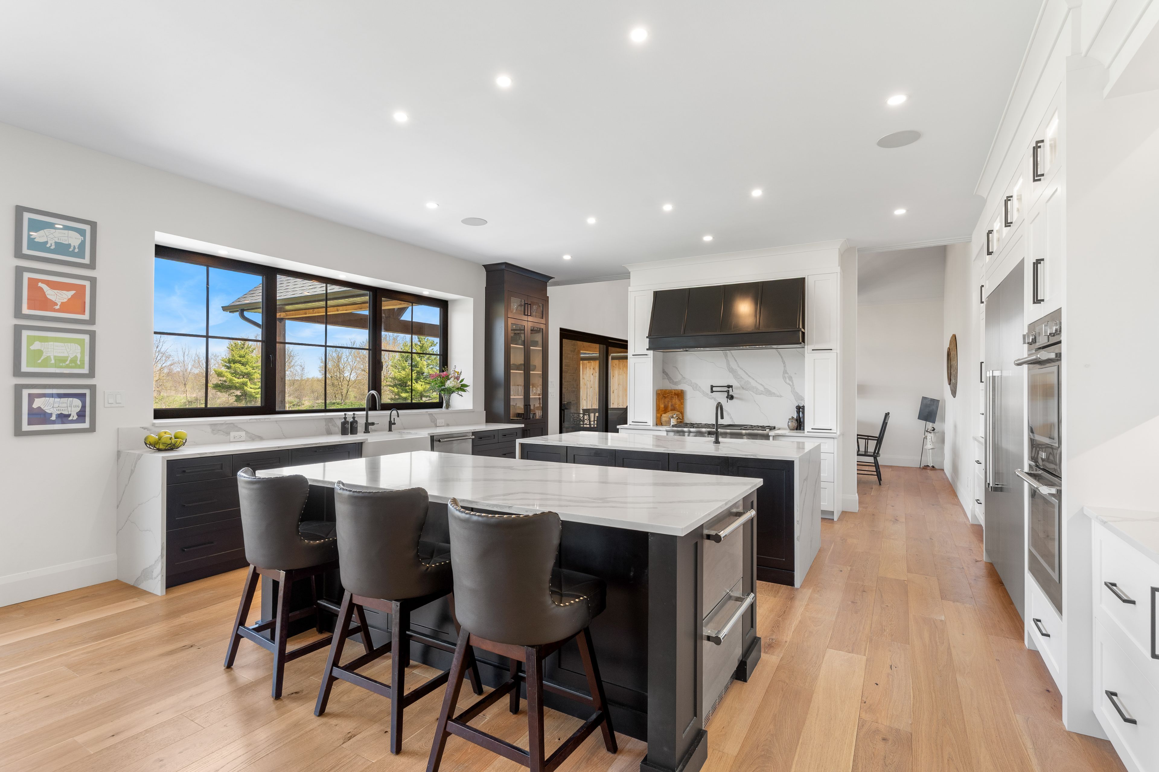 • Inviting gourmet kitchen with double islands and high-end Thermador appliances.