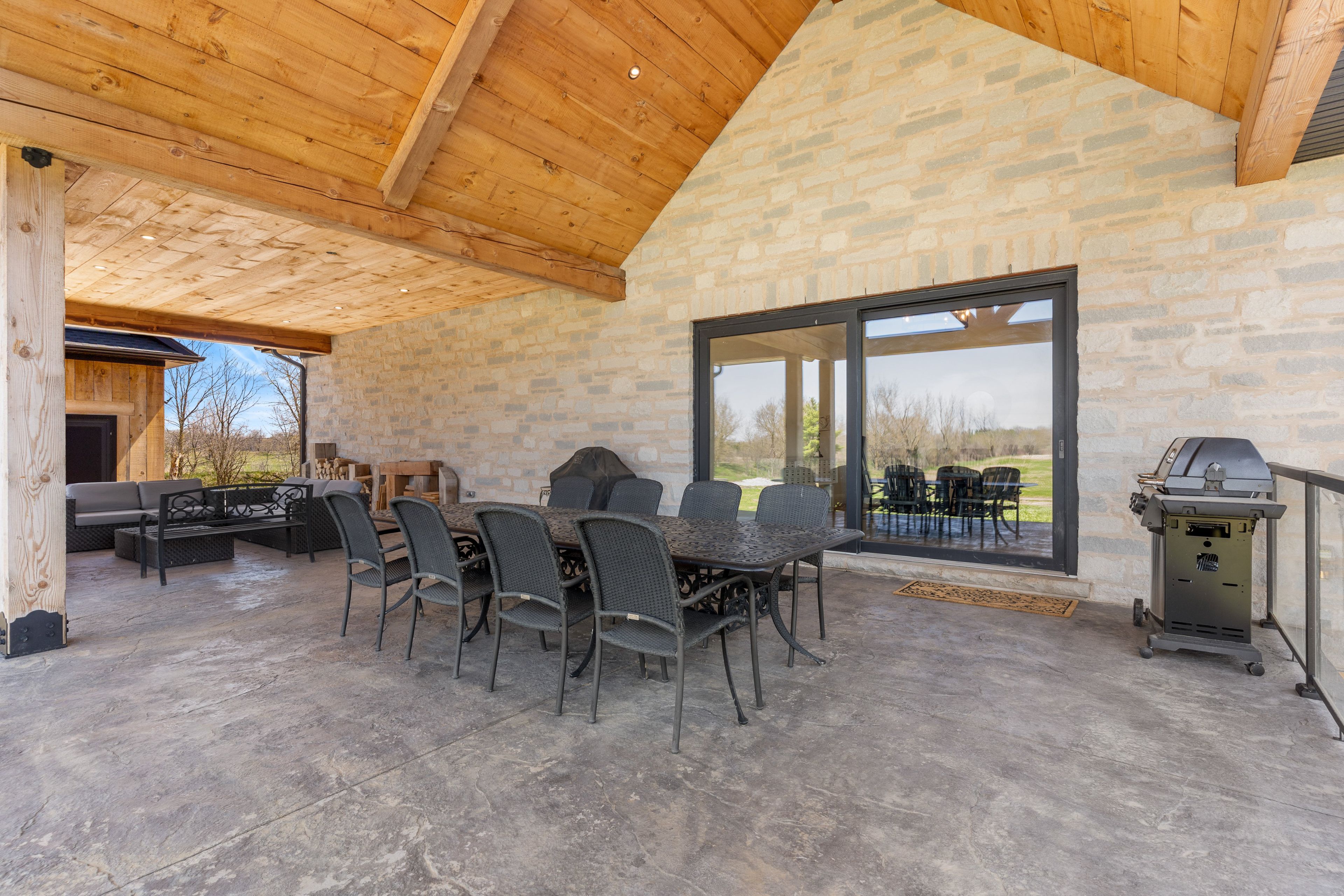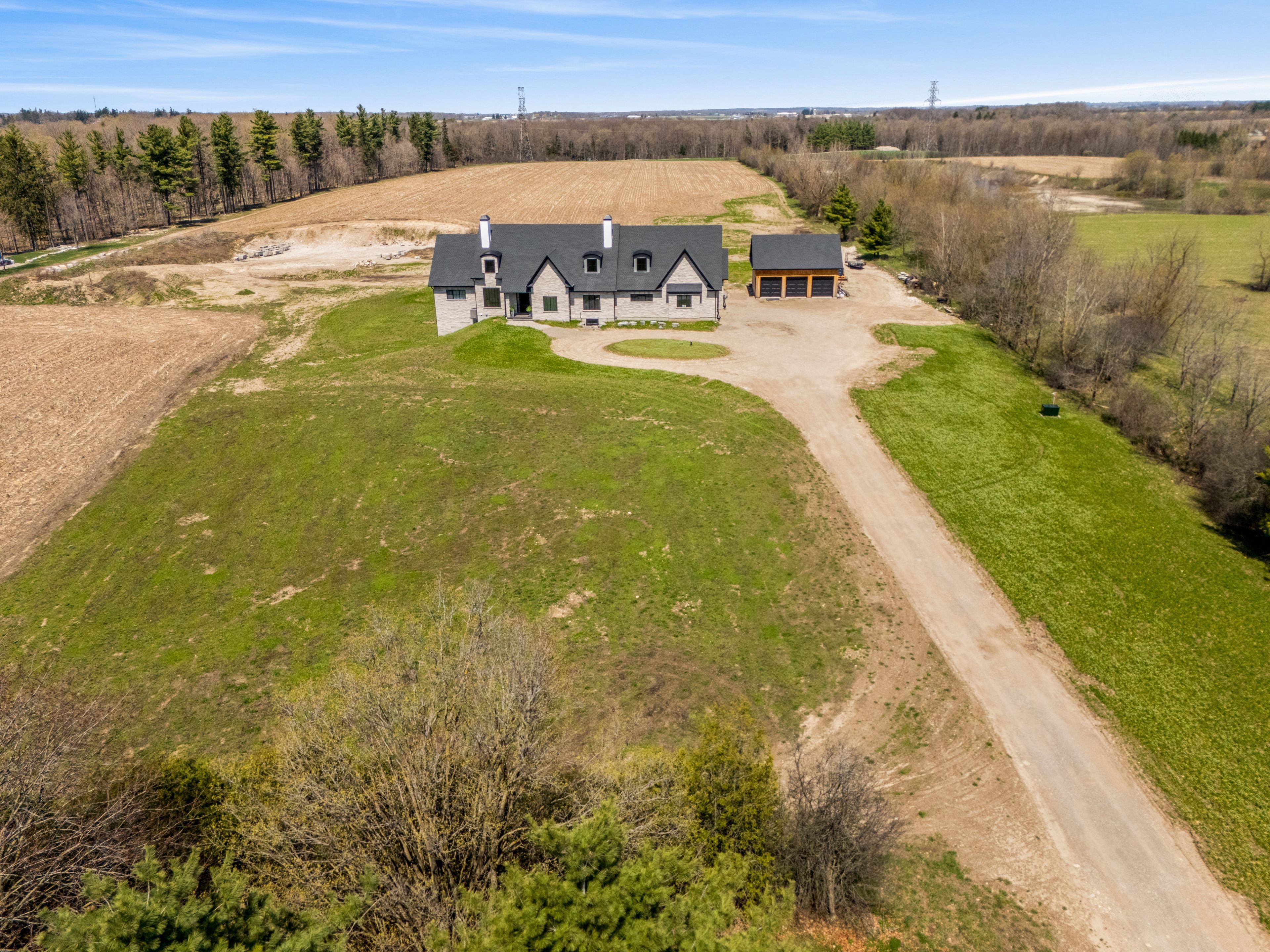 French château-inspired country estate set on 22 private acres, offering nearly 8,400 sq. Ft. Of finished living space blending timeless craftsmanship with modern luxury. The residence features a hand-laid stone exterior, steeply pitched rooflines, symmetrical façade, and soaring chimneys. A long private drive leads to a circular gravel courtyard, while oversized windows capture panoramic views from sunrise to sunset. Ideally located in a quiet waterloo enclave, with the grand river at one end and canada's tech hub at the other, this is a rare offering on prestigious country squire-known for estate living, acreage, and exceptional privacy. A custom 9-ft mahogany door opens to an interior defined by scale: 10-ft ceilings, wide-plank oak floors, vaulted tongue-and-groove ceilings, exposed douglas fir beams, and iron accents. The dining room is ideal for entertaining, filled with natural light. The gourmet kitchen features double islands, quartz counters, beverage fridge, and thermador appliances including gas range, double ovens, and full-size fridge/freezer, plus pot filler and farmhouse sink. The home offers 5 bedrooms and 6 bathrooms, including 4 ensuites with heated floors. The main-floor primary suite features vaulted ceilings, fireplace, hidden sunroom, and a spa-like ensuite with walnut vanity, glass shower, and soaker tub. A loft leads to a private suite and lounge. The finished walkout basement includes a fireplace, gym, sauna rough-in, 3 ensuite bedrooms, and a large rec room. A secondary staircase connects to the 6-car garage with ev rough-in. Premium systems include 600-amp service, viessmann boiler, natural gas, and 4-zone hvac. In-floor heating extends through key areas. With 4 fireplaces and a timber-framed rear porch, this estate offers seamless indoor-outdoor living. The grounds are a blank canvas for a luxury landscape or private retreat. A detached 3-bay garage adds space for 6 more vehicles. A rare opportunity in a highly desirable community.