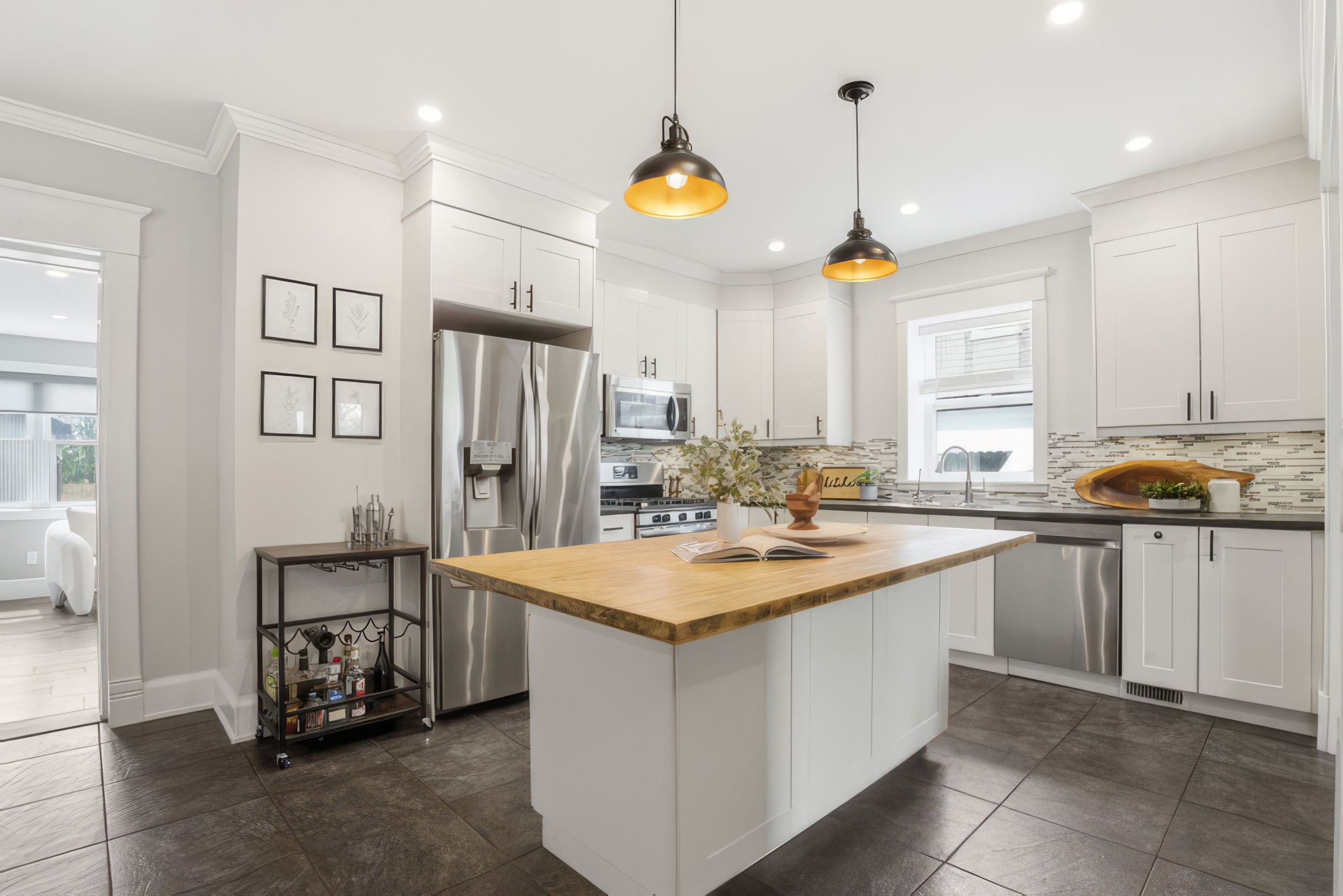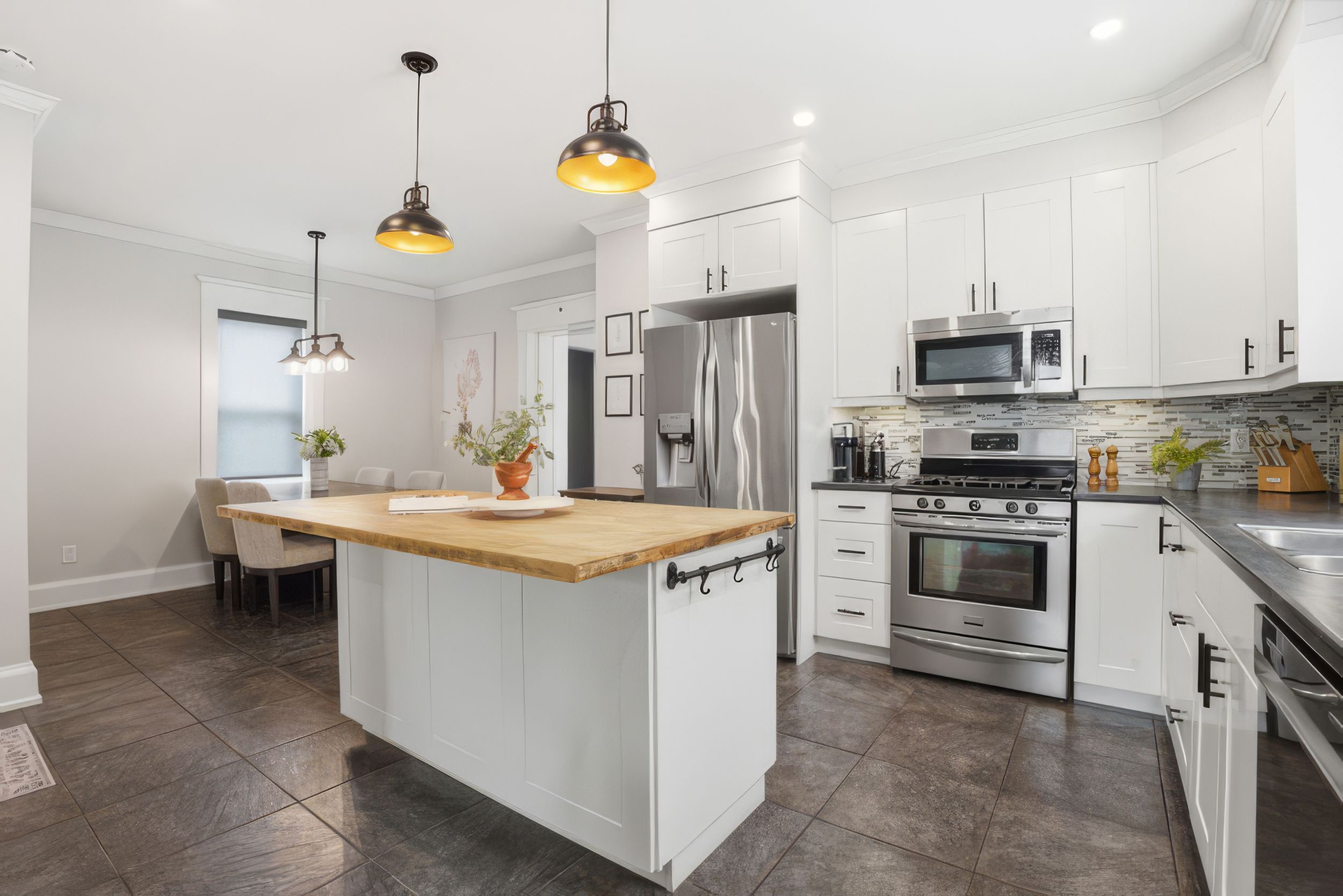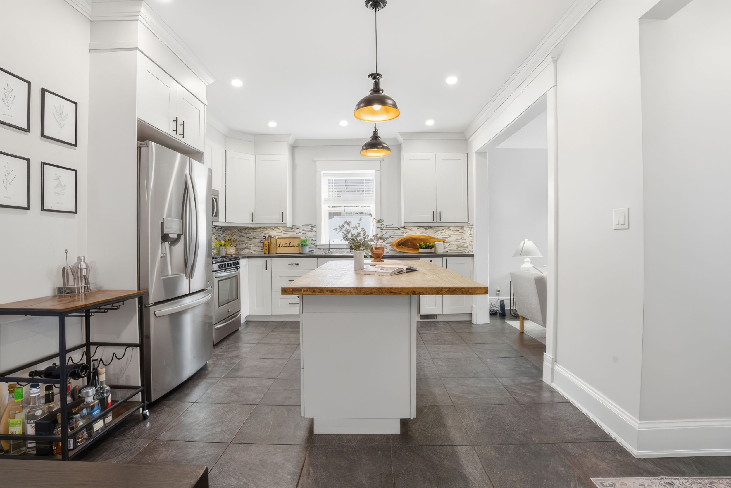 • Stylish kitchen with solid wood island and new stainless-steel appliances.