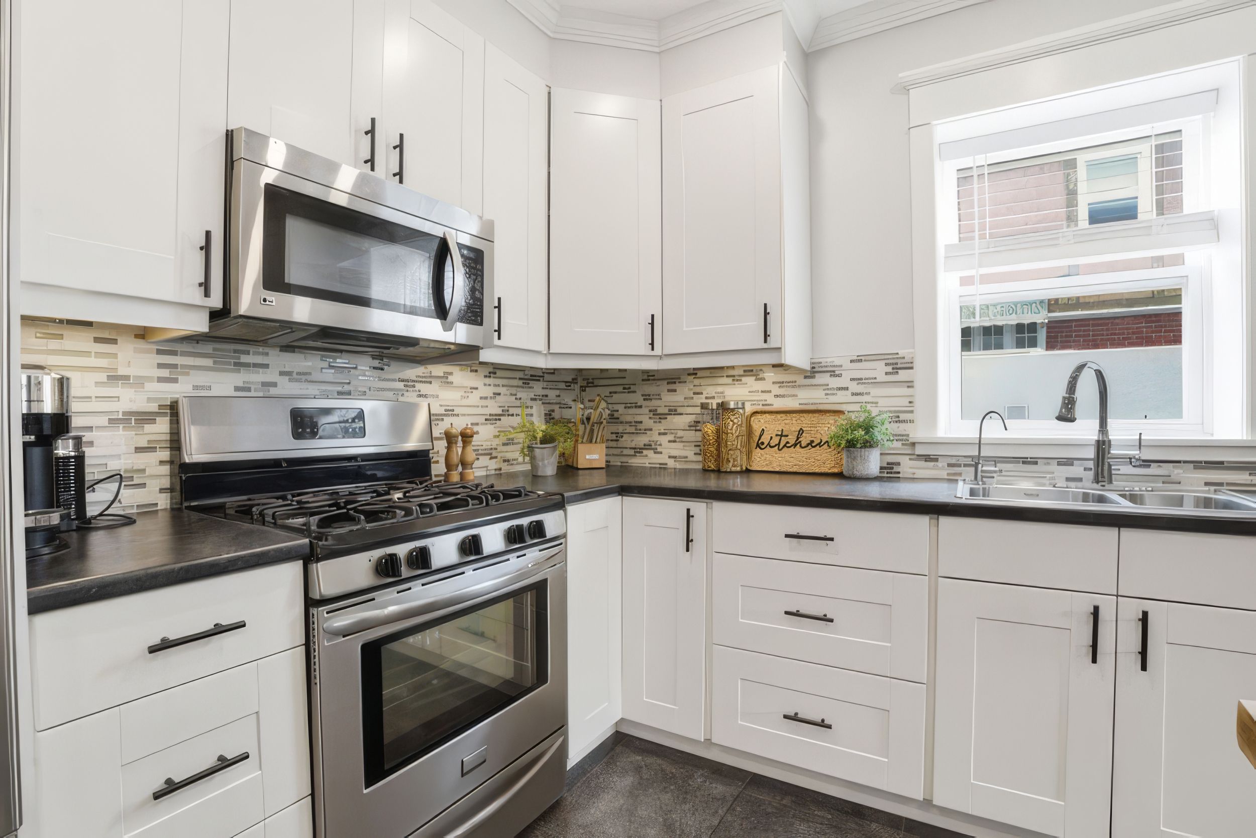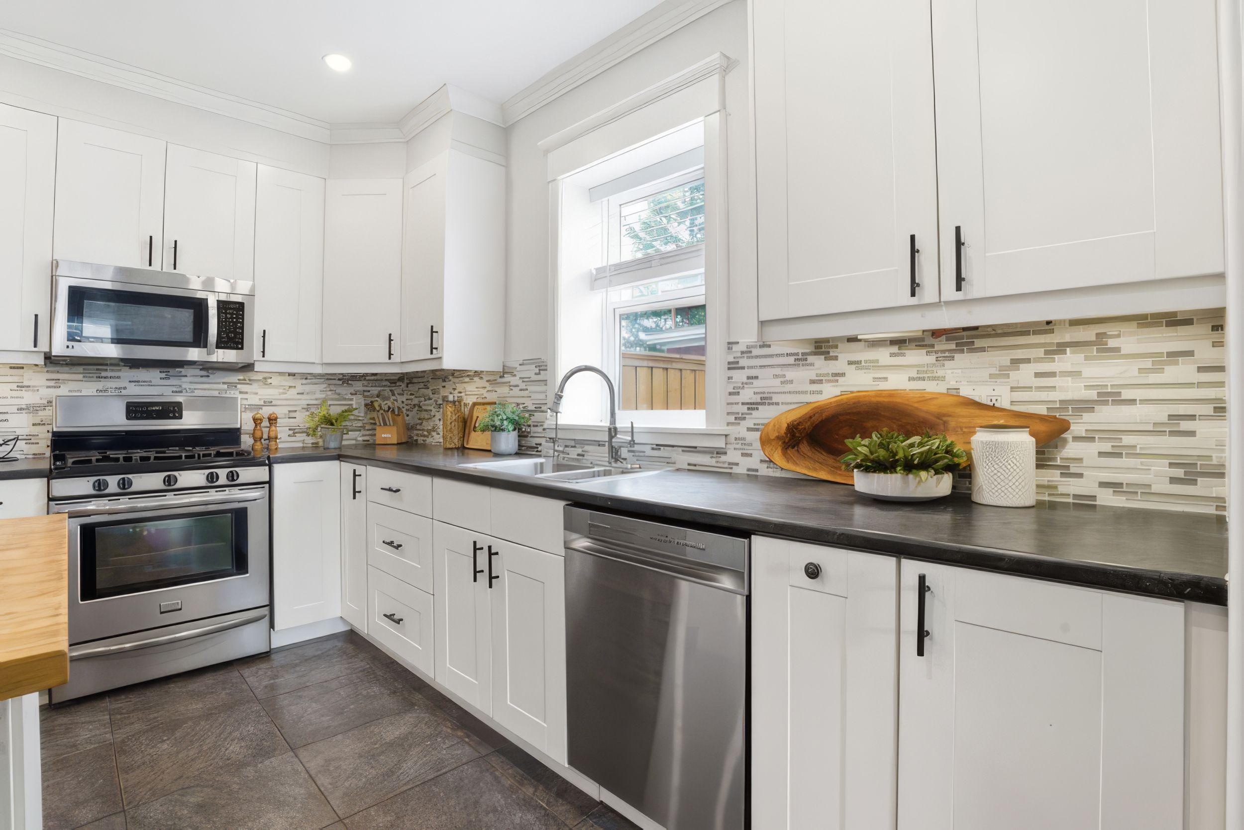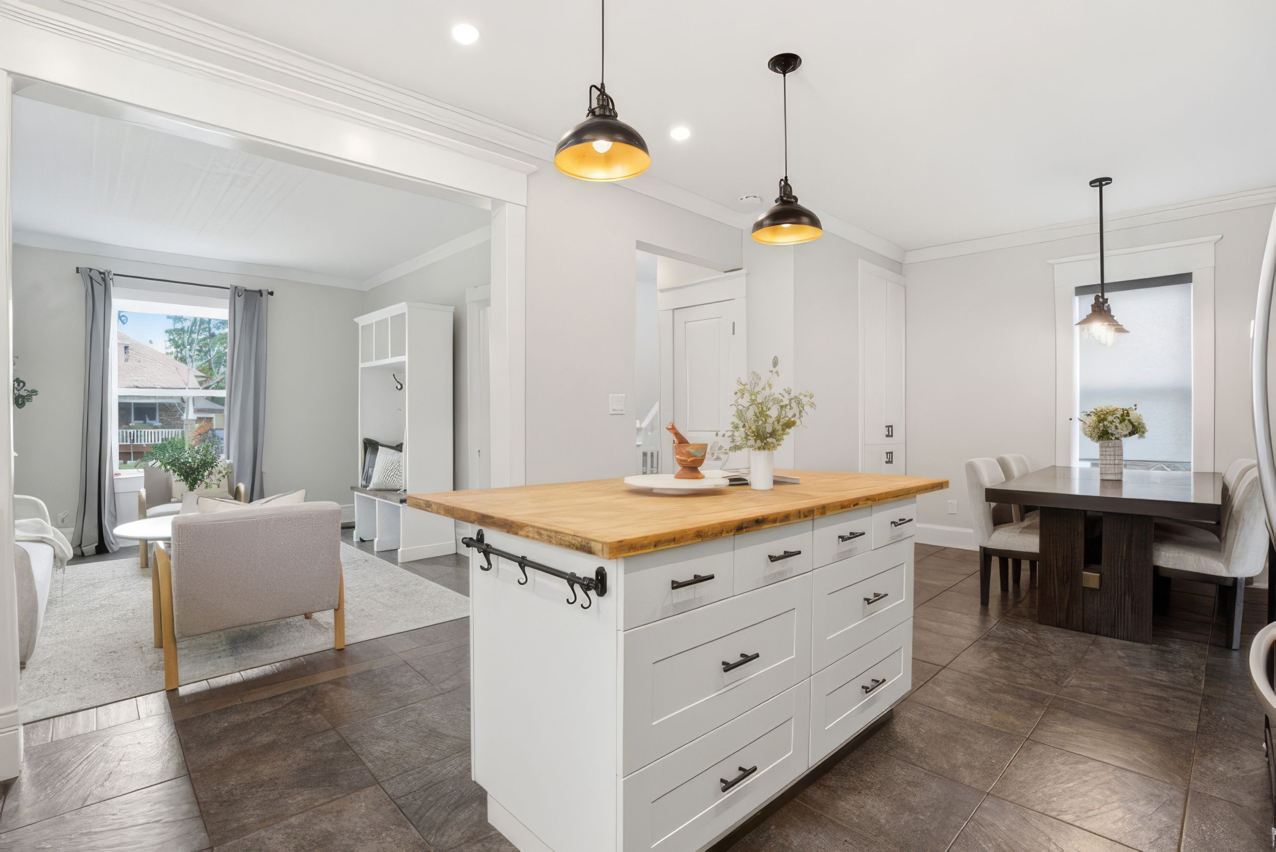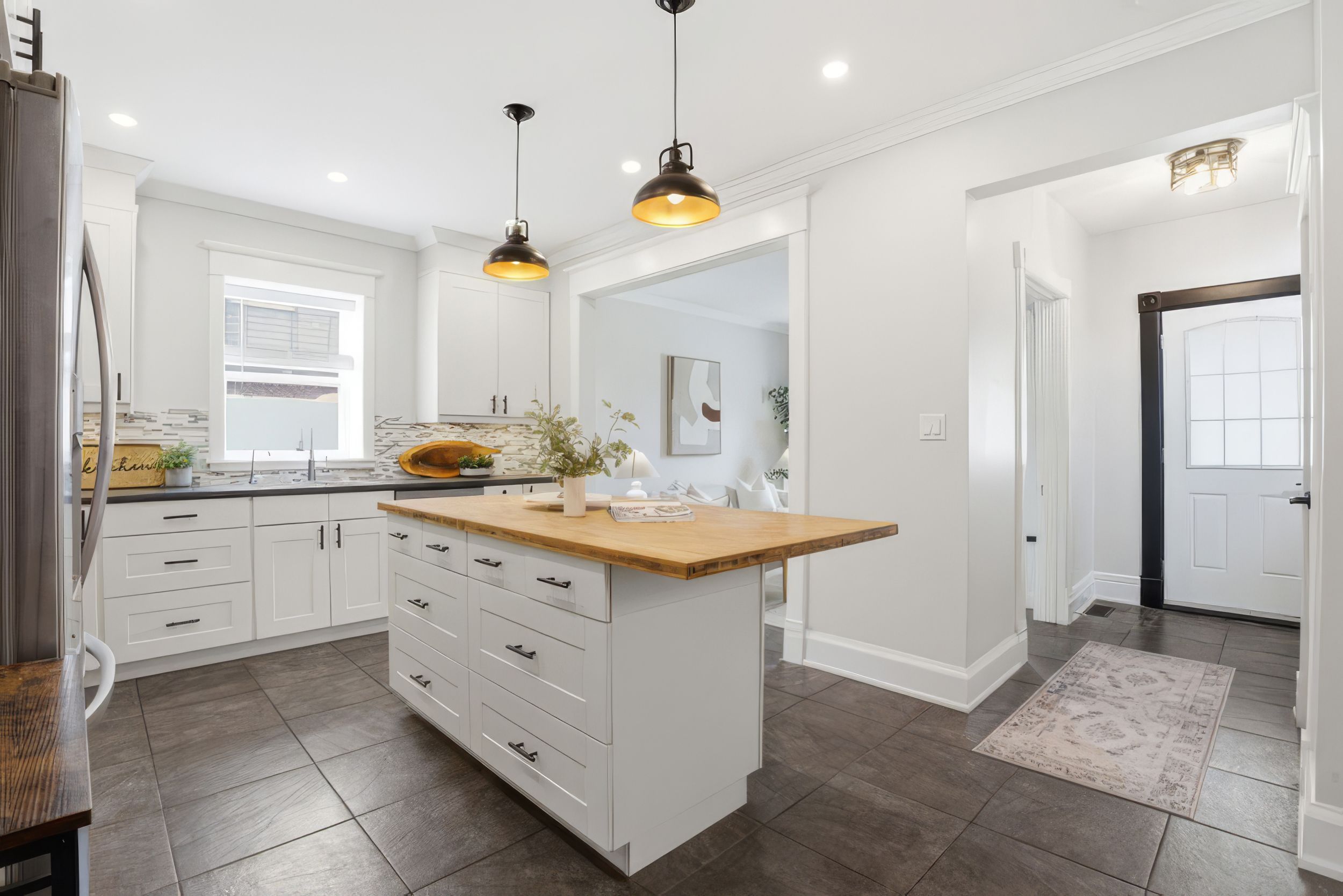 • Stylish kitchen with solid wood island and new stainless-steel appliances.