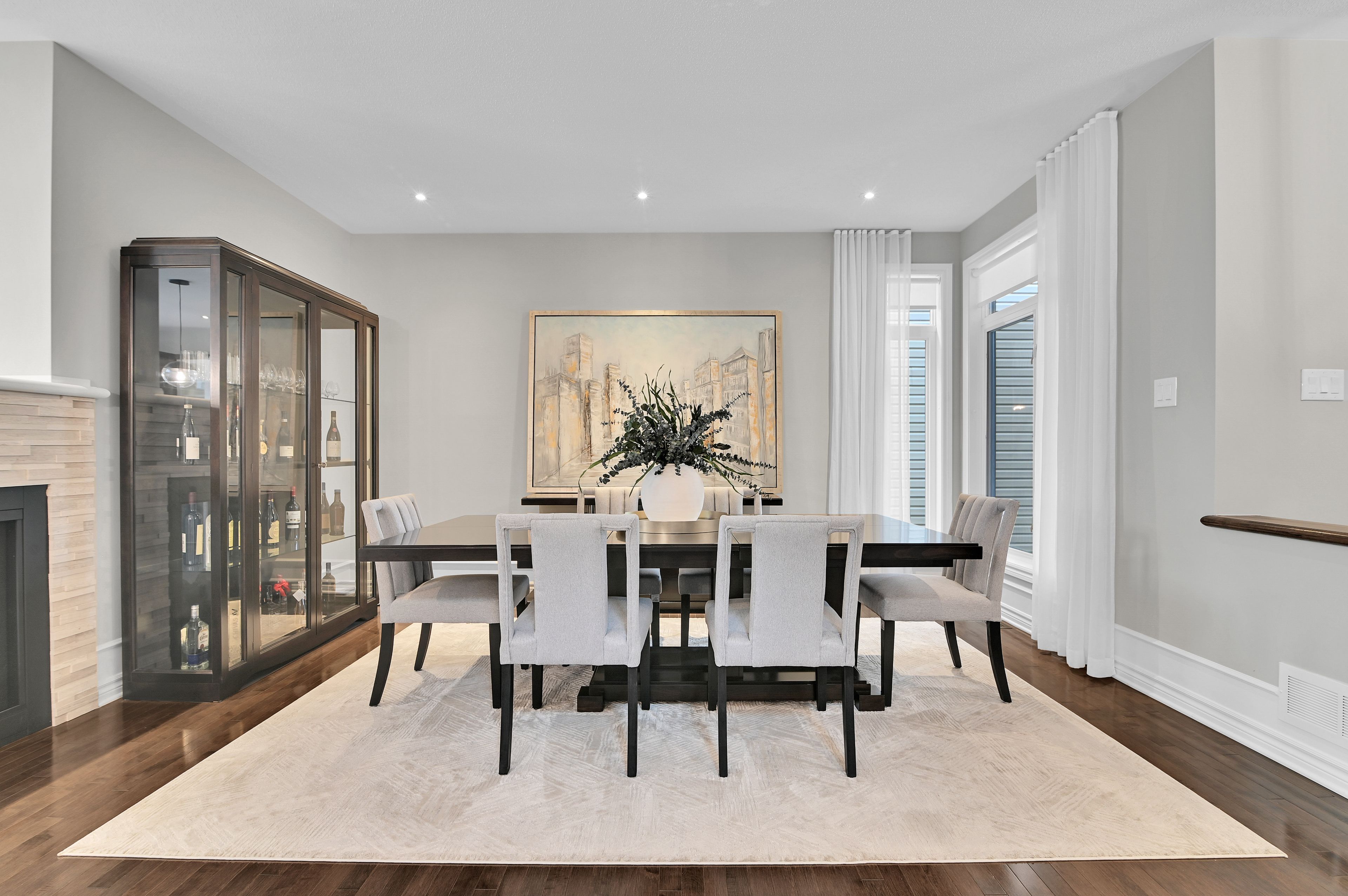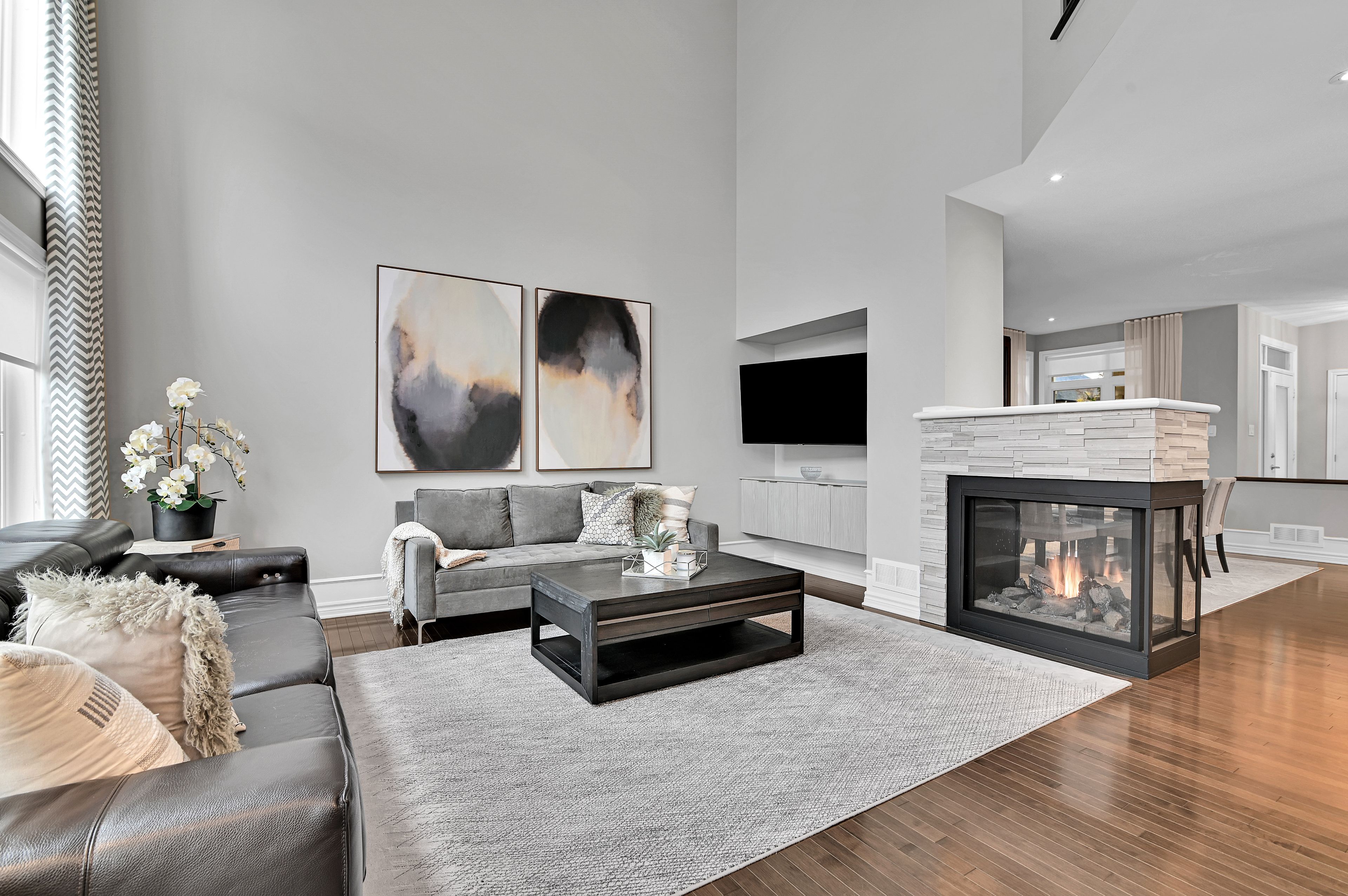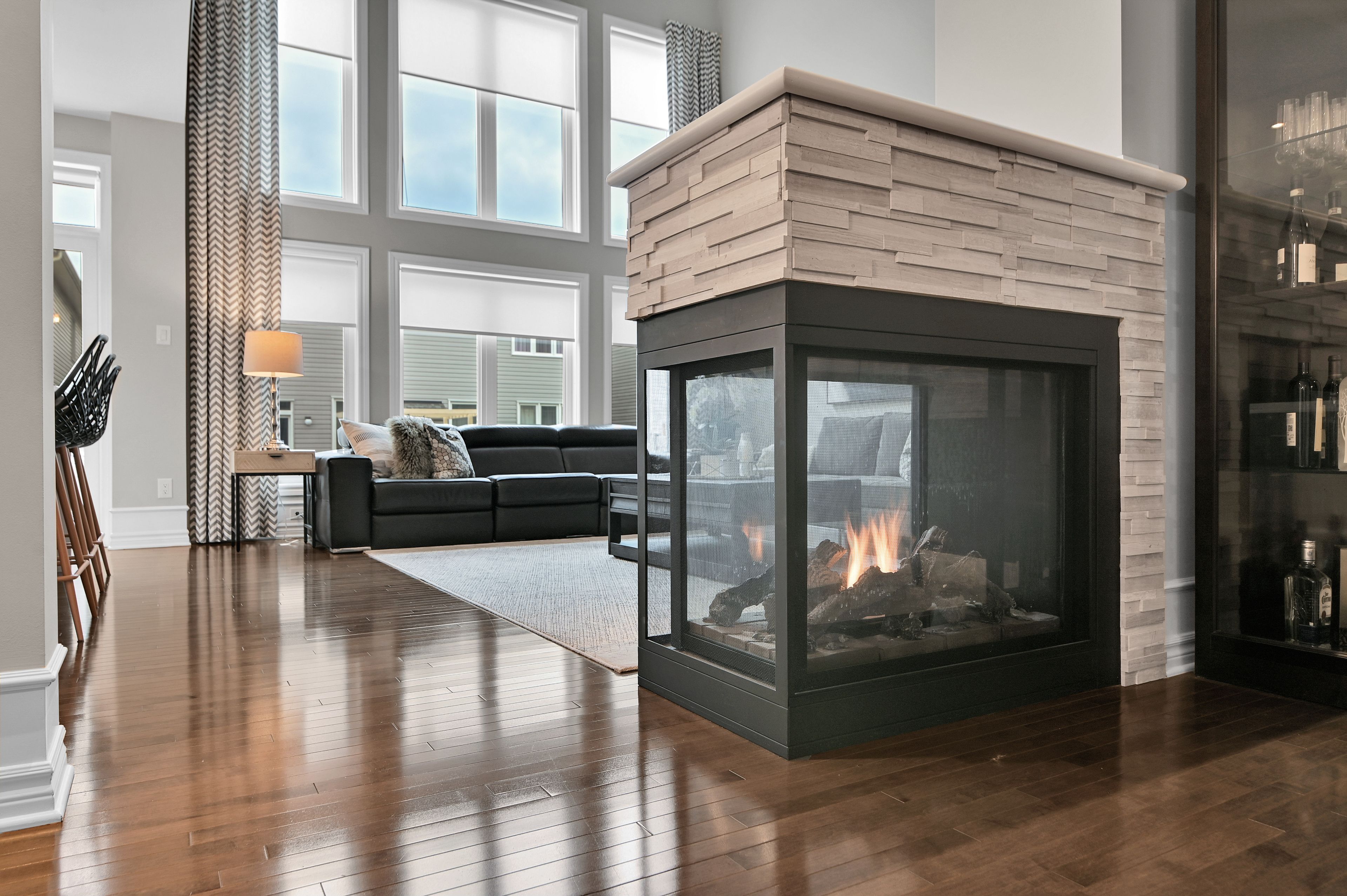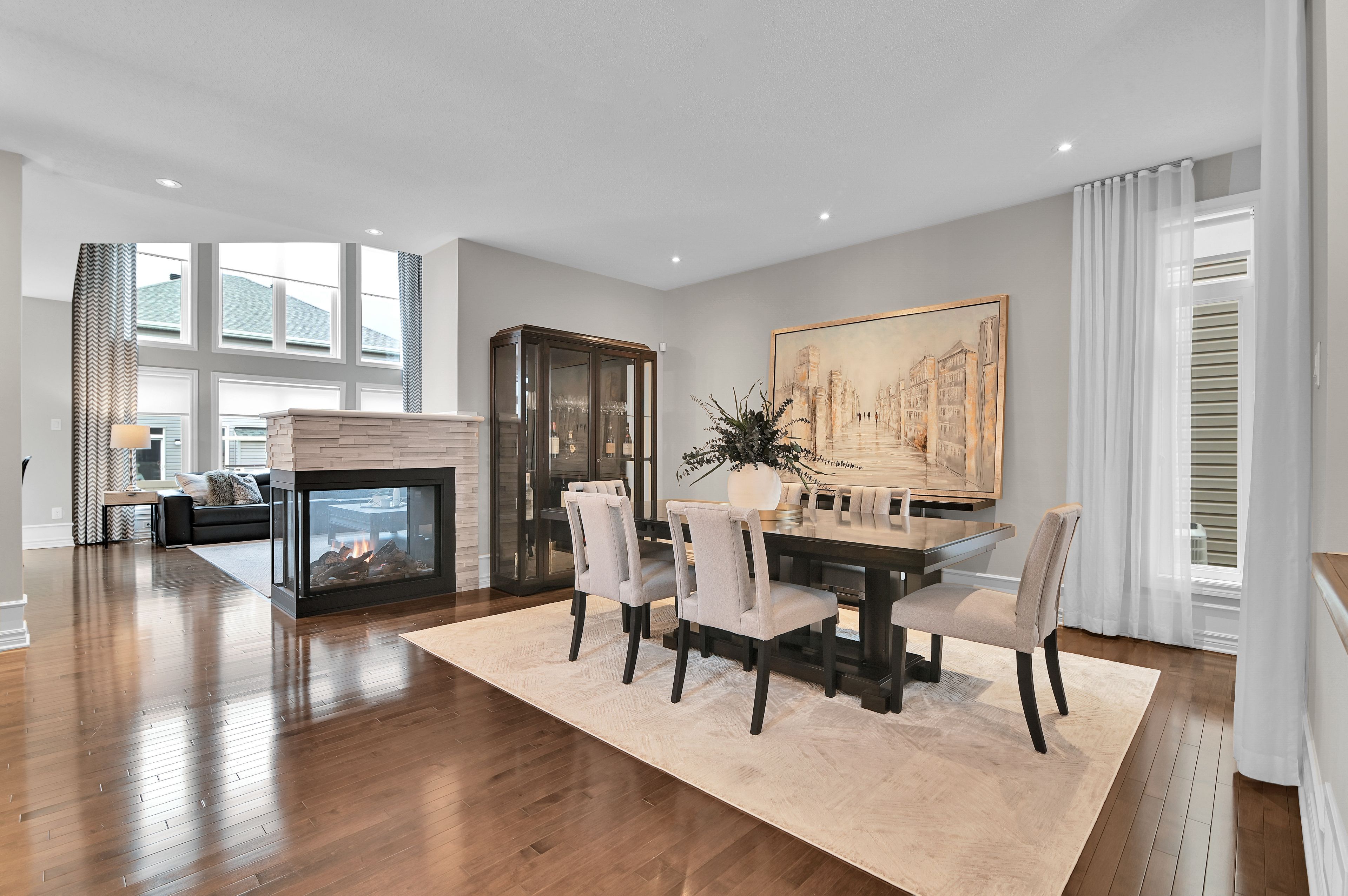 This exquisite 3 bedroom + loft, 4 bath, former model home offers a perfect blend of open concept and modern design creating spacious, well connected living areas and clean aesthetics. The combination of the layout and the soaring windows maximize flow and natural light. Elegant finishes are found throughout this home, along with a consistent, calm color palette. The stunning triple-sided fireplace anchors the main level and is enjoyed from every room. You will love the chef's kitchen with euro cabinets, striking waterfall quartz counter on the oversized island, multiple work surfaces and storage that maximizes space and functionality. Adding to the main level is the generous foyer with 2 closets, a 2 piece powder room and a designated mud room with custom built-in cabinetry for keeping things organized. The upper level provides 3 spacious bedrooms including the primary which offers a luxurious spa-like ensuite, walk-in closet and access to a private balcony! There is also a large loft overlooking the family room offering a spacious, airy feel and can be used for a variety of purposes. The laundry room with useful added cabinetry and upgraded main bath complete the second level. The expansive, professionally finished basement offers versatile living space and is complete with a beautifully finished 4 piece bathroom and plenty of storage. On the exterior you will appreciate the welcoming curb appeal, exterior potlights, beautifully landscaped backyard with interlock patio and gas hook-up for bbq. This property is a must see and is sure to please those looking for something truly special! Ideally located close to public transportation, reputable schools, retail and more. Carpeting on stairs to 2nd level replaced in 2025. Some rooms freshly painted.