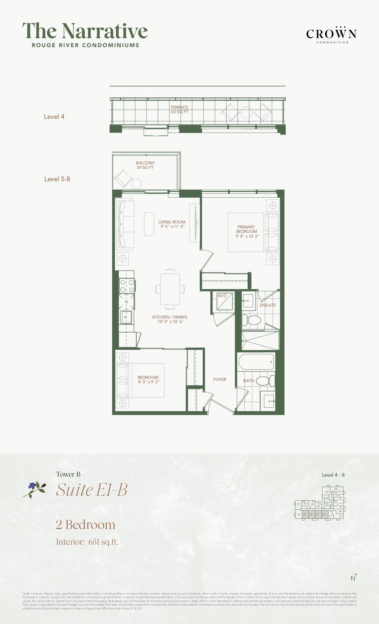Welcome to the narrative condos, located in the highly sought-after rouge community of toronto. Presenting the stunning e1b model: a brand new 651 sq. Ft. 2-bedroom, 2-bathroom condo complete with parking and a storage locker, right in the heart of rouge! Your quest for the ideal combination of city convenience and natural beauty ends here. This modern luxury suite offers an upscale living experience, surrounded by serene ravines, lush parks, scenic nature trails, and the beautiful shores of lake ontario-all while being just minutes away from highways 401 and 407, ttc and go transit, as well as vibrant shopping areas, banks, healthcare facilities, and everyday necessities. Enjoy exceptional building amenities, including a wellness center with weight and cardio equipment, a yoga studio, a children's play area, a party room, a games room, and an outdoor terrace equipped with bbqs