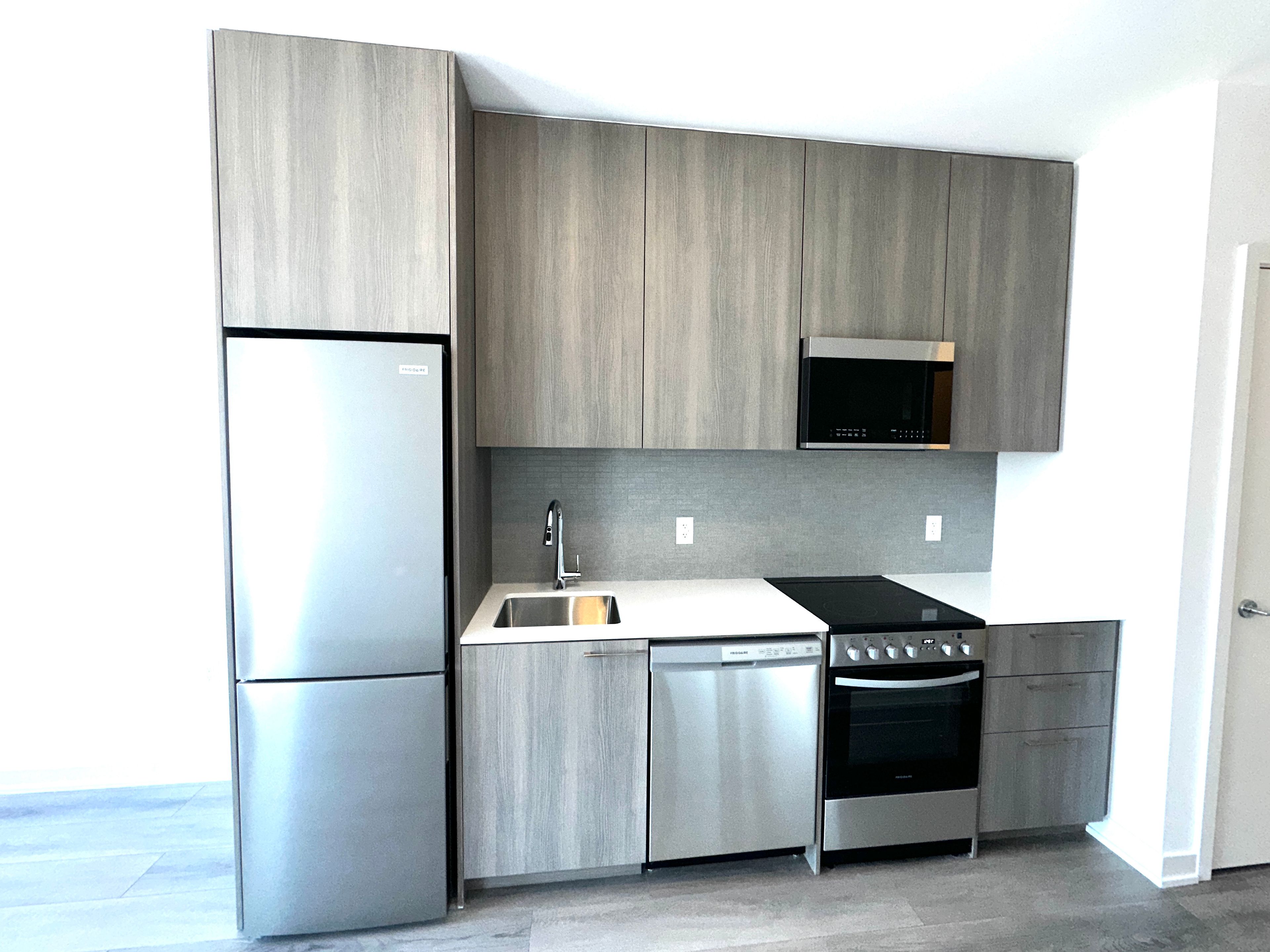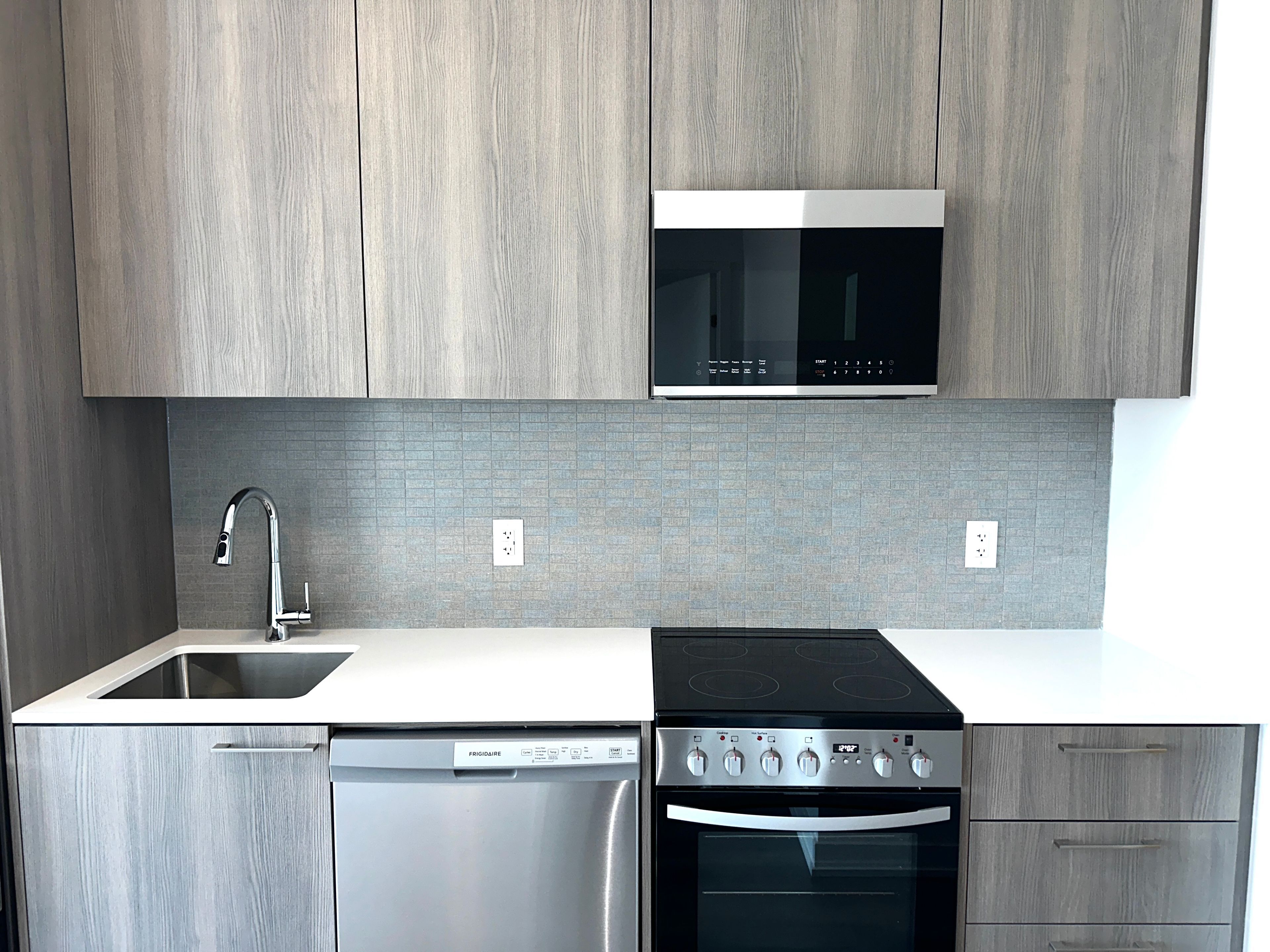 • Modern kitchen features stainless steel appliances and quartz countertops.