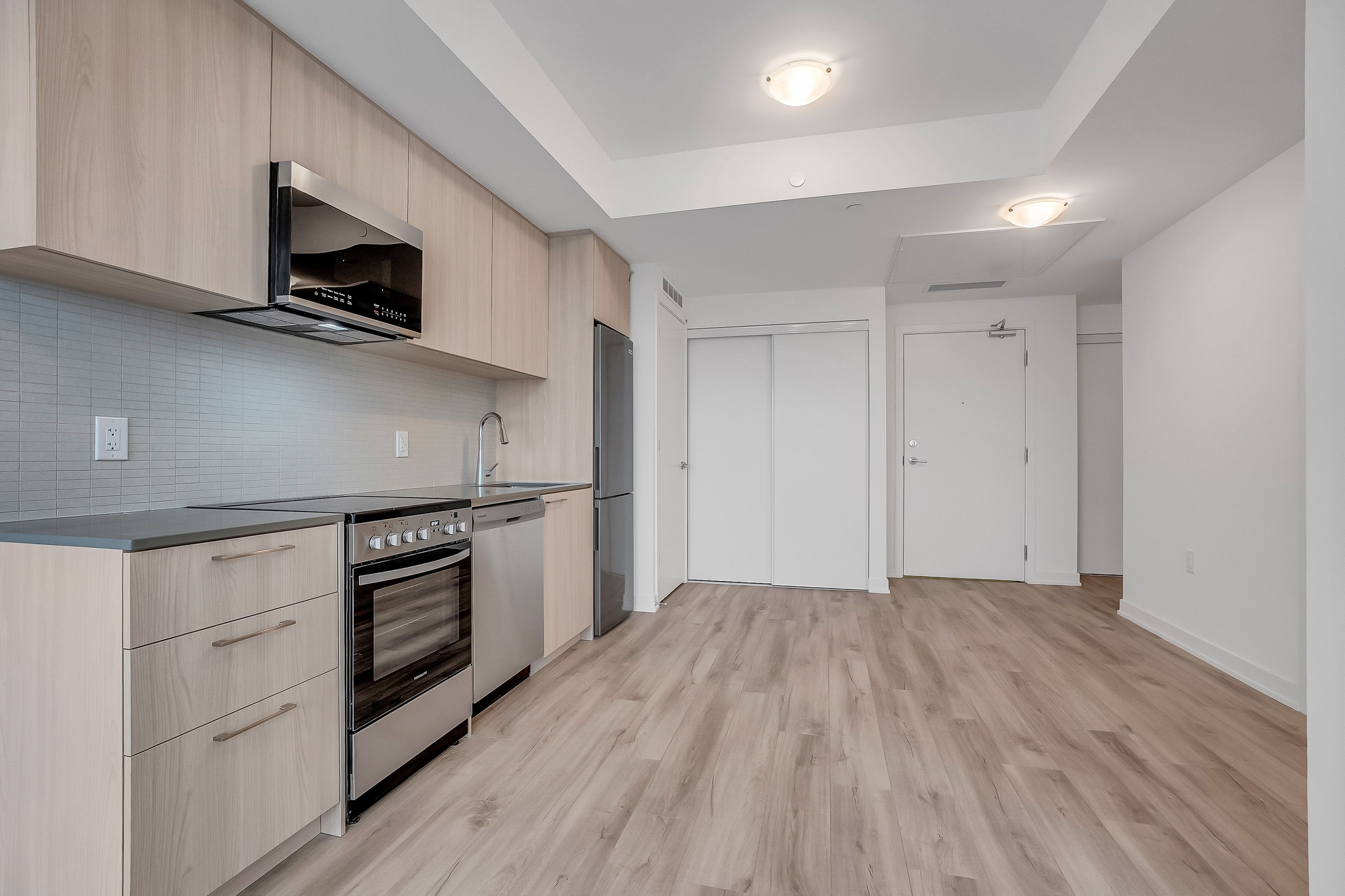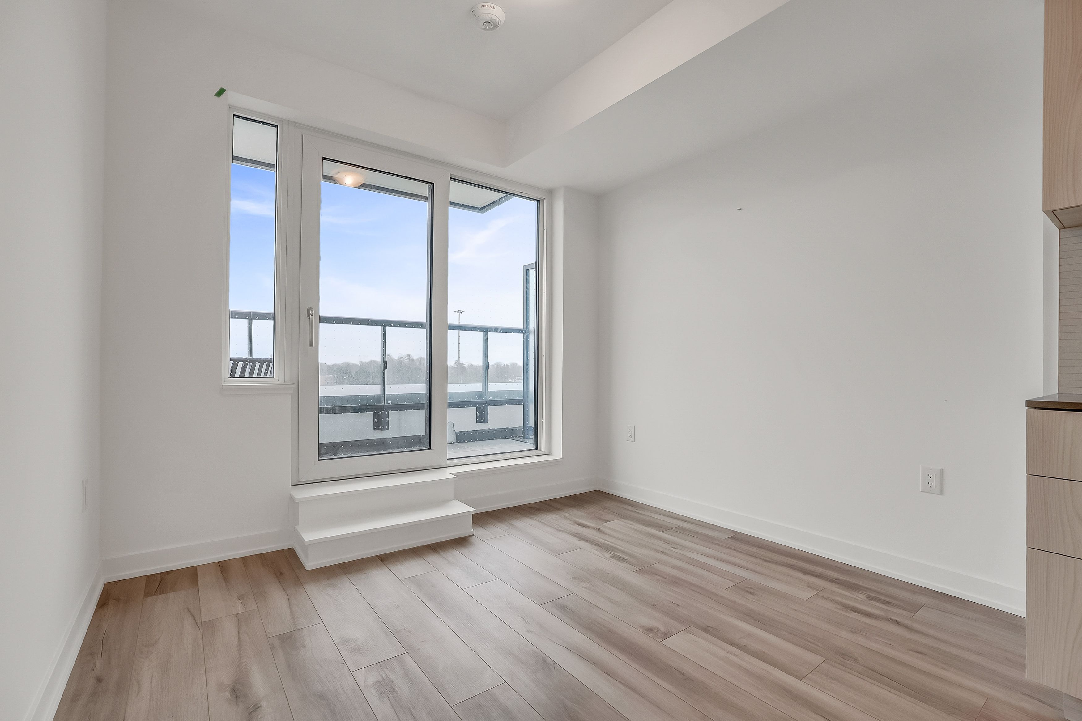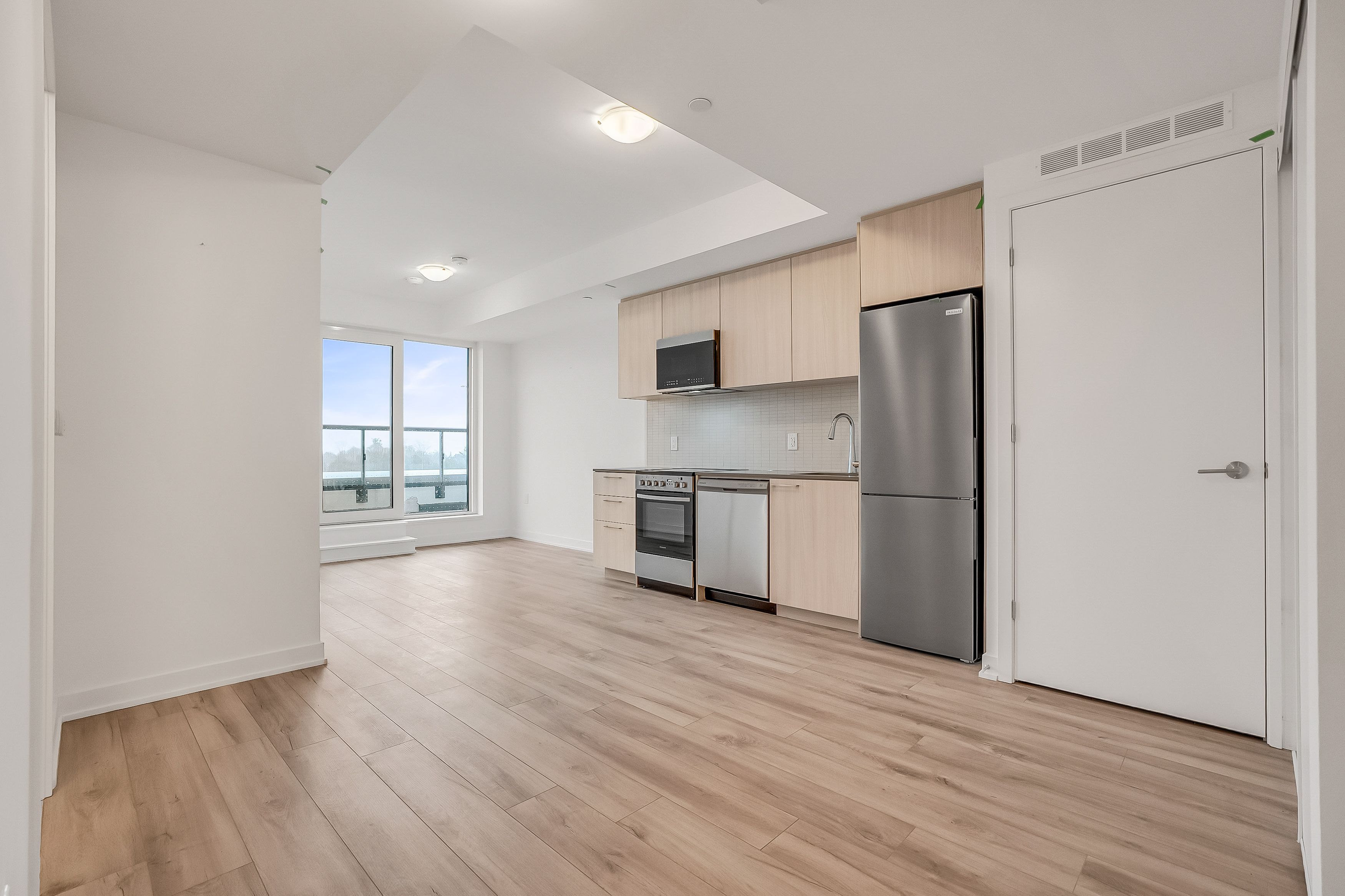 The narrative condos - bright and modern 1 bedroom + den condo in the heart of rouge. This thoughtfully designed suite features an open-concept living, dining, and kitchen area with wide plank laminate flooring and walk-out access to a private balcony. The contemporary kitchen is finished with a quartz countertop and brand-new stainless steel appliances. The bedroom offers a double closet, and access to a semi-ensuite bathroom complete with a custom vanity cabinet, oversized mirror, ceramic tile flooring, and tiled walls. Convenient en-suite laundry includes a premium front-load washer and dryer. Residents enjoy excellent building amenities, including concierge service, a party/meeting room, stylish co-working lounge, gym, yoga studio, games room, kids' playroom, and an outdoor terrace with seating and bbqs. Ideally located with quick access to highway 401, rouge hill go station, university of toronto scarborough, centennial college, rouge national urban park, port union waterfront, and the great lakes waterfront trail. Walking distance to tim hortons, mcdonald's, shoppers drug mart, and canadian tire. Includes 1 parking space.