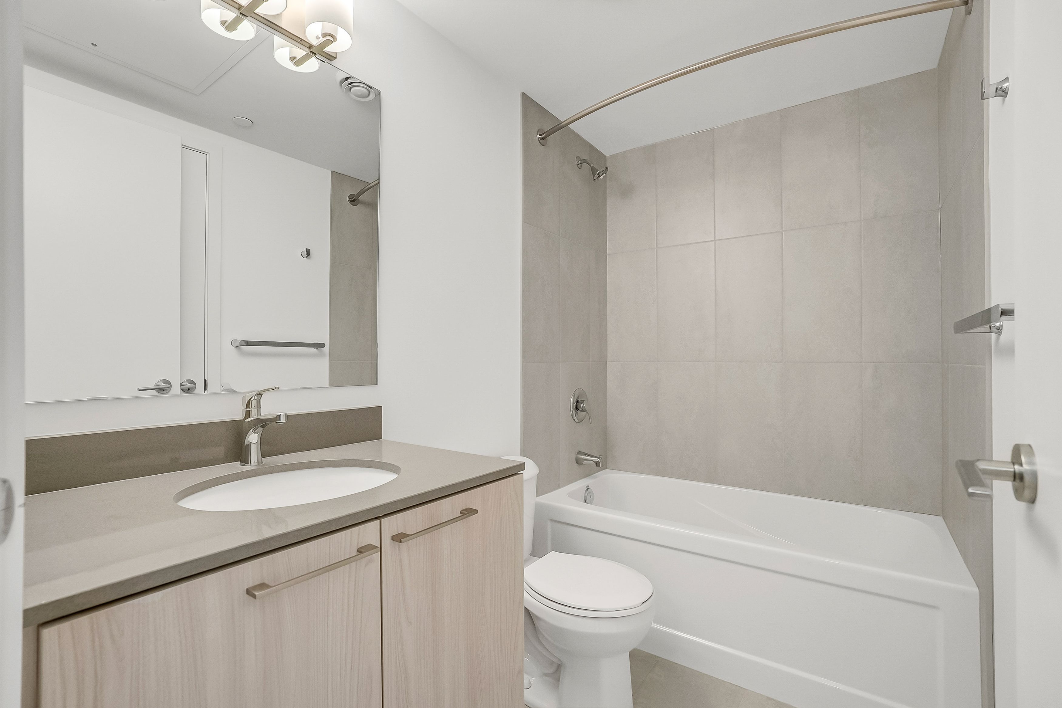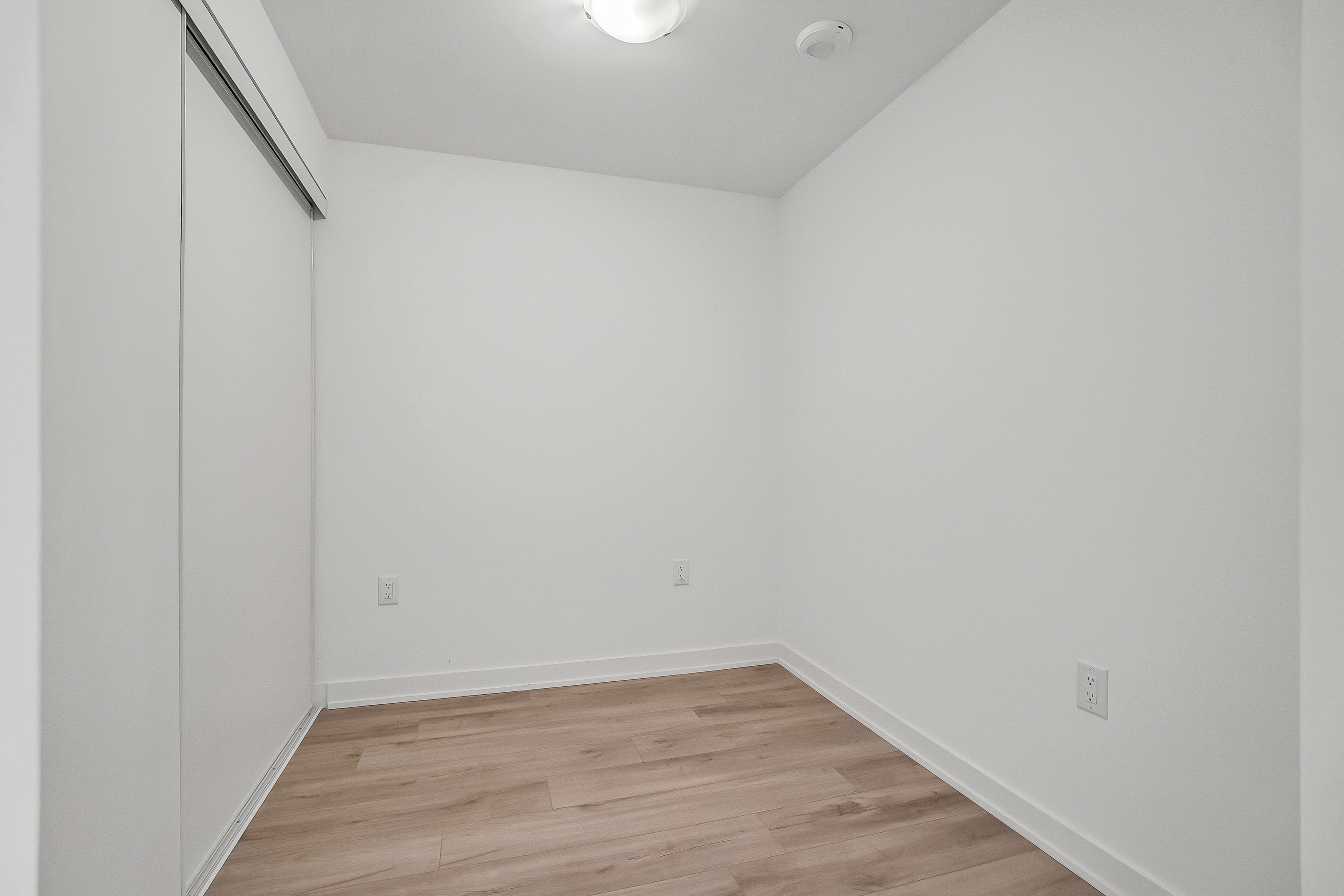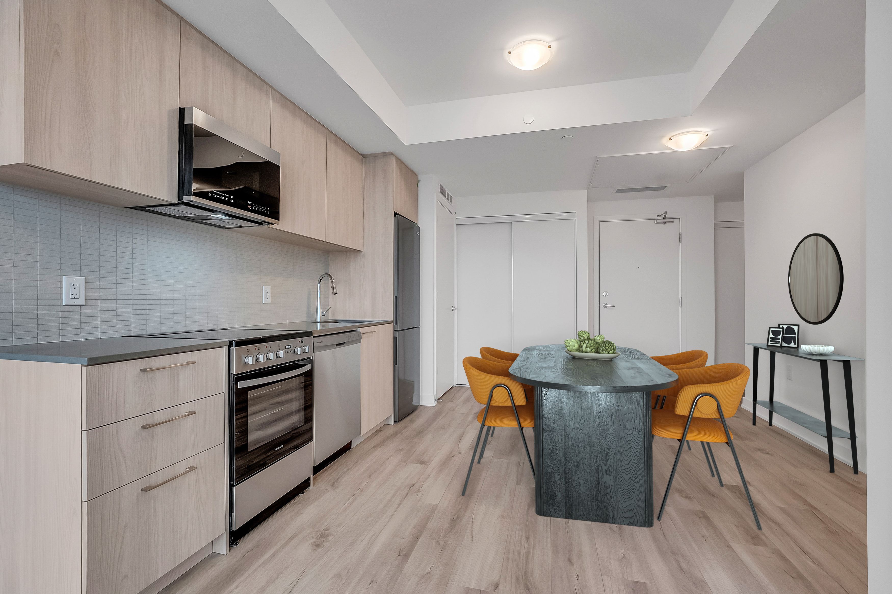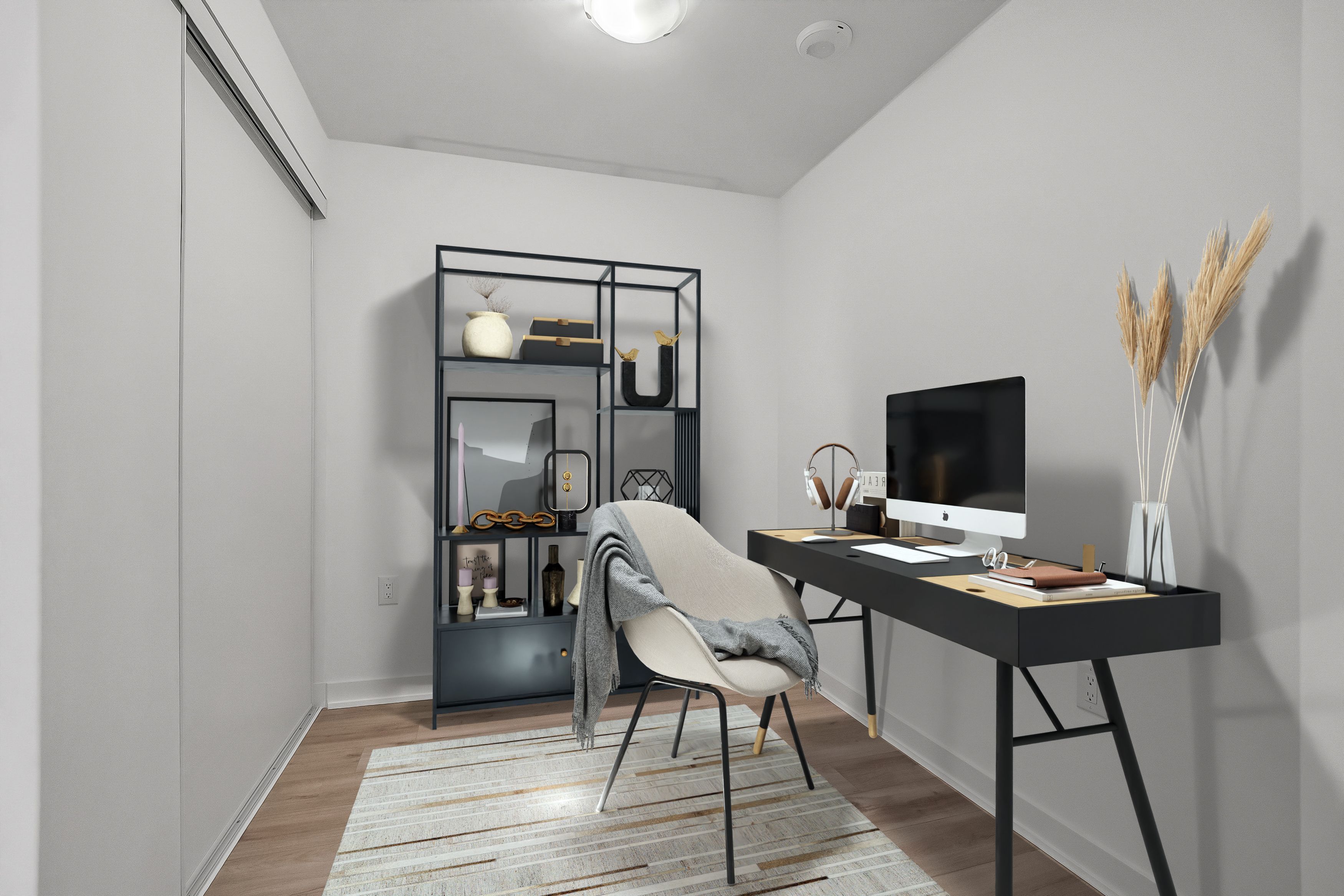 The narrative condos - bright and modern 1 bedroom + den condo in the heart of rouge. This thoughtfully designed suite features an open-concept living, dining, and kitchen area with wide plank laminate flooring and walk-out access to a private balcony. The contemporary kitchen is finished with a quartz countertop and brand-new stainless steel appliances. The bedroom offers a double closet, and access to a semi-ensuite bathroom complete with a custom vanity cabinet, oversized mirror, ceramic tile flooring, and tiled walls. Convenient en-suite laundry includes a premium front-load washer and dryer. Residents enjoy excellent building amenities, including concierge service, a party/meeting room, stylish co-working lounge, gym, yoga studio, games room, kids' playroom, and an outdoor terrace with seating and bbqs. Ideally located with quick access to highway 401, rouge hill go station, university of toronto scarborough, centennial college, rouge national urban park, port union waterfront, and the great lakes waterfront trail. Walking distance to tim hortons, mcdonald's, shoppers drug mart, and canadian tire. Includes 1 parking space.