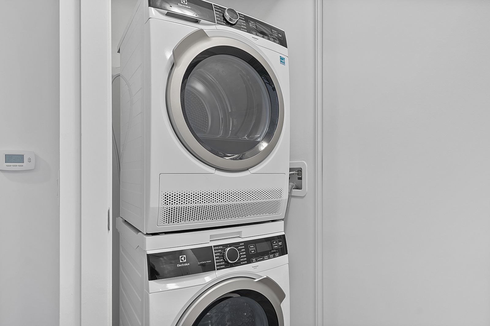 • Modern kitchen features quartz counters and sleek cabinetry.