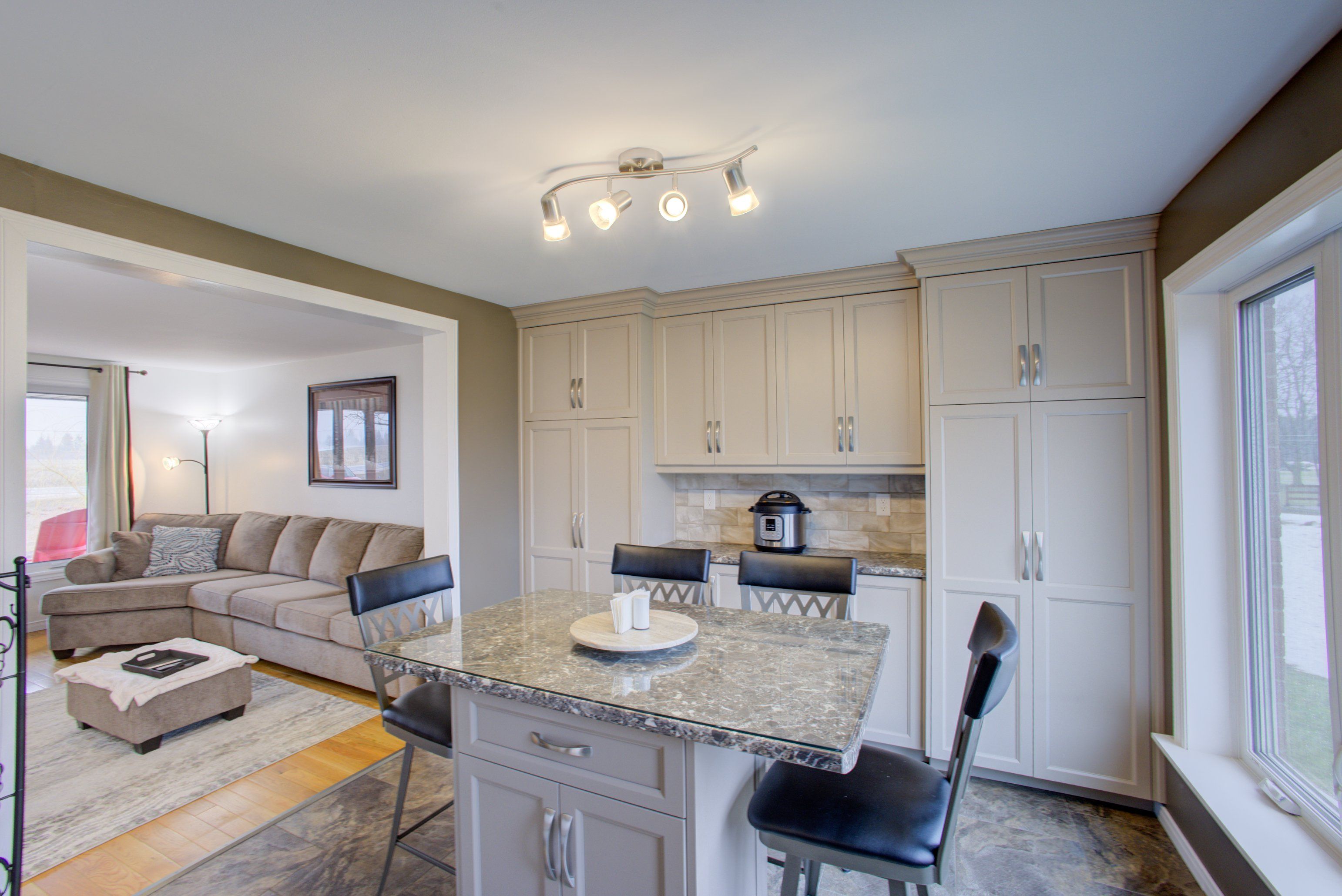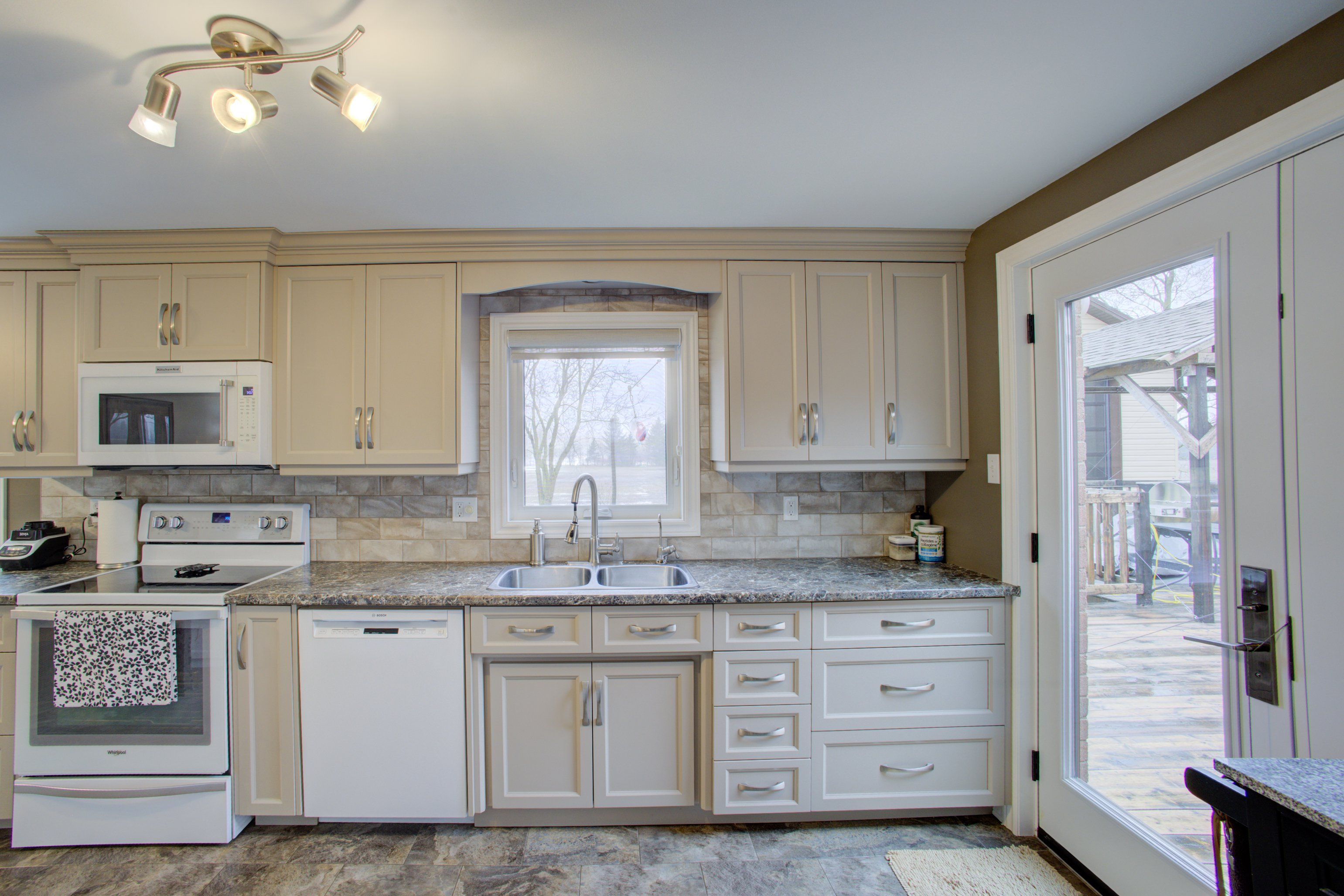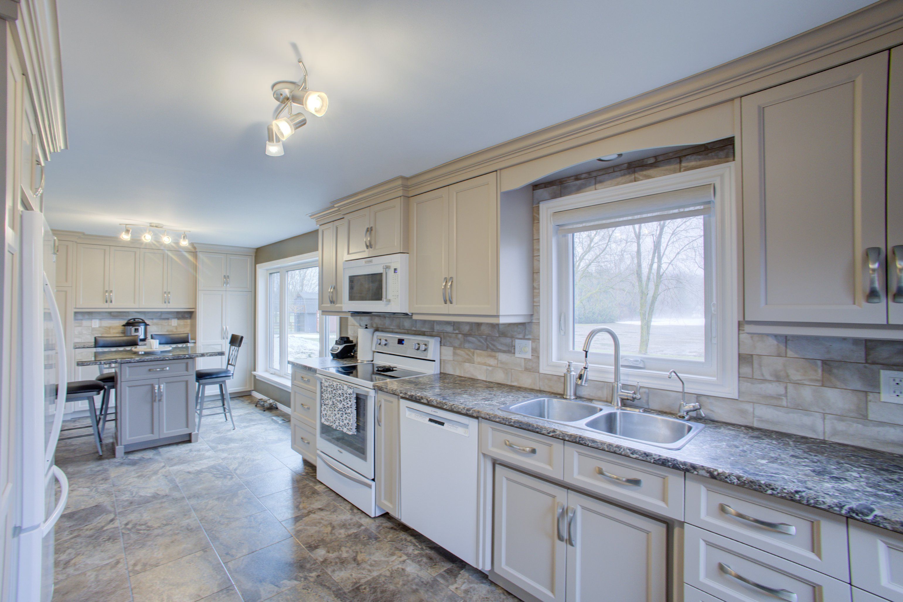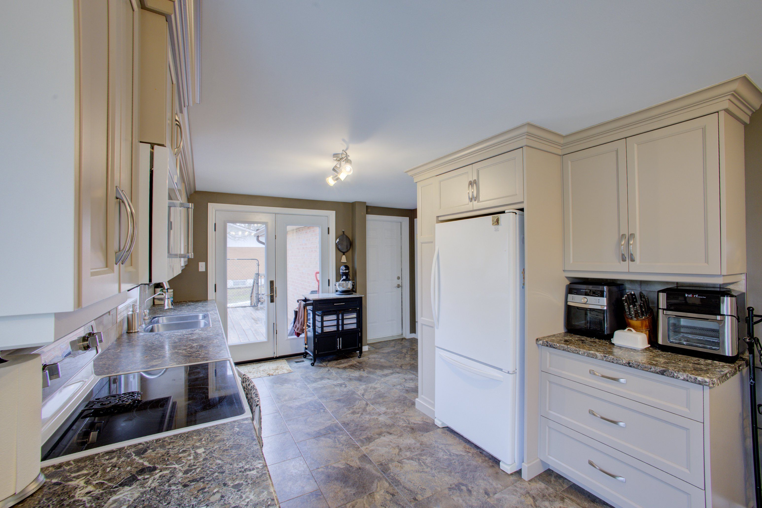 • Spacious eat-in kitchen with newer cupboards and ceramic flooring.