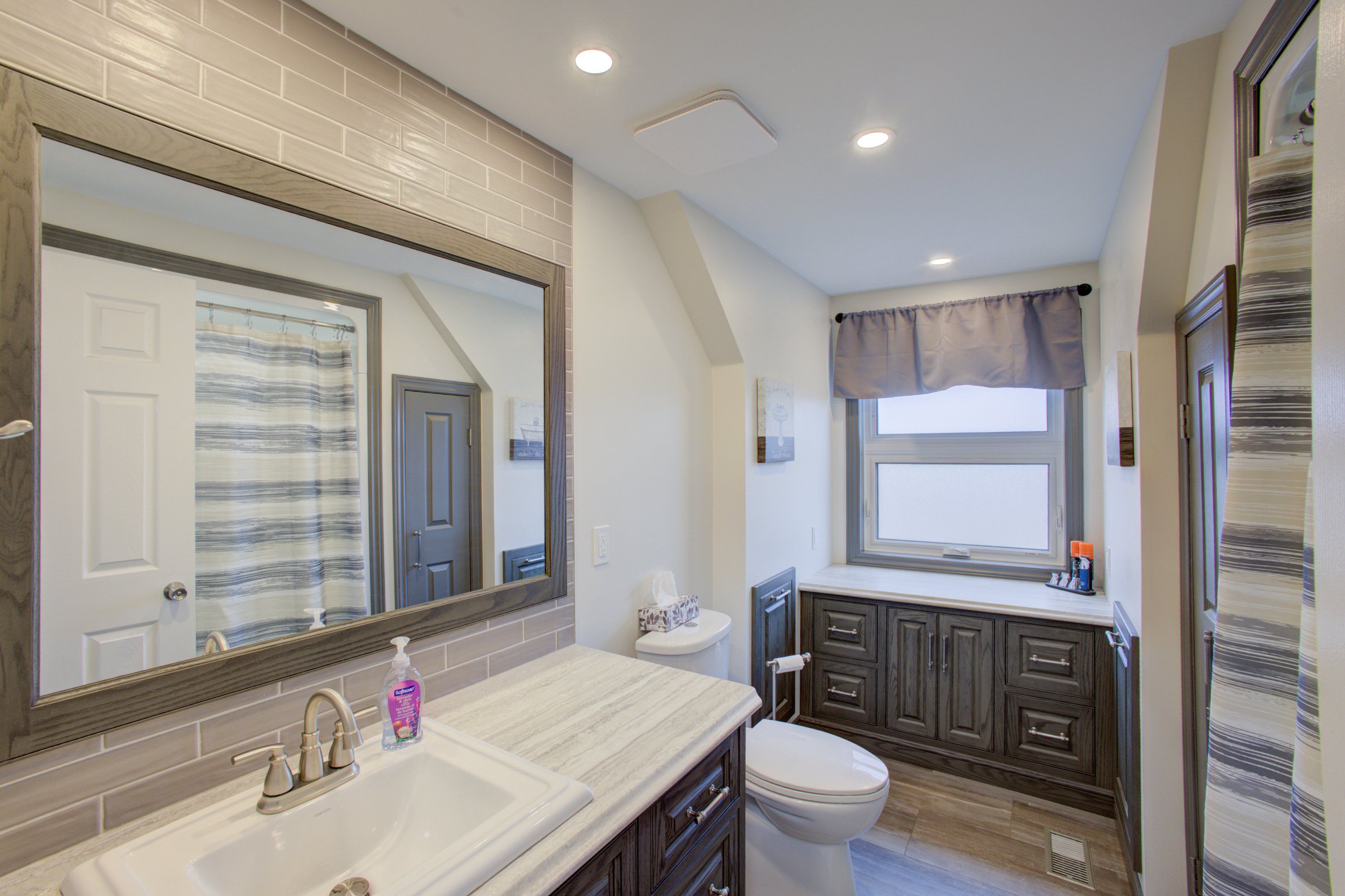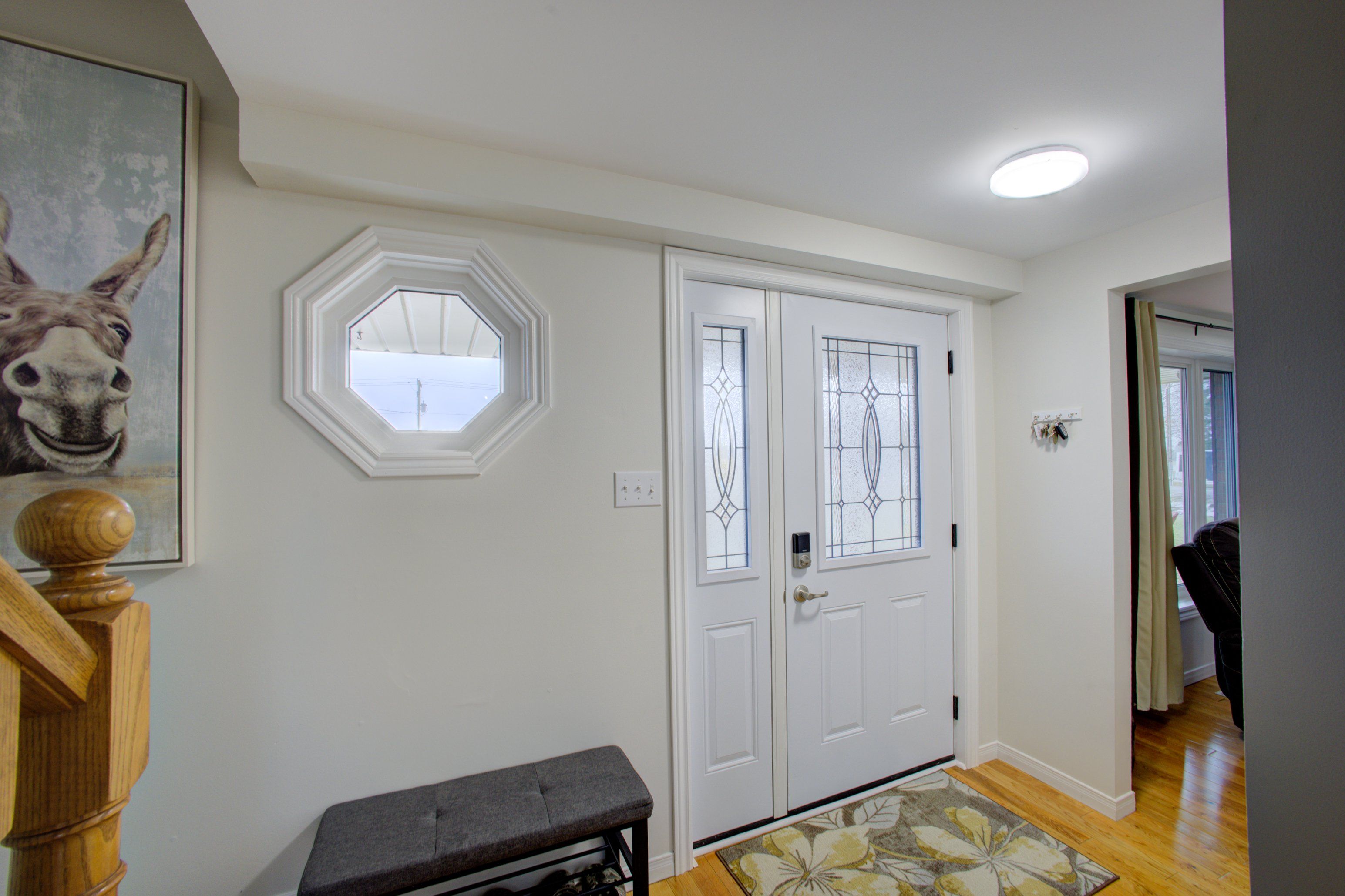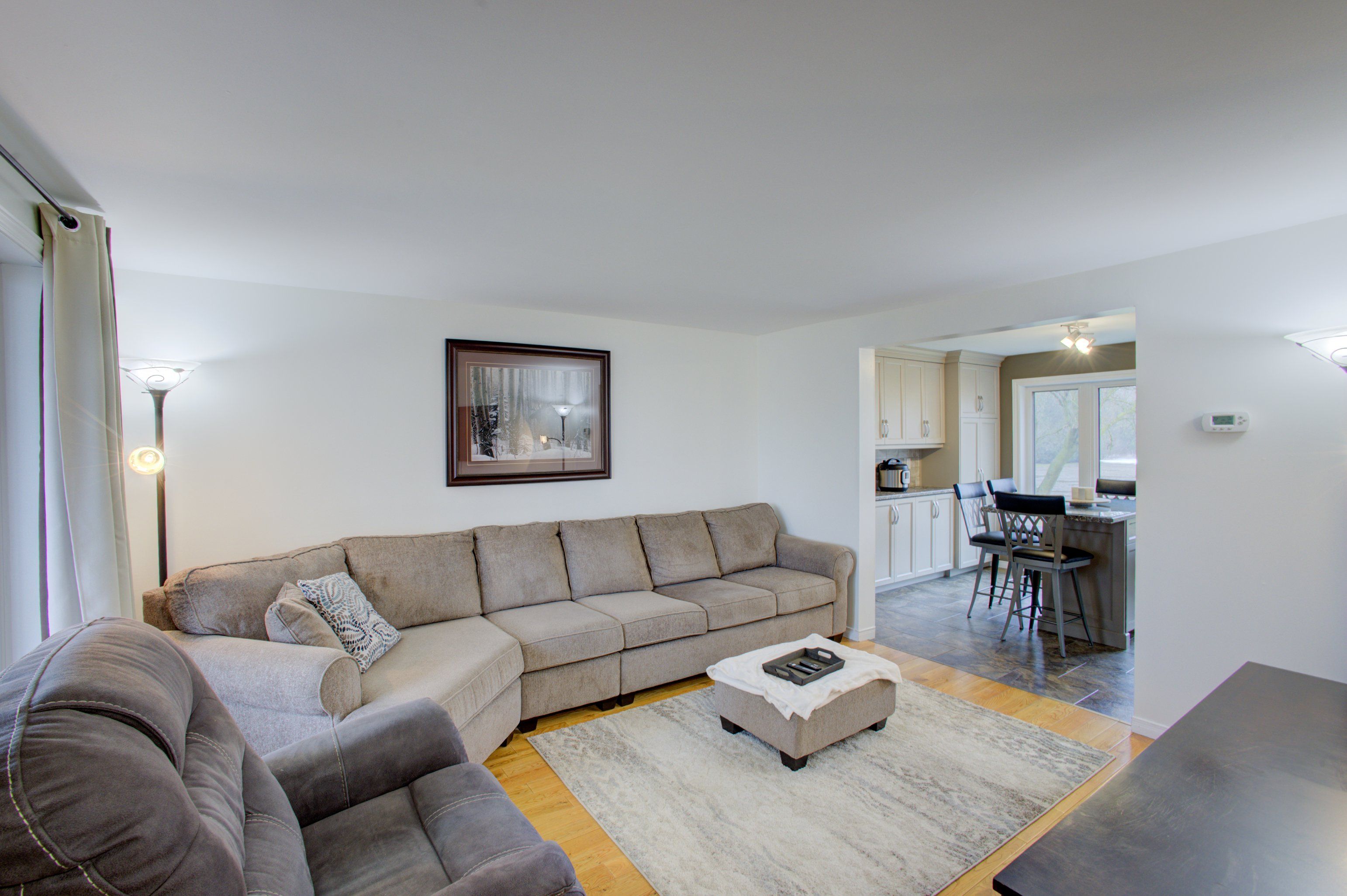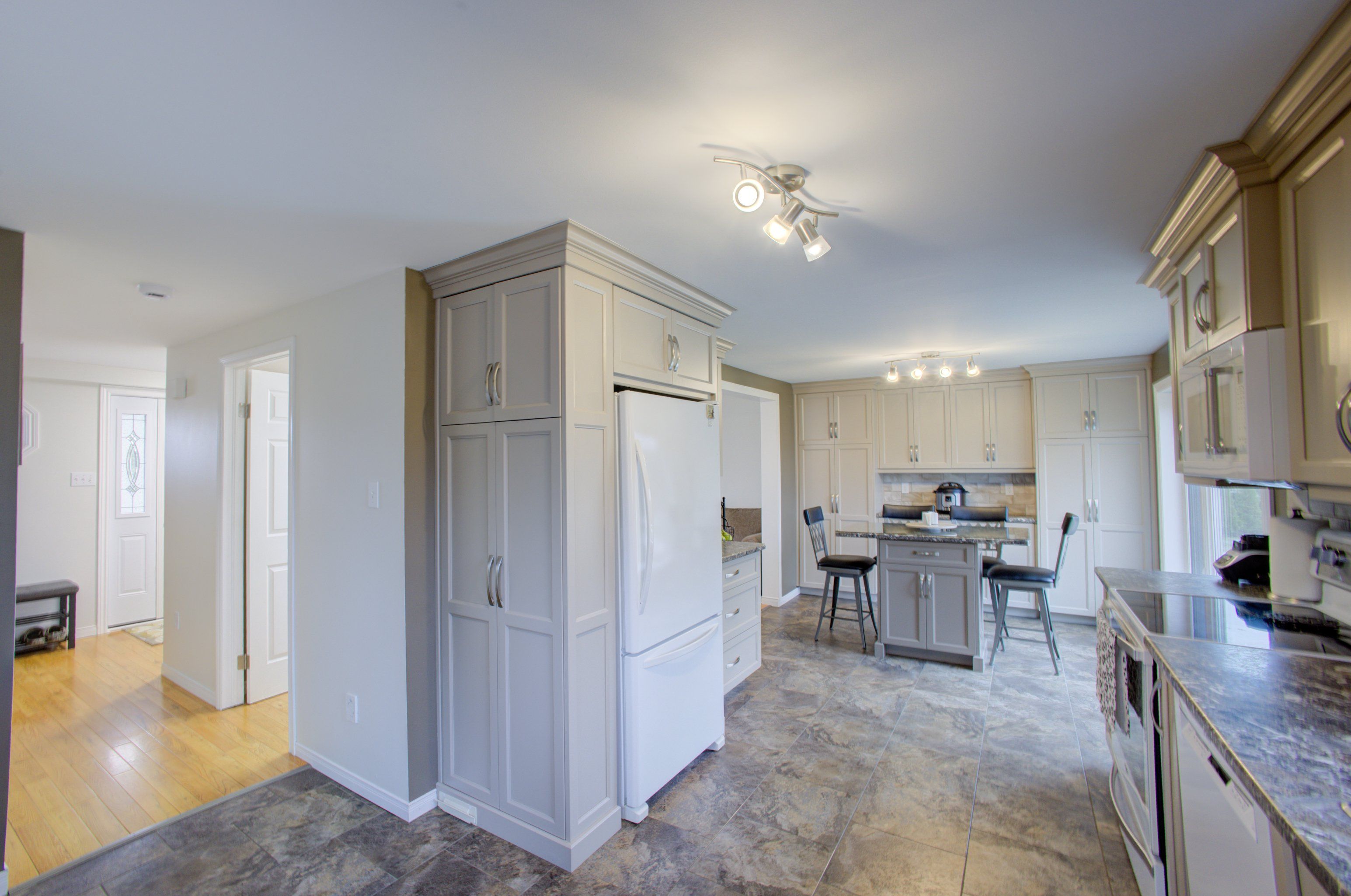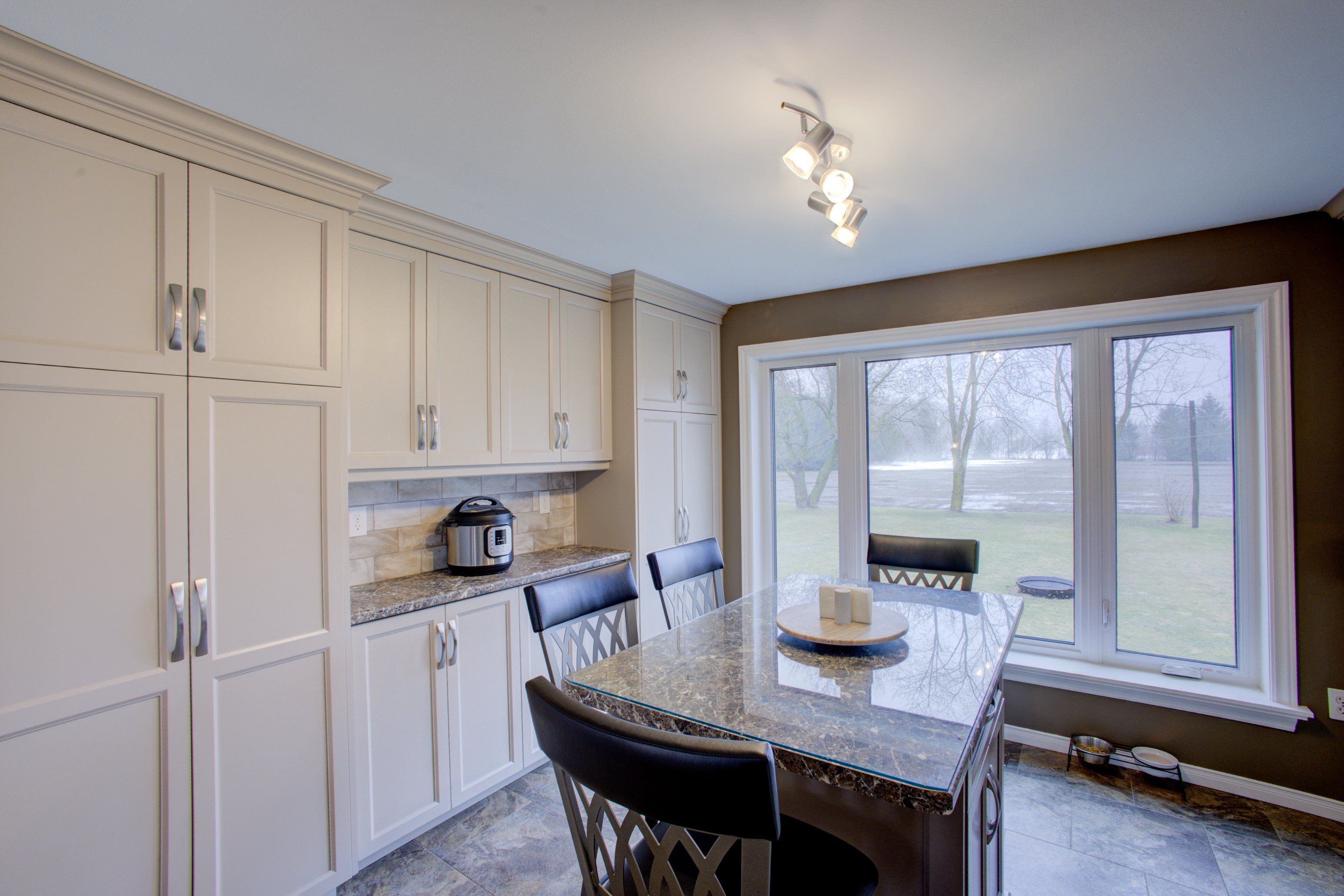 • Spacious eat-in kitchen with newer cupboards and ceramic flooring.