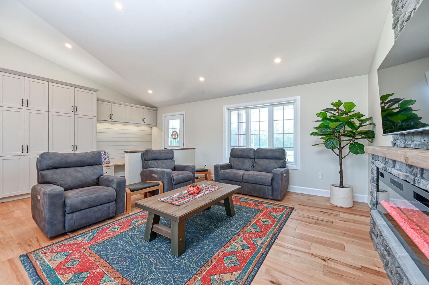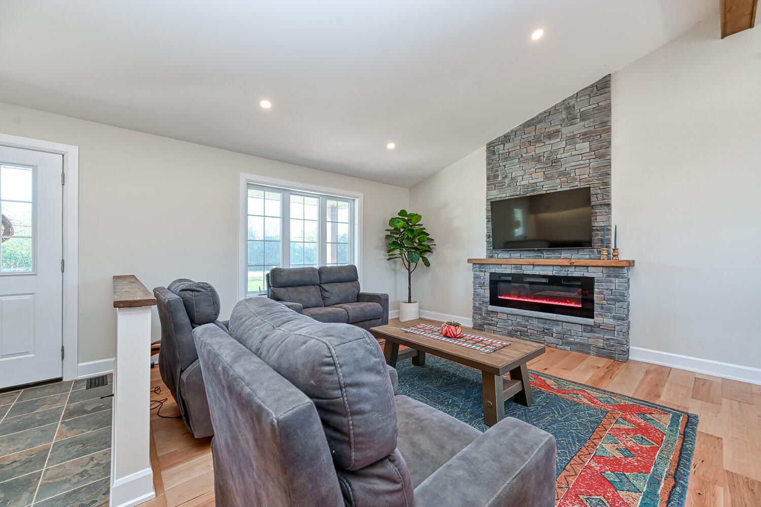 • Bright open-concept layout with electric fireplace and quartz countertops.